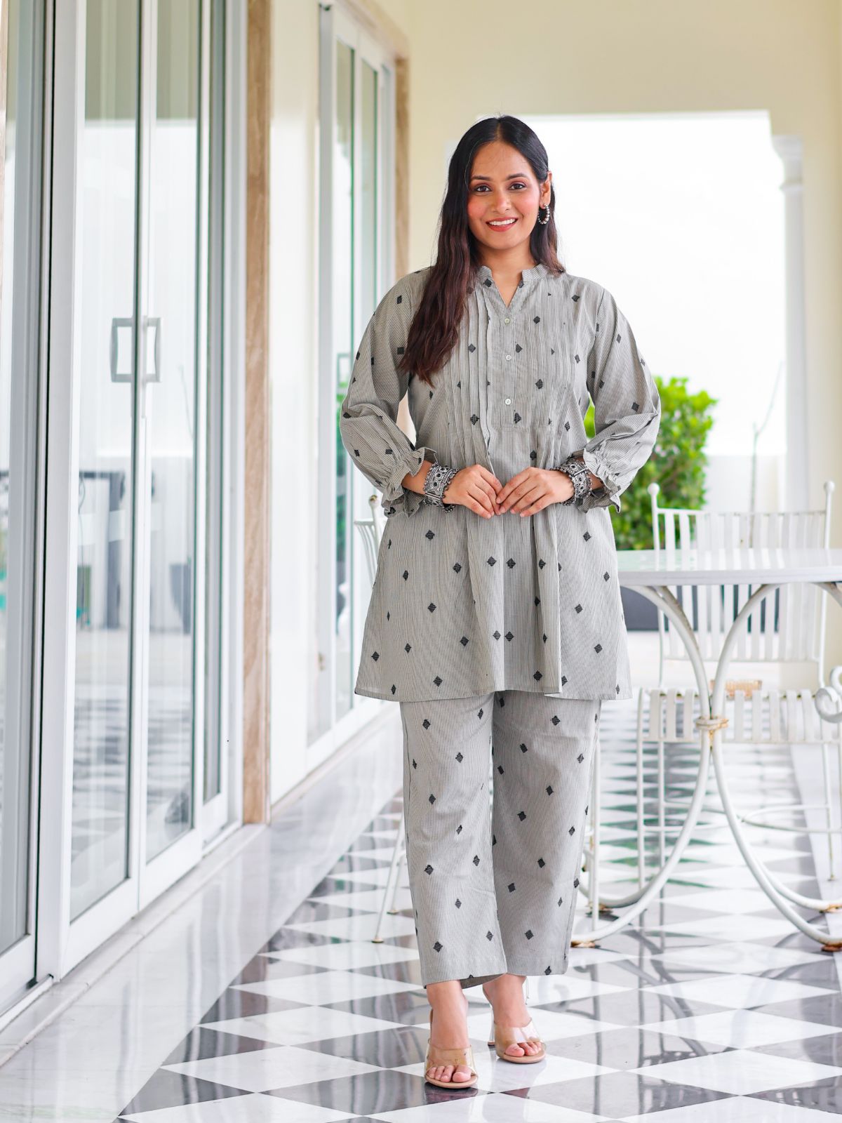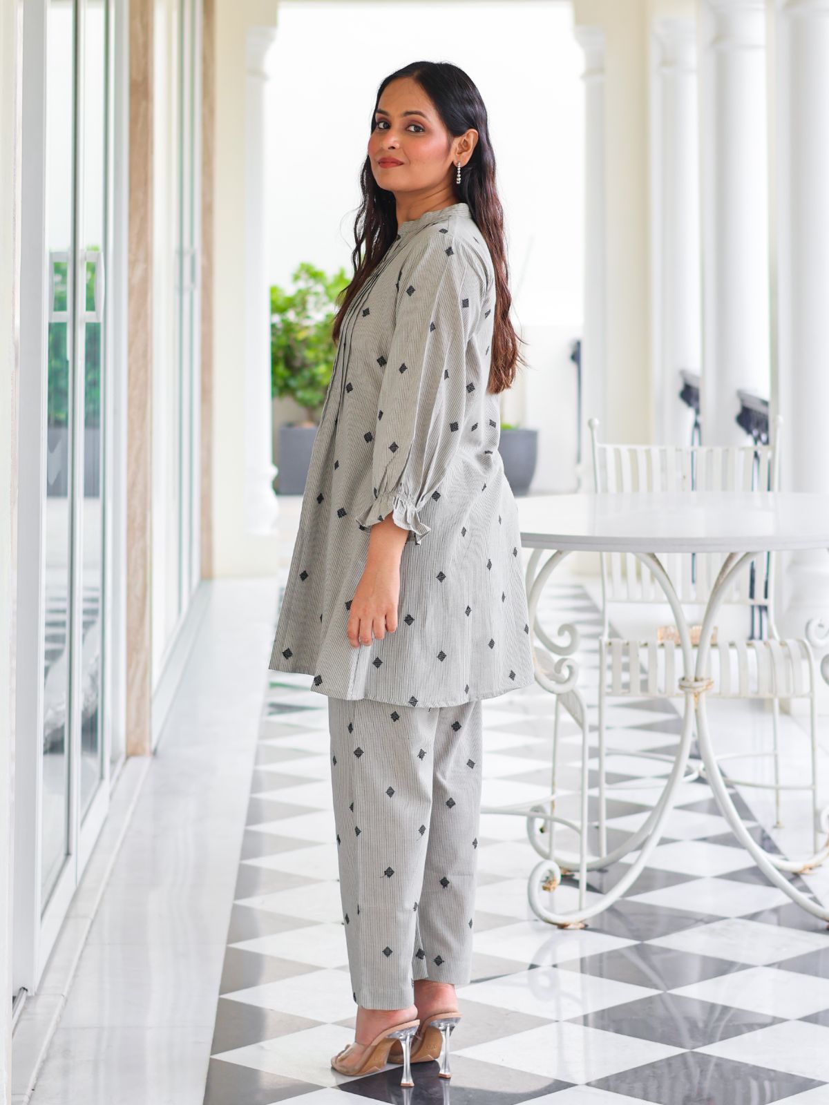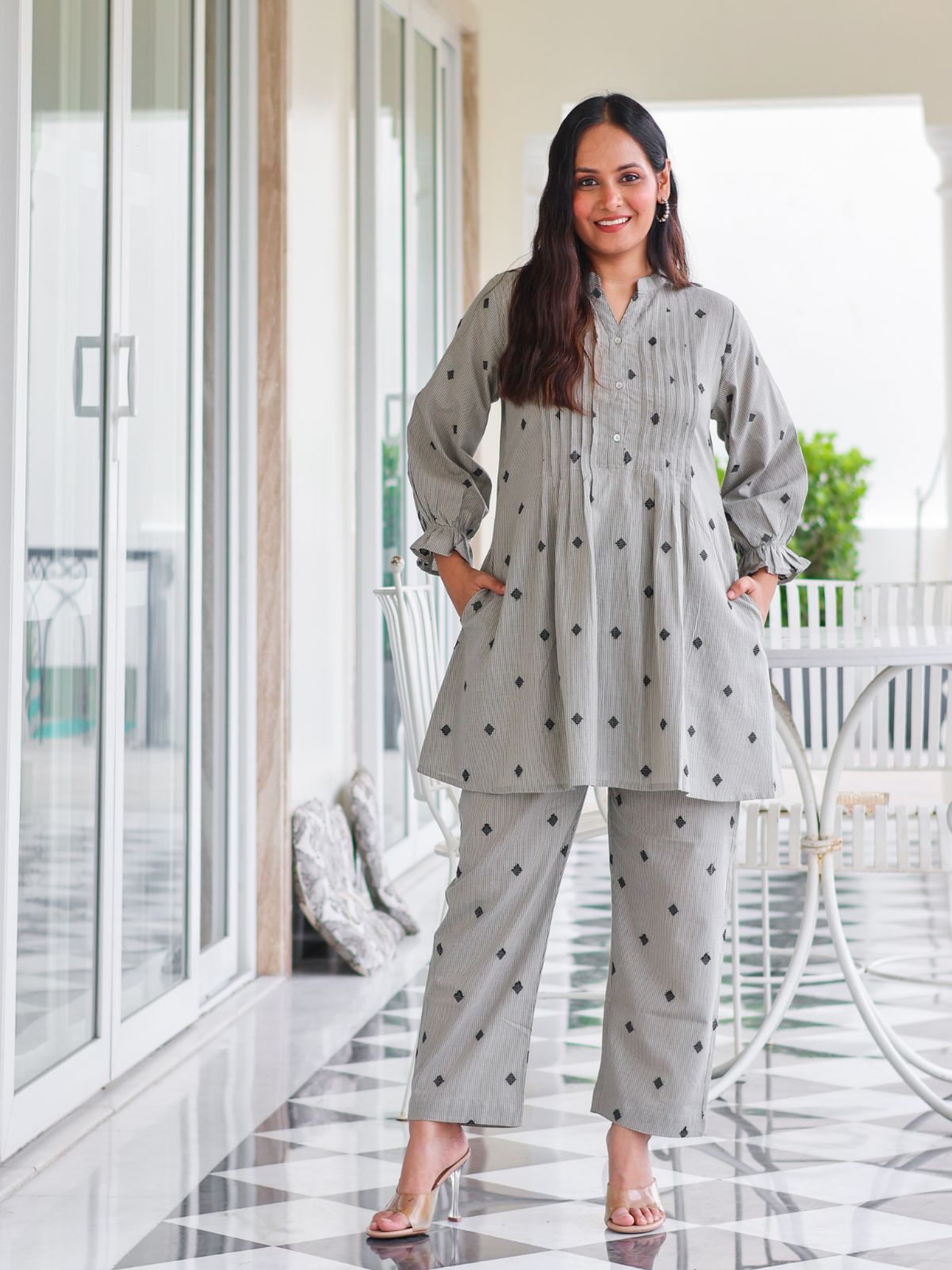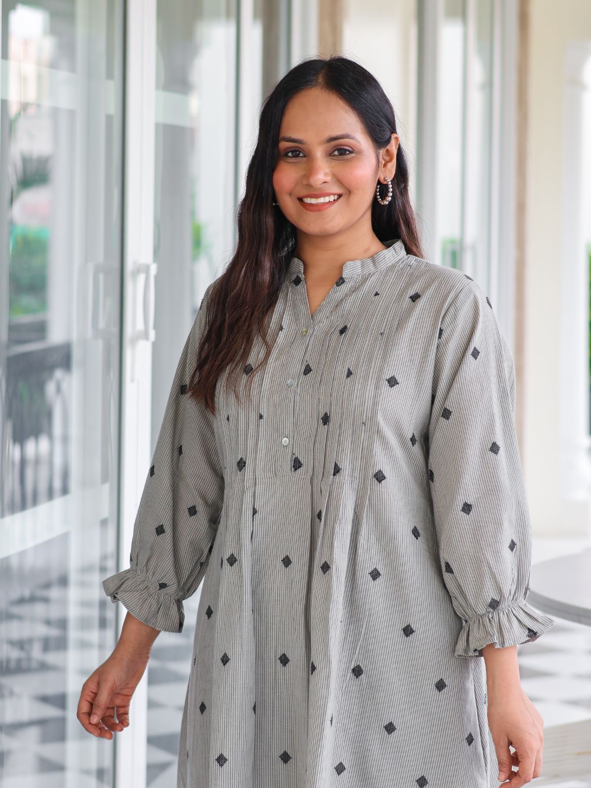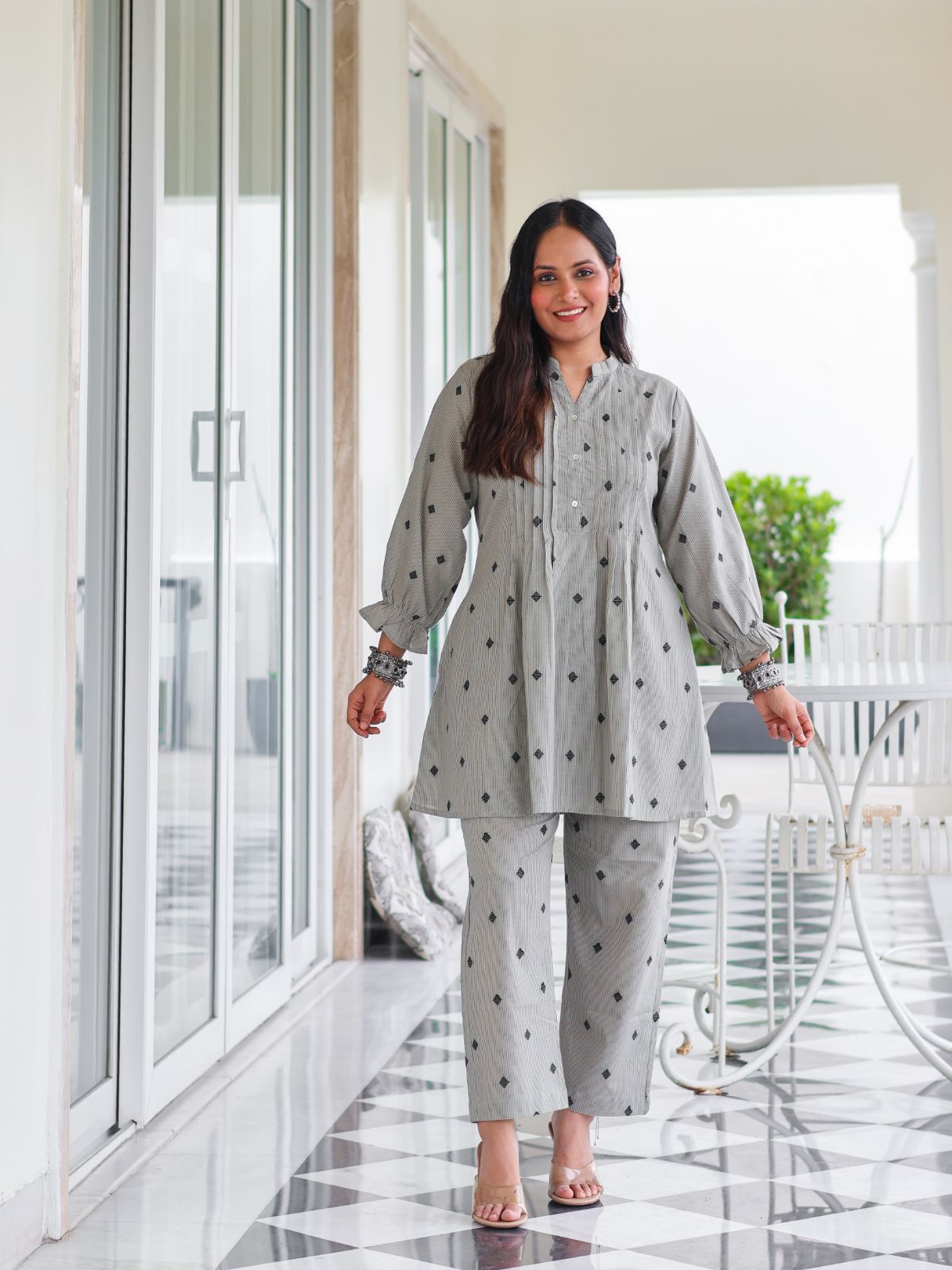 Cut in pure cotton yarn dyed fabric, it features an A-line kurta with pintucks detail, mandarin collar, puff sleeves elasticated with frills, buttoned placket and side pockets. The pants are a relaxed fit for ultimate comfort. Comfortable enough for everyday wear, polished enough for formal looks - it’s a wardrobe investment you’ll keep coming back to. The kurta set is stitched by our skilled artisans in Jaipur.