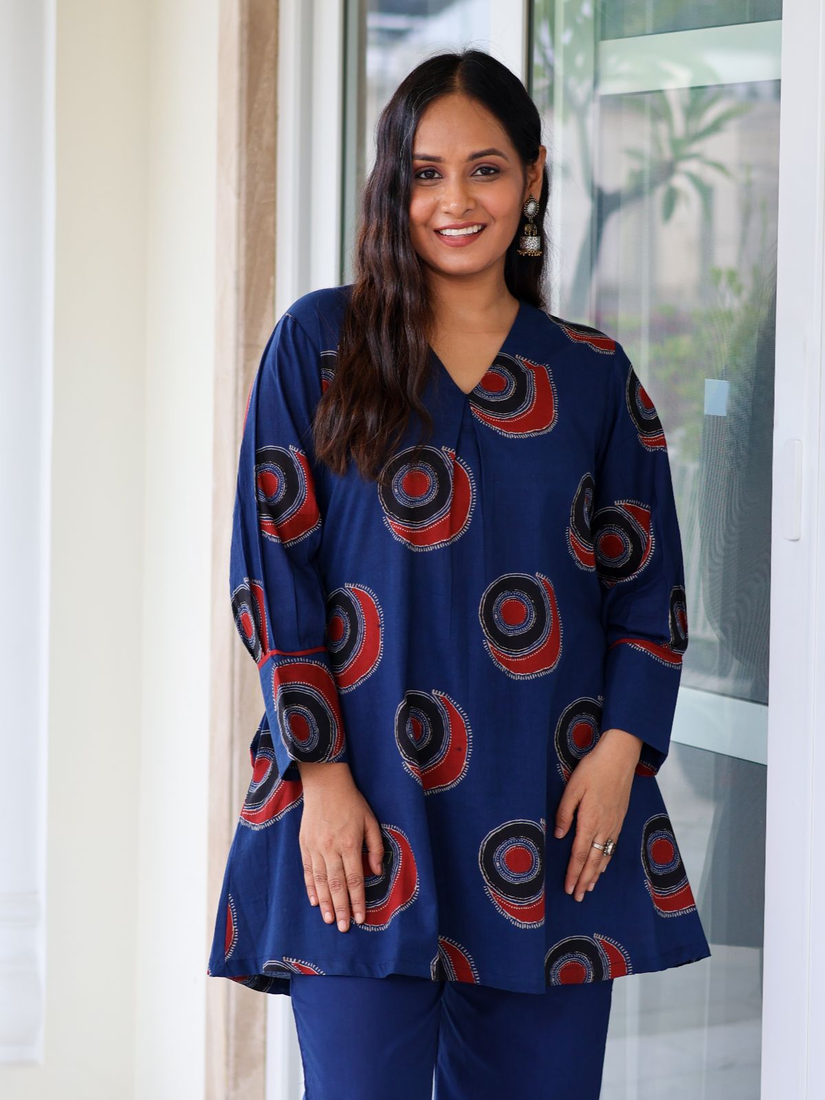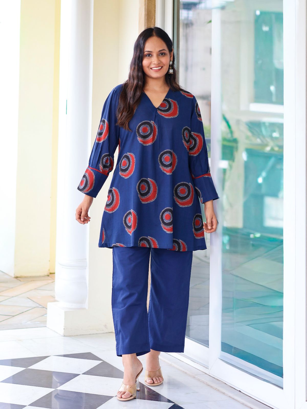 Cut in pure cotton fabric, it features a V-neckline, full sleeves cinched with wide cuffs and contrast piping. The A-line fit and side pockets makes it super comfortable. The pants are a relaxed fit for ultimate comfort. Some days you need an outfit that works everywhere - this blue kurta set does exactly that. The kurta set is stitched by our skilled artisans in Jaipur.