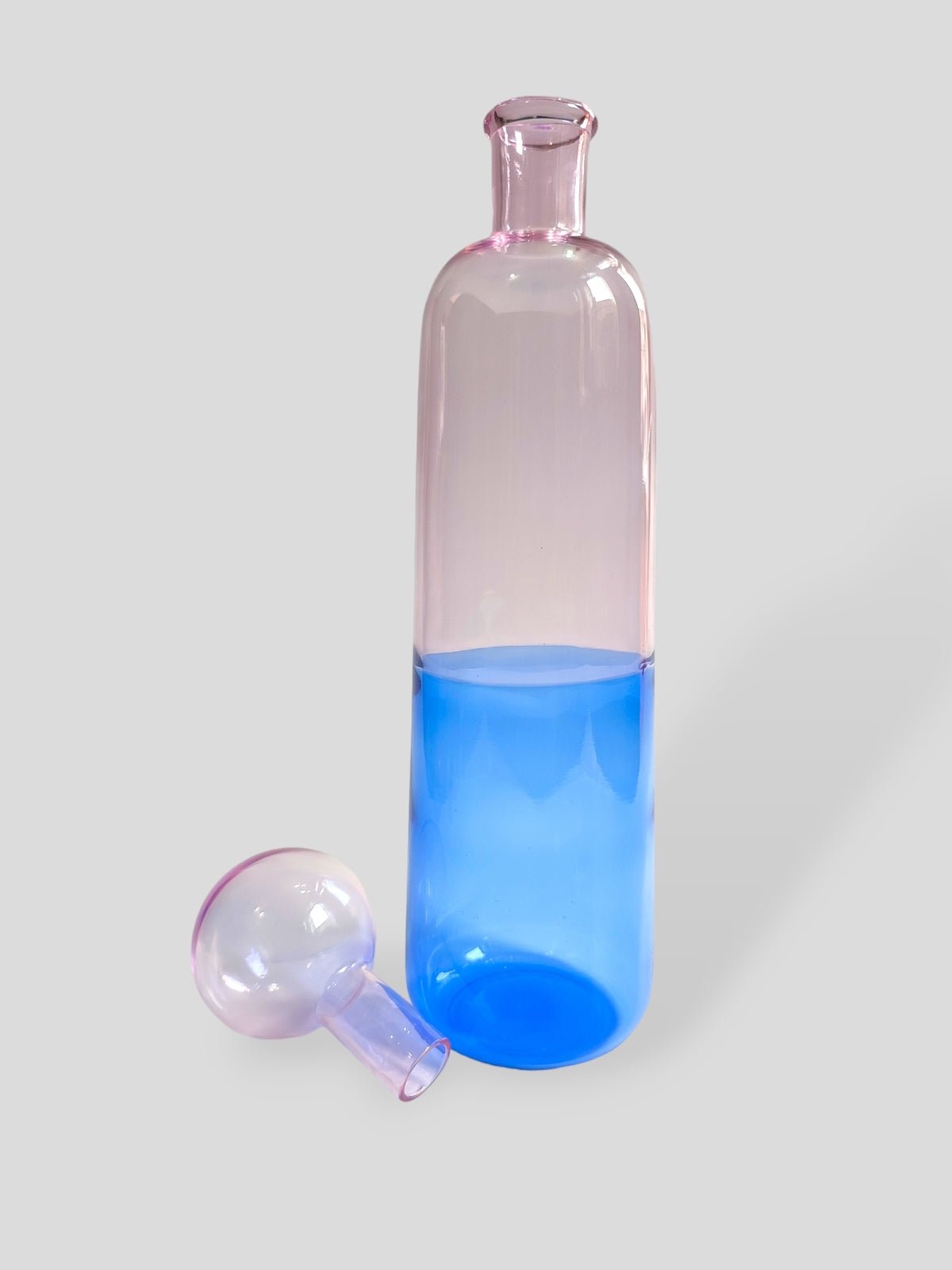 This elegant glass bottle is handcrafted by skilled artisans in Firozabad using borosilicate glass. The soft pink top and bright blue base create a beautiful two-tone effect. With its round stopper and sleek shape, it's perfect for storing water, juices, or simply adding color to your table or shelf.