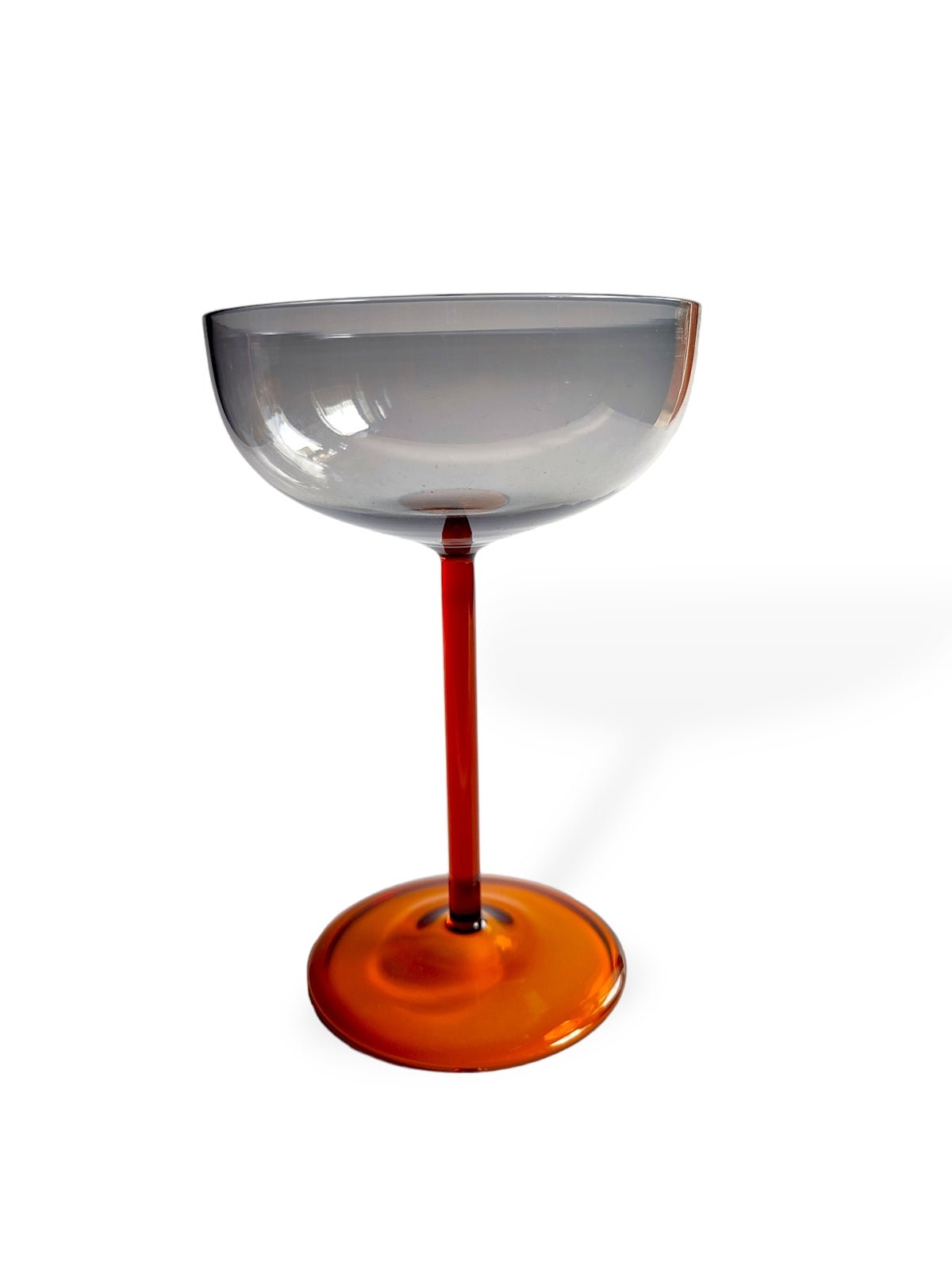 A set of two elegant margarita glasses with a smoky grey bowl and amber stem. Handcrafted using borosilicate glass, their wide bowl and tall stem design make them perfect for margaritas, mocktails, or special cocktails at home.