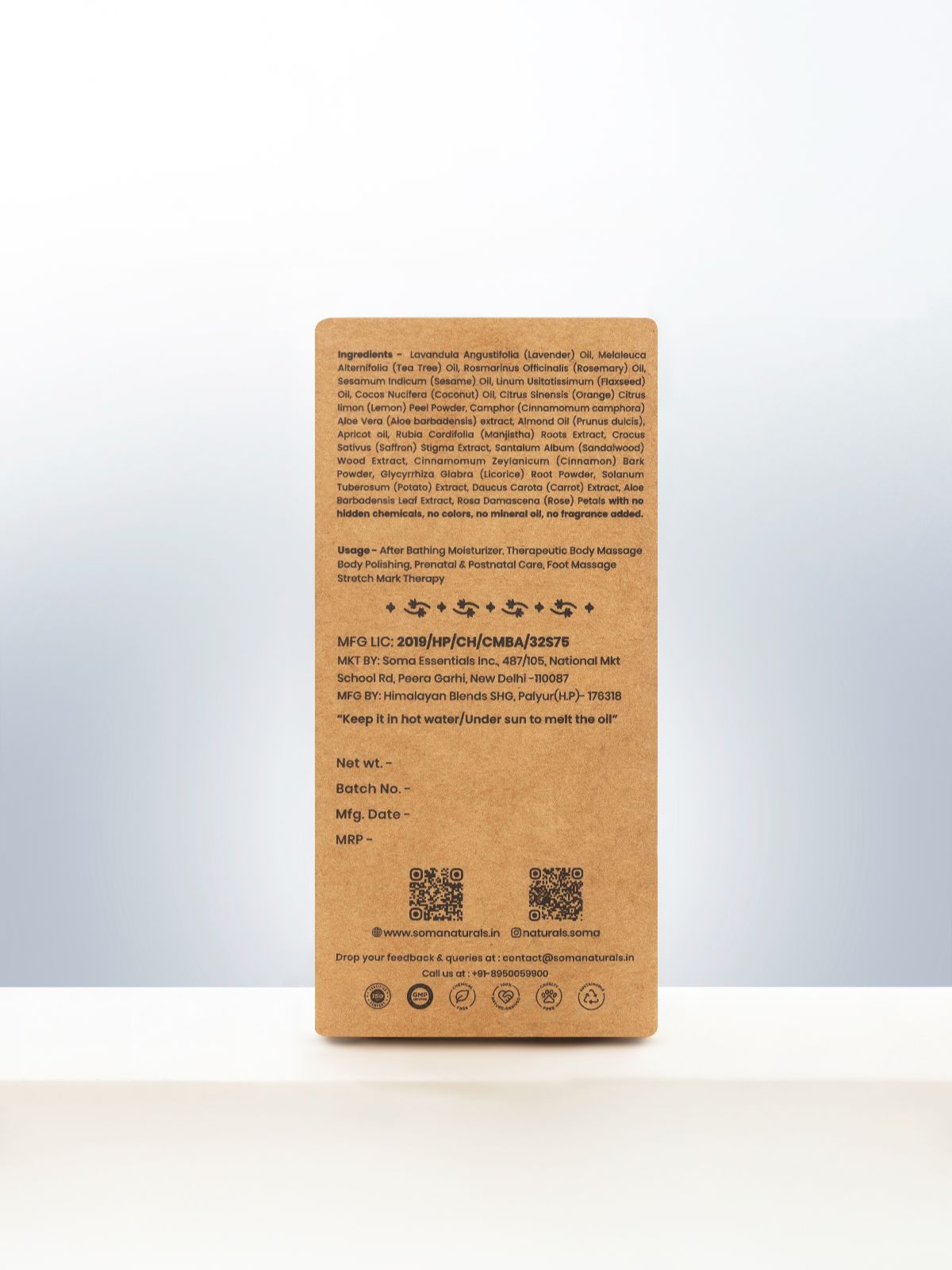 - Key Ingredients : Cocos Nucifera (Coconut) Oil, Citrus Sinensis (Orange) Citrus limon (Lemon)Peel Powder, Camphor (Cinnamomum camphora) Aloe Vera (Aloe barbadensis) extract, Almond Oil (Prunus dulcis), Apricot oil, Rubia Cordifolia (Manjistha) Root Extract, Crocus Sativus (Saffron) Stigma Extract, Santalum Album (Sandalwood) Wood Extract, Cinnamomum Zeylanicum (Cinnamon) Bark Powder, Glycyrrhiza Glabra (Licorice) Root Powder, Solanum Tuberosum (Potato) Extract, Daucus Carota (Carrot) Extract, Aloe Barbadensis Leaf Extract, Rosa Damascena (Rose) Petals, Lavandula Angustifolia (Lavender) Oil, Melaleuca Alternifolia (Tea Tree) Oil, Rosmarinus Officinalis (Rosemary) Oil, Sesamum Indicum (Sesame) Oil, Linum Usitatissimum (Flaxseed) Oil with no hidden chemicals