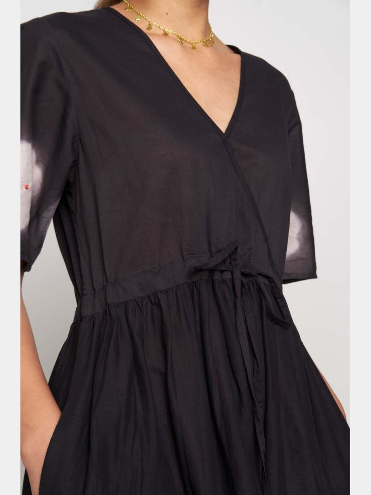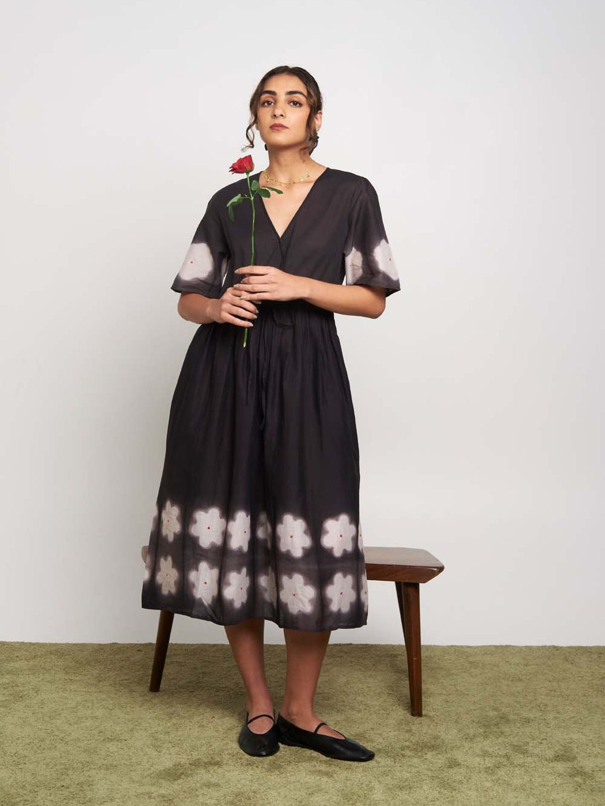 Designed with a drawstring waist, wrap style, and a neck snap closure for comfort, this garment features a deep charcoal hue achieved naturally using myrobalan and iron. The flower motif is created through clamp dyeing and subtle hand embroidery.