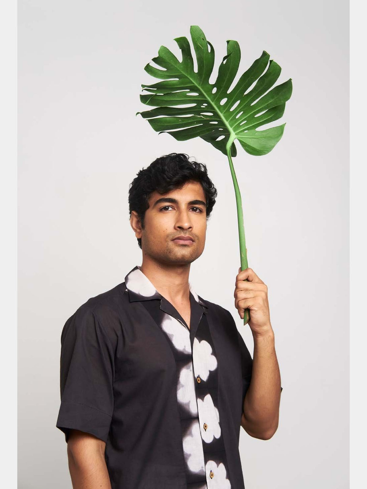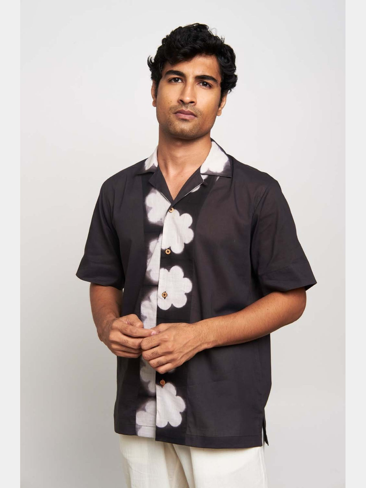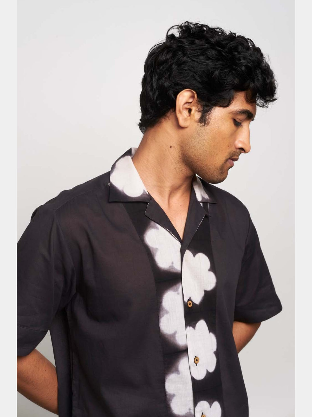The Patchwork Clamp Shirt is crafted from certified lightweight organic cotton, featuring a unique patchwork design for a one-of-a-kind look. The deep charcoal hue is naturally achieved using iron and myrobalan, enhancing its distinctive style.