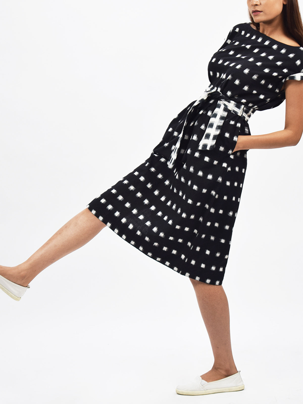 Who doesn’t love a dress that can be styled for every occasion? A reversible belt to cinch the waist and a side slit for easy movement, oh did we mention it’s made in handloom ikat?