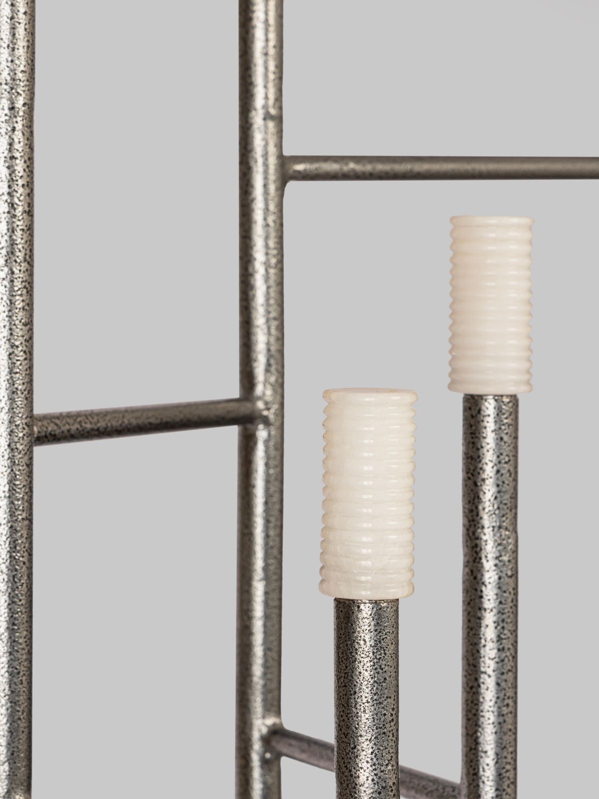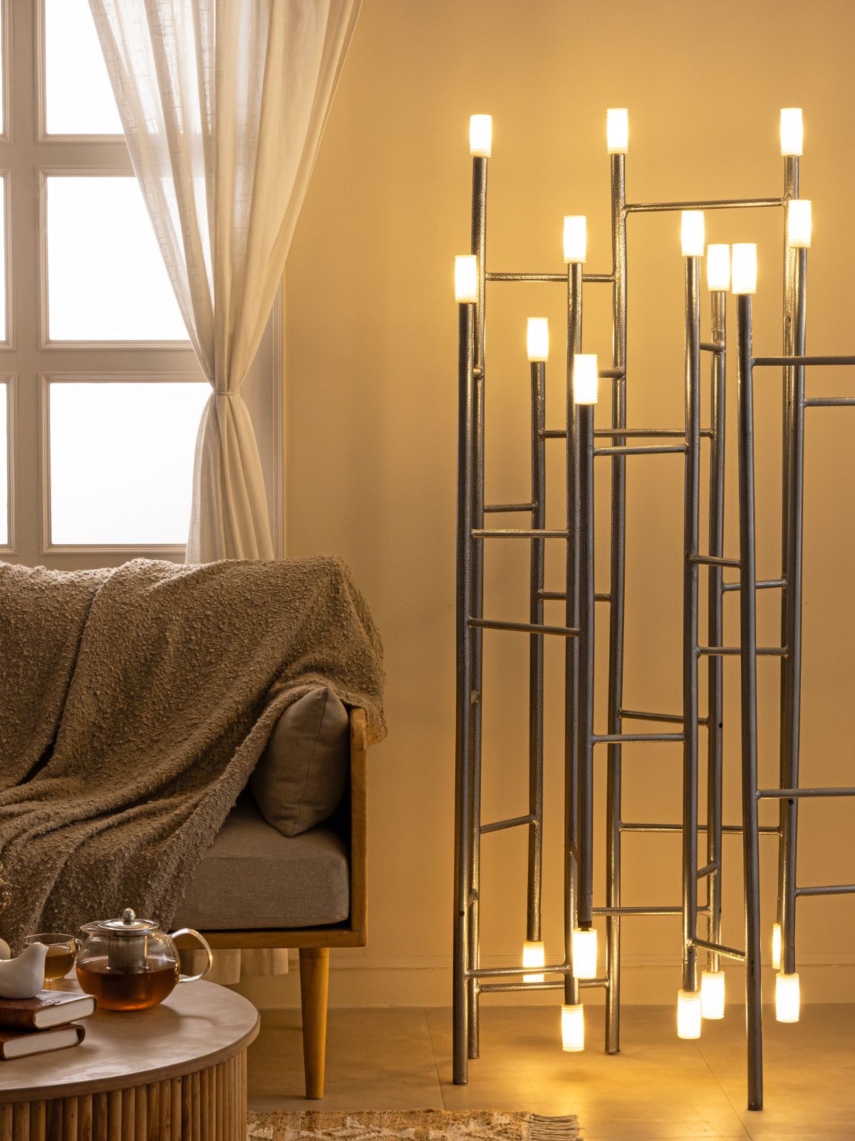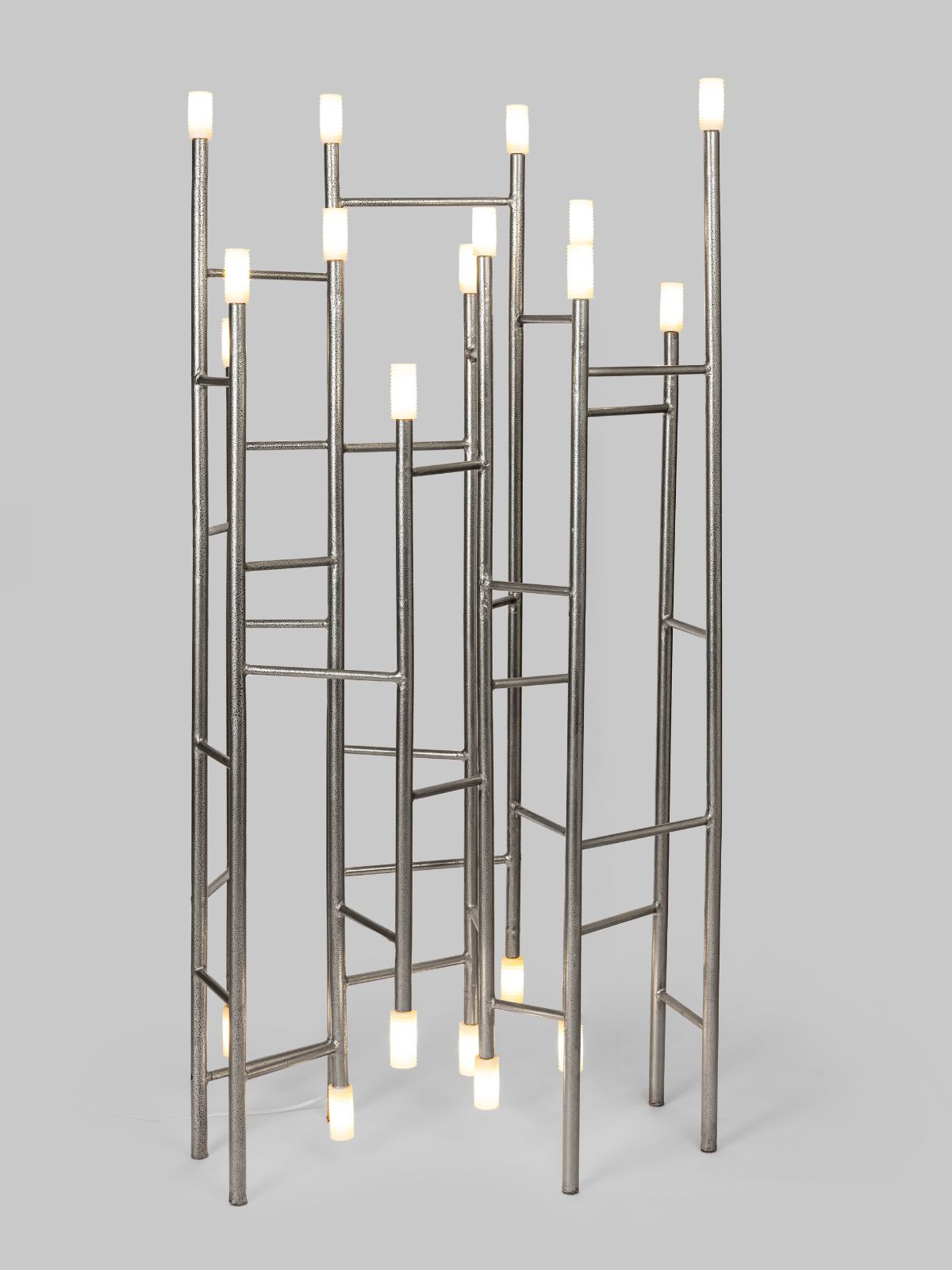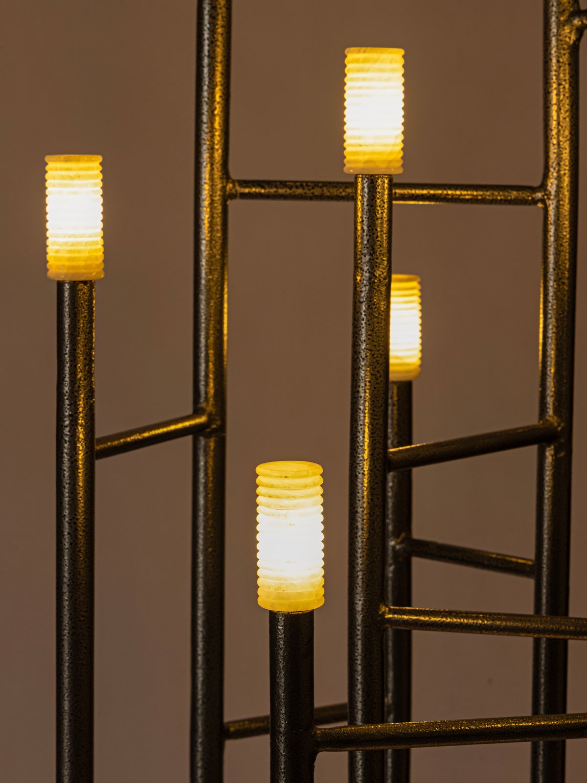 Inspired by the Bauhaus Movement, which was focused on integrating art with industrial production, our Siri Lux Floor Lamp fits the bill if you seek decorative luxury lighting for your home. The slender MS columns of this lamp stretch with a solemn grace, while the alabaster stone bulbs glow in an ethereal poise, evoking the divinity of Gothic Cathedrals and the serenity of ancient Colonnades. The lamps symmetry and geometric perfection symbolize balance, while the regularity of its shape suggests order and organization, appealing to the human desire for stability and integrity. Each vertical column is deliberately positioned, rendering the spaces between them just as vital as the columns themselves. The bulbs are made of supple alabaster stone that glows softly near a light source. Due to the translucency of these bulbs, this floor lamp creates a warm and genial ambiance, a Floating illusion, making it perfect for corner lighting. Siri Lux Lamp is a masterful personification of Industrial Interior Design style, best suited for contemporary homes.