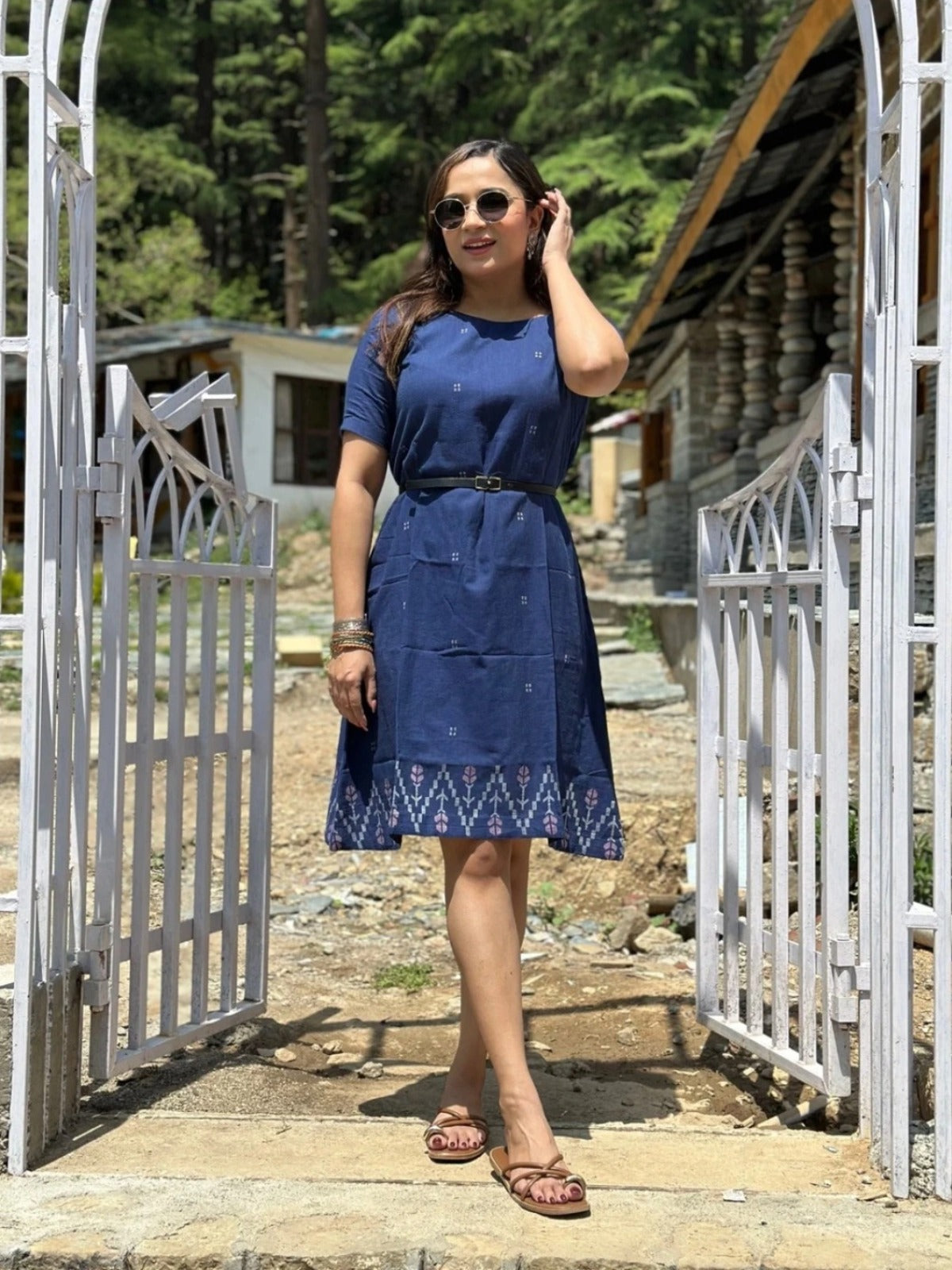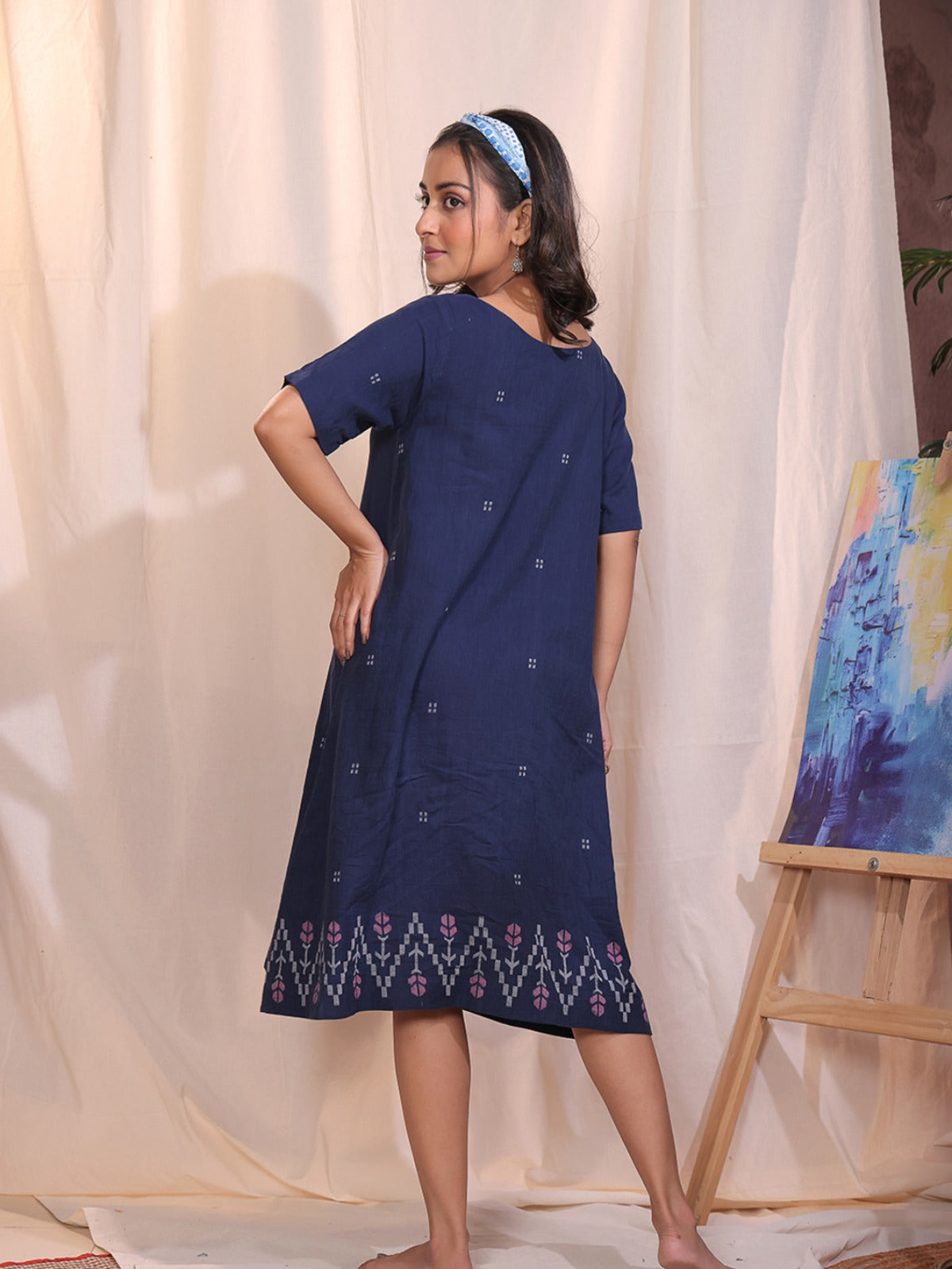 Navy Blue Jamdani Dress with square motifs and a pink floral border blends tradition with modern ease. Crafted in breathable fabric and styled in a straight-line silhouette, it ensures comfort and elegance. A versatile short dress, perfect for casual wear or special occasions, it adds timeless charm to your wardrobe.