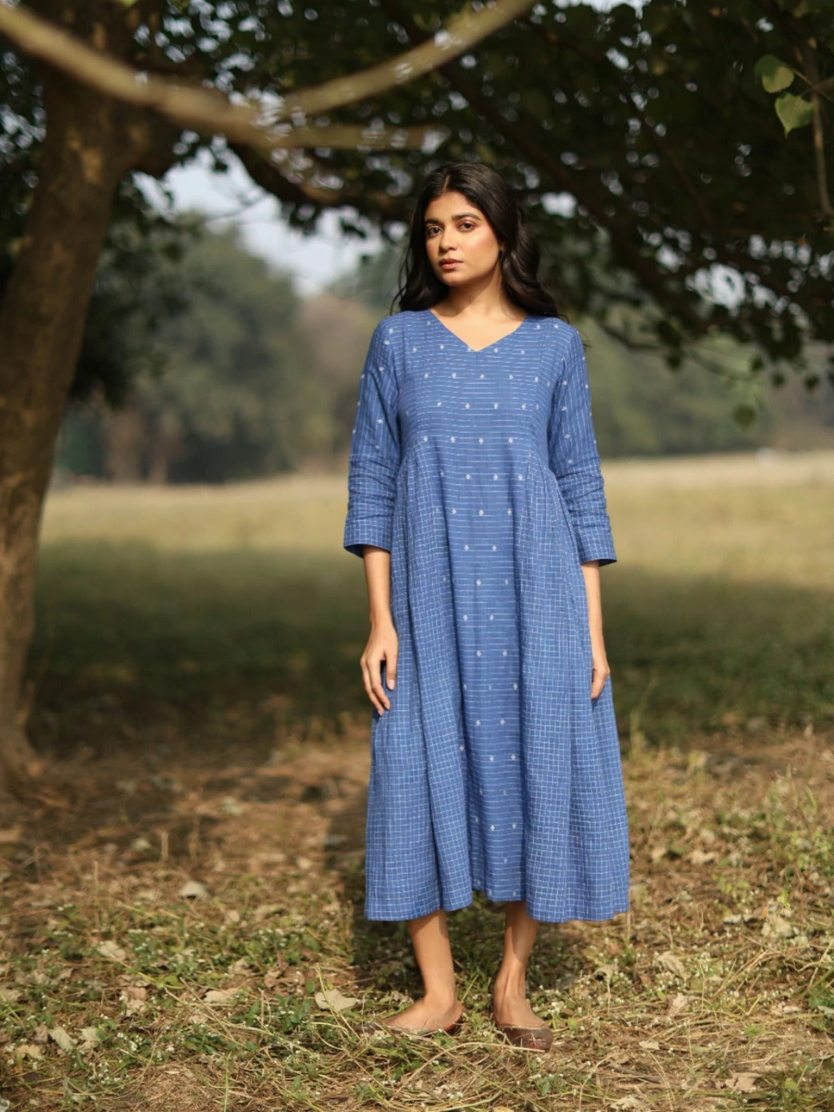 Blue and White Jamdani Cotton Dress pairs soothing tones with timeless craft. Handwoven motifs and a flared silhouette bring ease and charm, while the breathable fabric ensures comfort. Ethically made and versatile, it transitions effortlessly from casual outings to festive occasions with understated elegance.