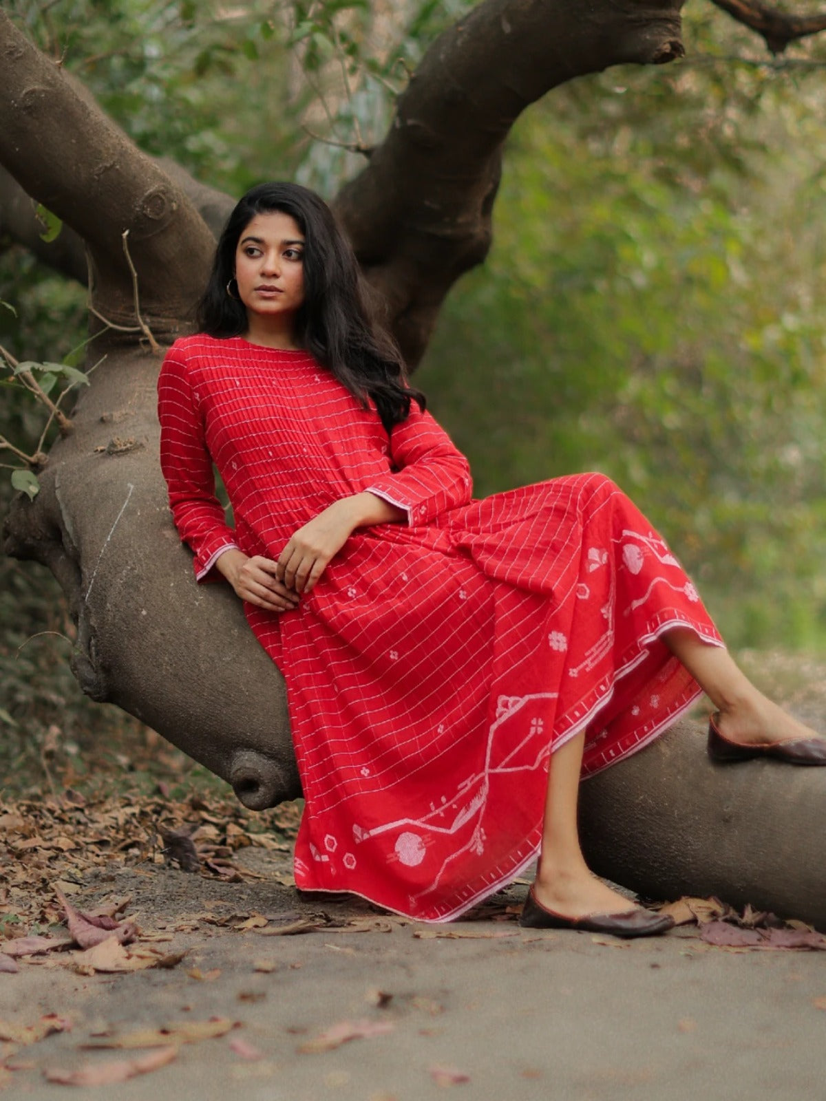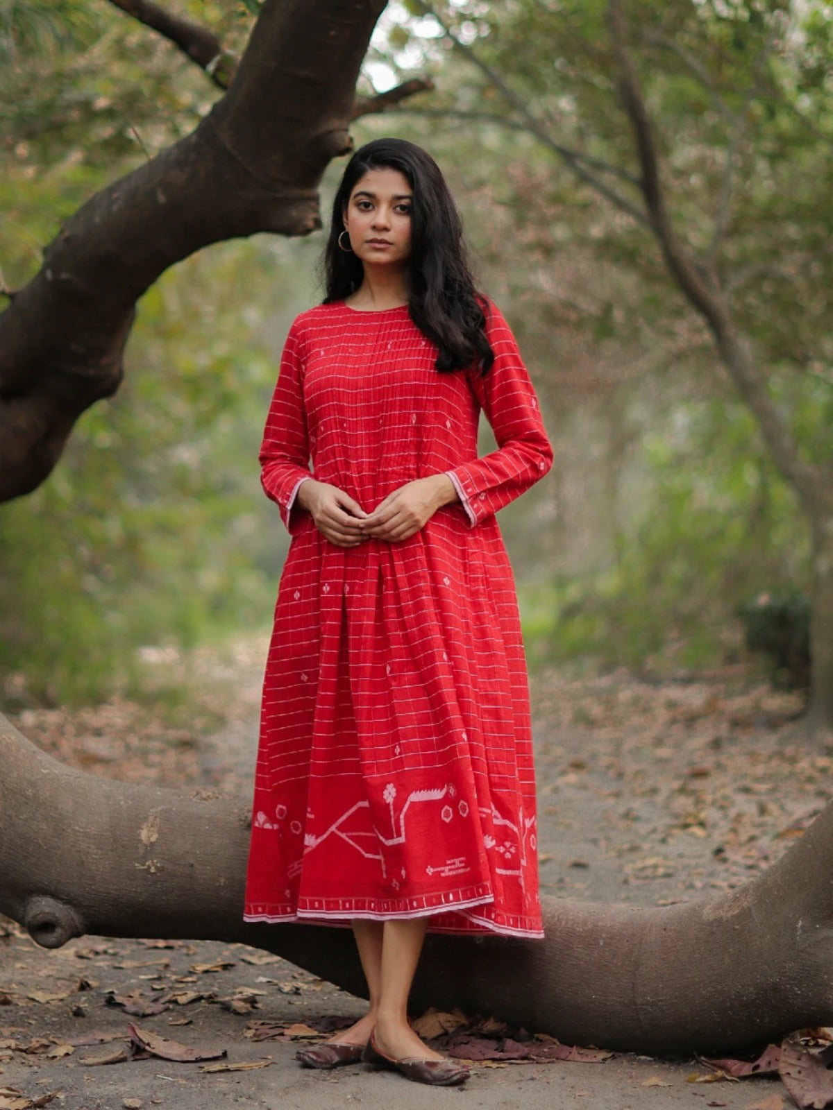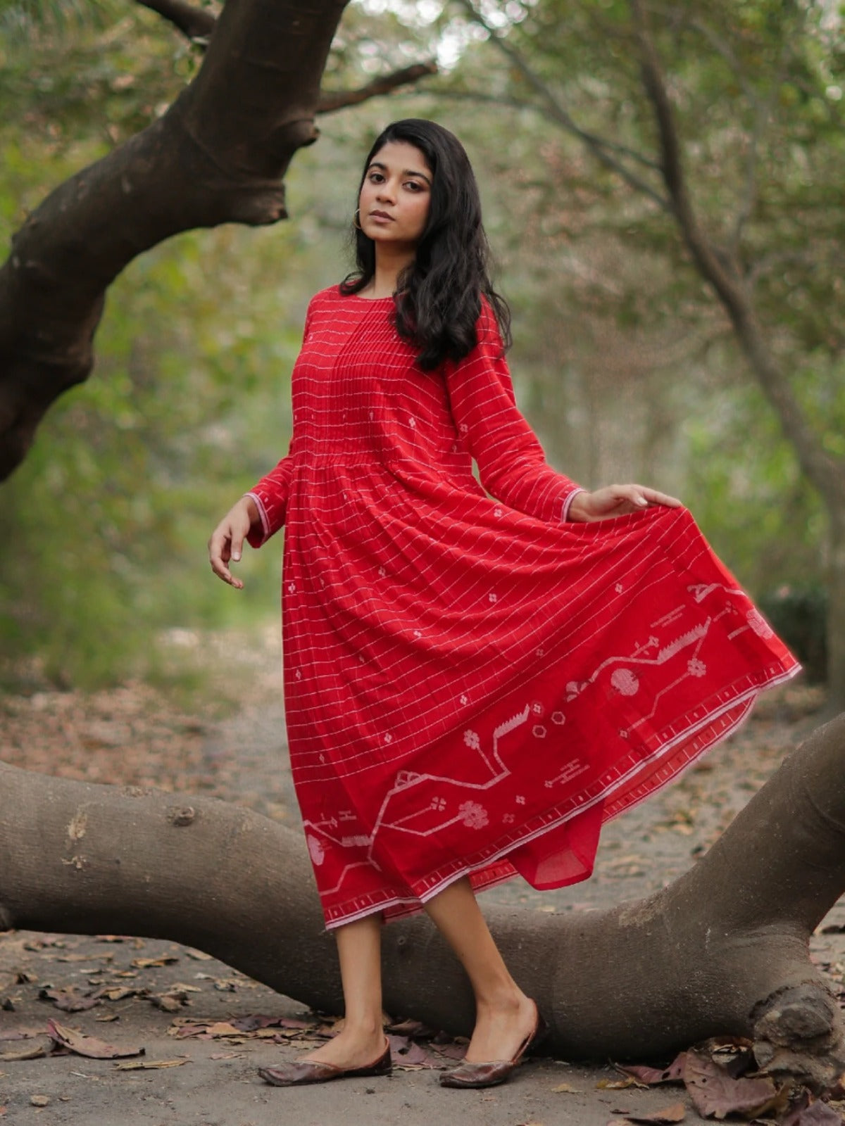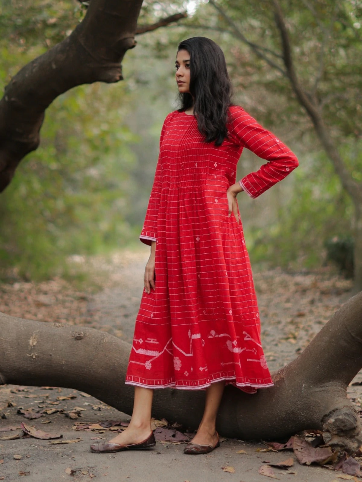 Red Flared Jamdani Dress in pure cotton features a round neck, broad white woven border, and soft lining for comfort. Handwoven with care, it blends traditional artistry with modern elegance. A versatile piece, perfect for festive celebrations or casual outings, adding timeless charm to your wardrobe.
