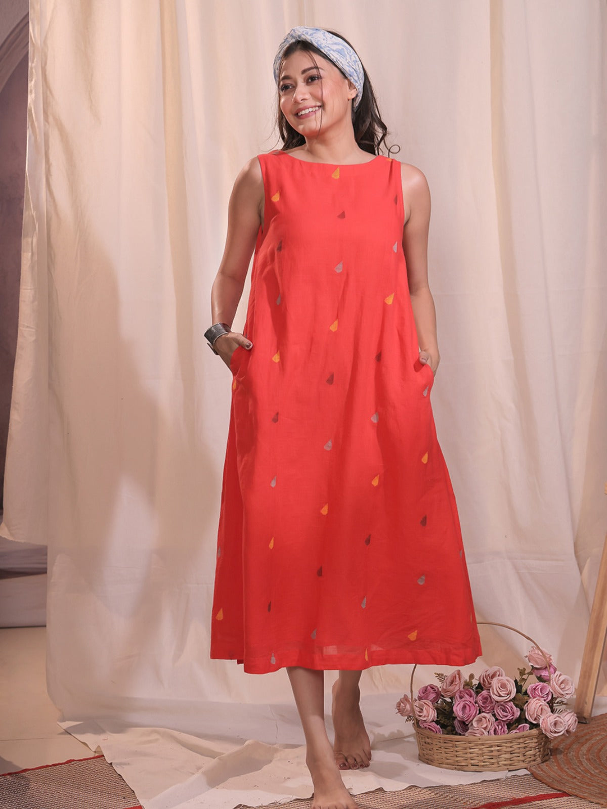 Sweet Orange Jamdani Maxi Dress with multicolor motifs brings vibrant elegance to your wardrobe. Designed with a boat neck and soft lining, it offers comfort with a graceful flow. Handwoven detailing adds timeless charm, making it a versatile pick for festive occasions or relaxed outings.
