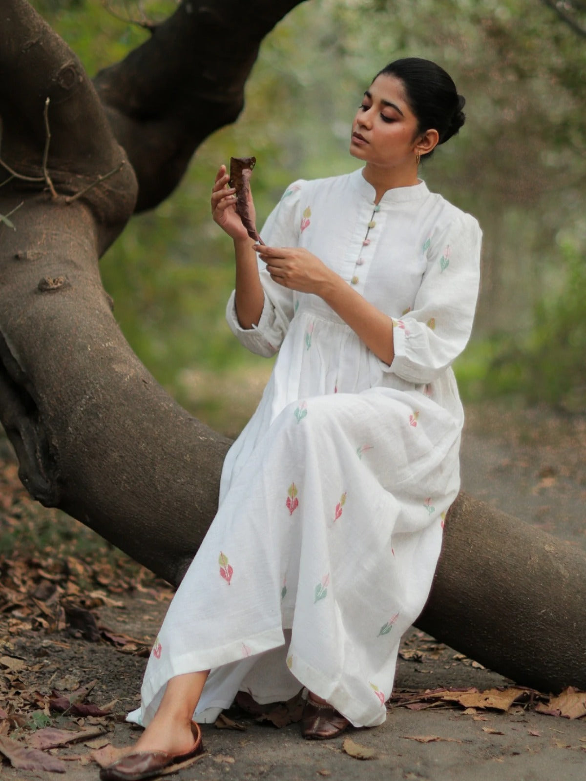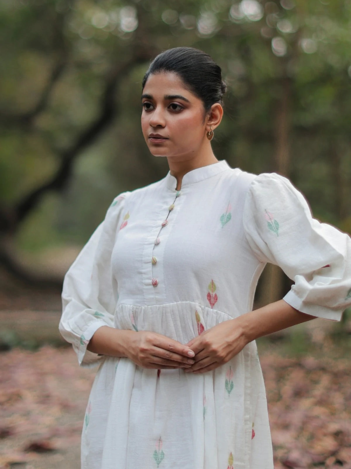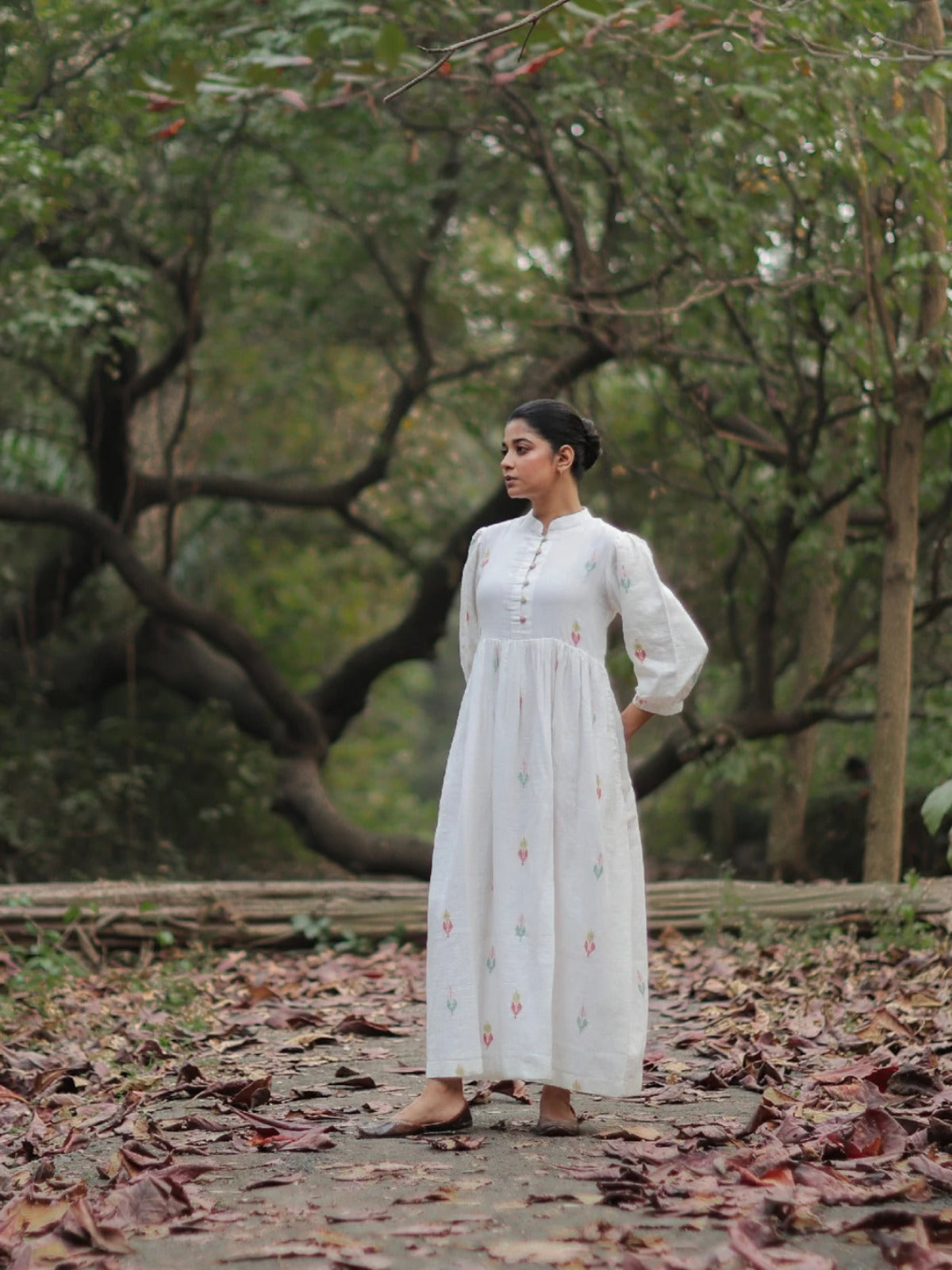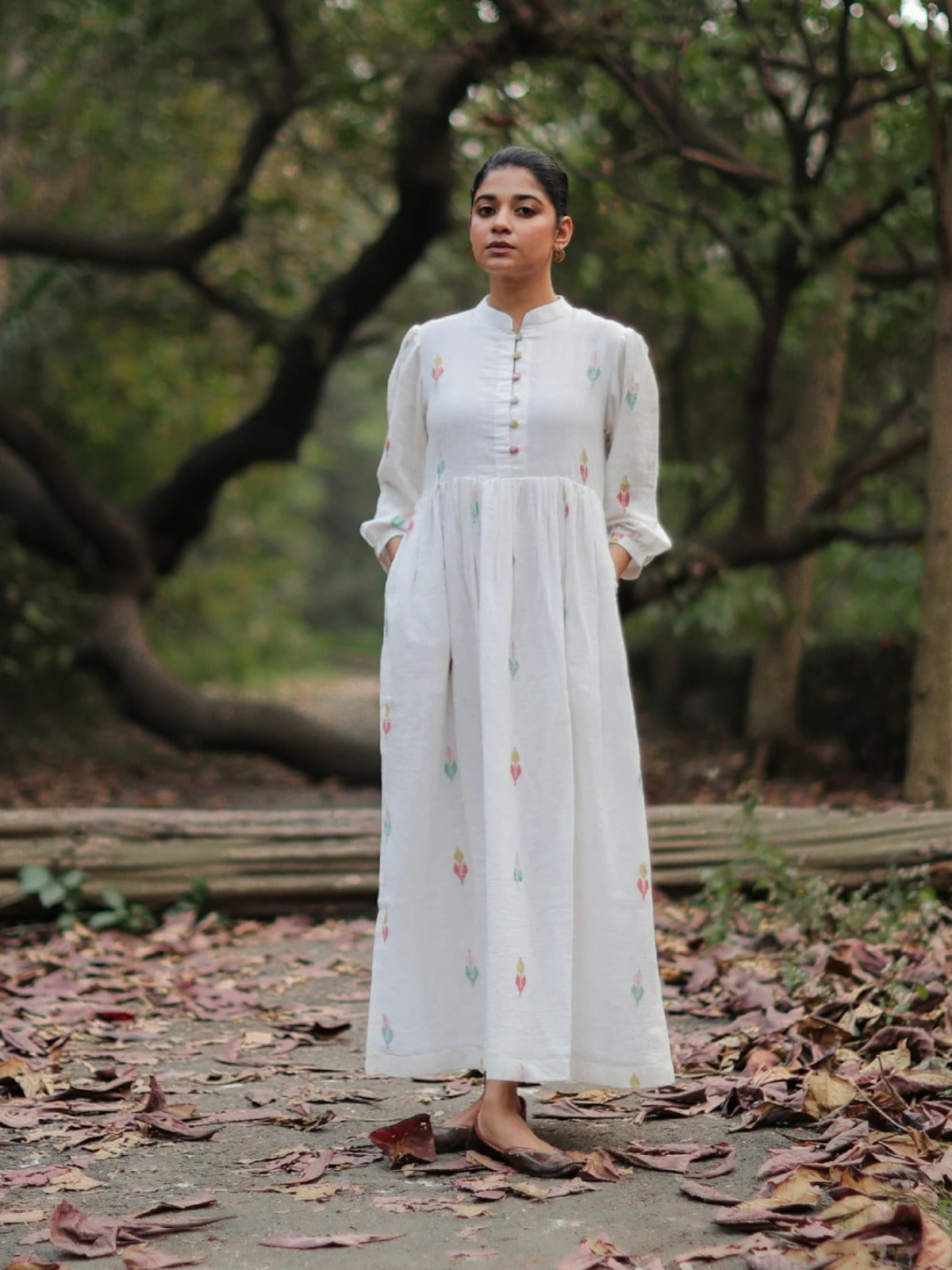 White Flared Jamdani Dress in pure cotton features multicolor leaf motifs and a flat collar neck for a refined touch. Designed with a soft lining and side slit, it offers comfort and ease of movement. A versatile piece that blends handwoven tradition with modern elegance for casual or semi-formal occasions.