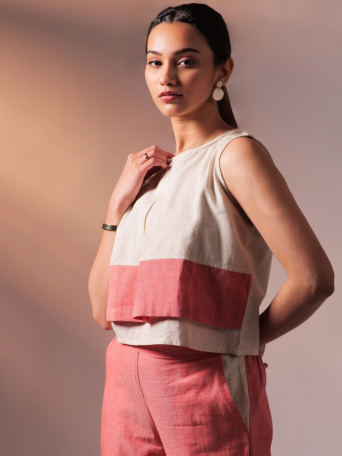 A perfect blend of style and utility, featuring a sleeveless top paired with joggerstyle pants, complete with pockets for added convenience. The coord set stands out with its bold yet soft colour blocking, creating a modern, youthful vibe. The loose fit ensures comfort, while the structured pleats on the top and elasticized hem on the joggers give it a polished edge. Made with lightweight and breathable fabric, ideal for warm days without compromising on style.