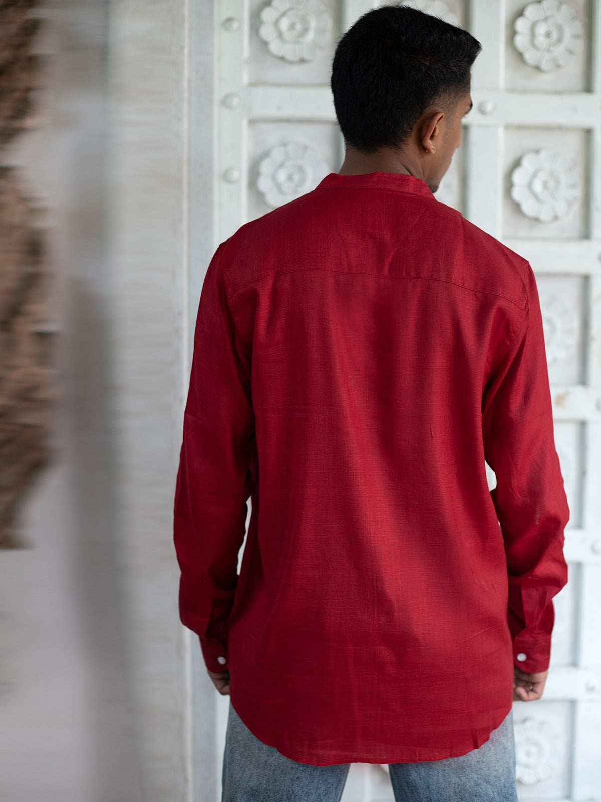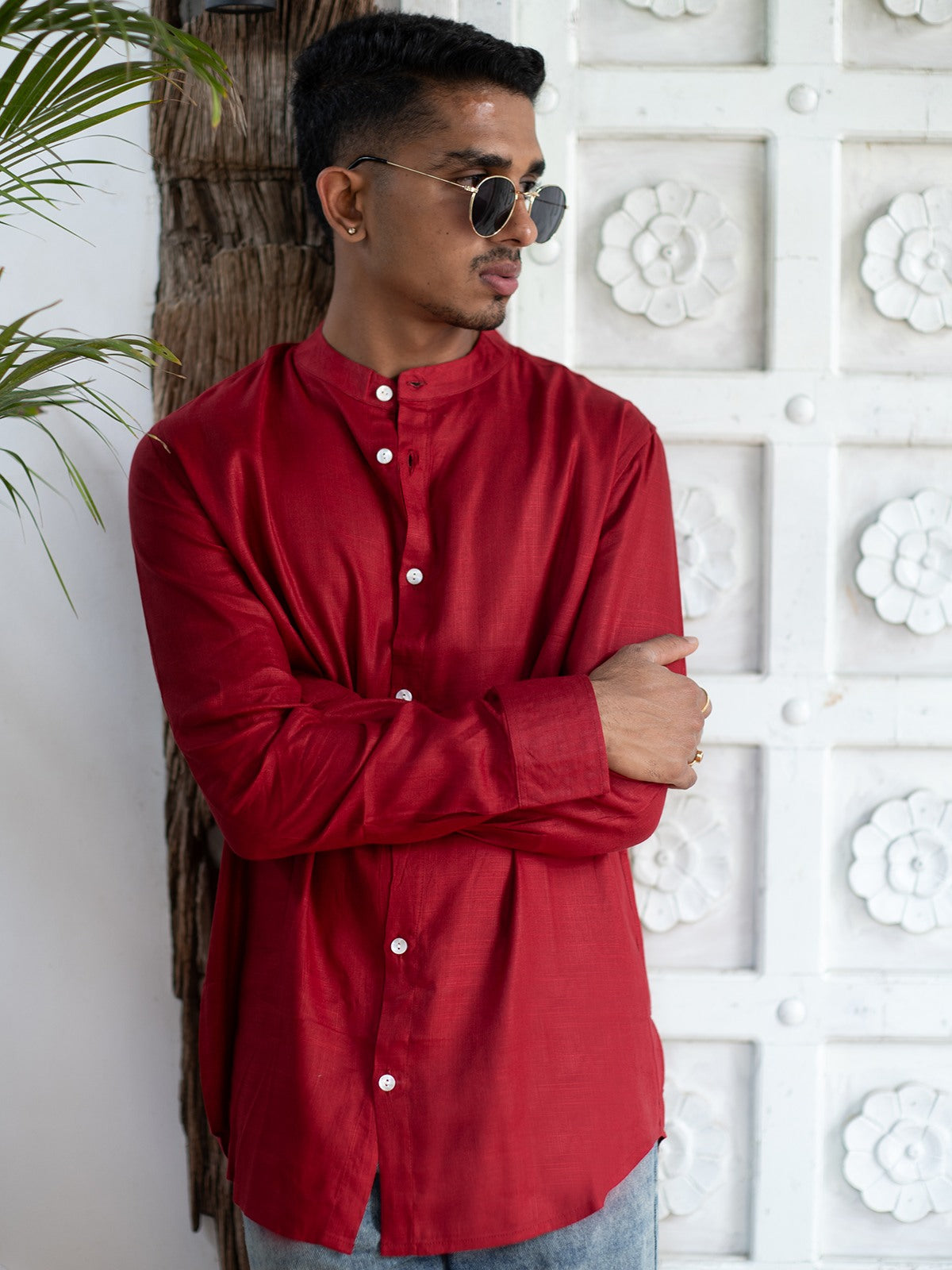 Features a clean Chinese collar, offering a modern and sleek touch to the classic buttondown shirt. Designed with fulllength sleeves and neatly stitched cuffs, providing versatility to roll up or leave down. Subtle white shell buttons create a balanced contrast against the vibrant fabric, adding to its elegance. Tailored for a relaxed fit, ensuring both style and comfort for casual and semiformal occasions. Made from breathable, lightweight cotton, ensuring comfort throughout the day, ideal for warmer weather. Pairs seamlessly with denim, chinos, or tailored trousers, making it a versatile choice for any wardrobe.
