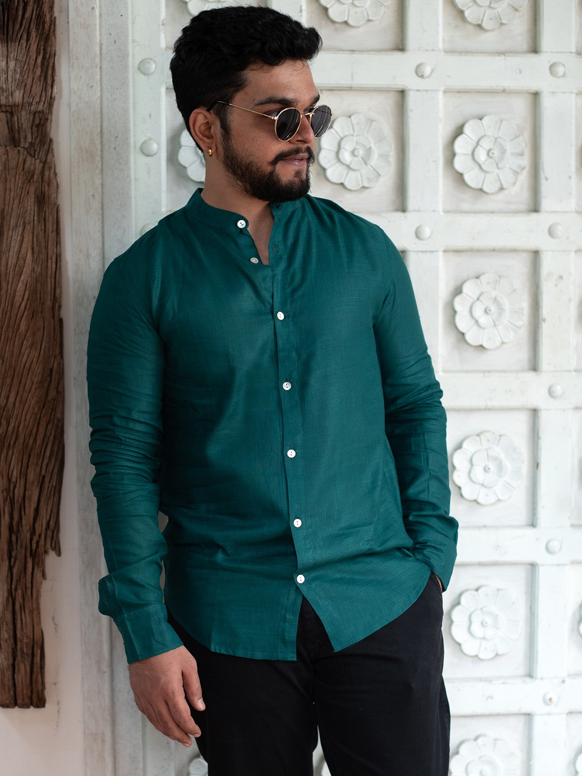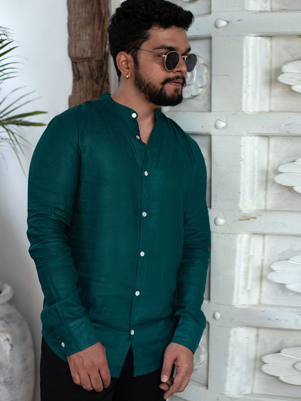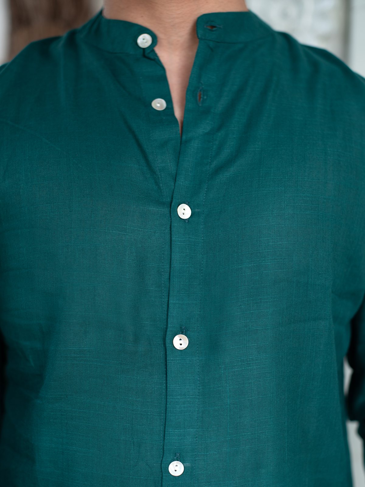 Features a clean Chinese collar, offering a modern and sleek touch to the classic buttondown shirt. Designed with fulllength sleeves and neatly stitched cuffs, providing versatility to roll up or leave down. Subtle white shell buttons create a balanced contrast against the vibrant fabric, adding to its elegance. Tailored for a relaxed fit, ensuring both style and comfort for casual and semiformal occasions. Made from breathable, lightweight cotton, ensuring comfort throughout the day, ideal for warmer weather. Pairs seamlessly with denim, chinos, or tailored trousers, making it a versatile choice for any wardrobe.