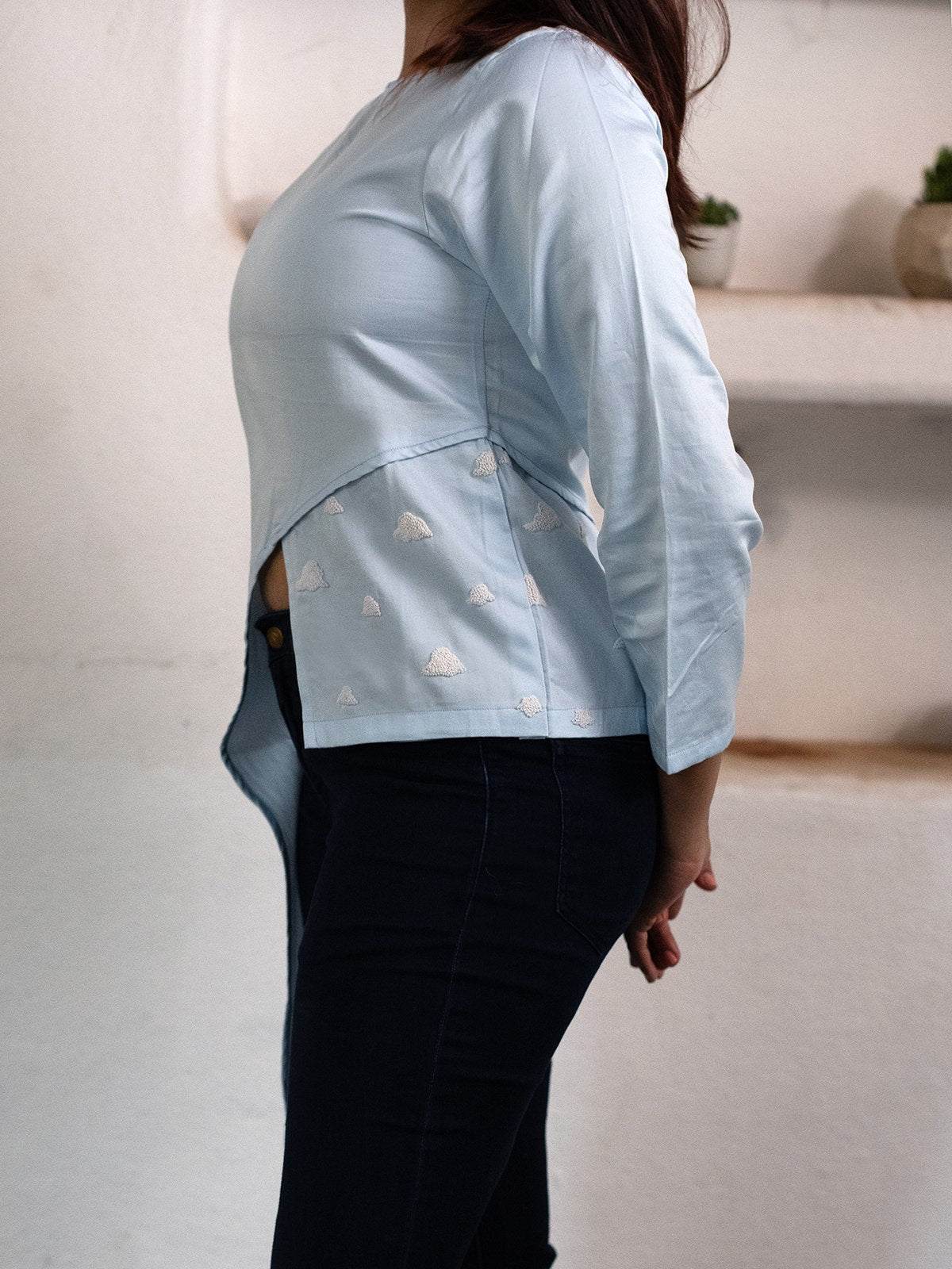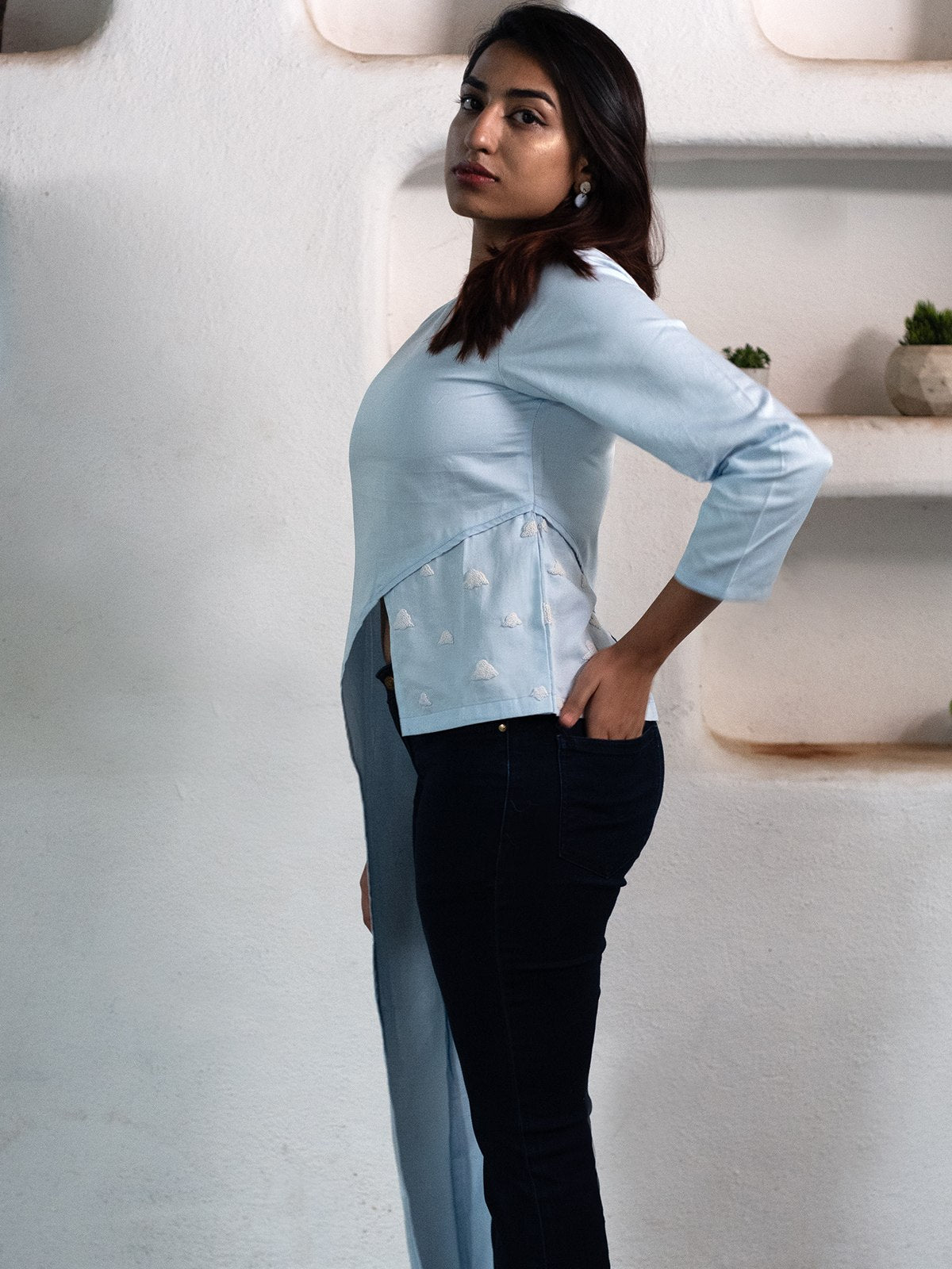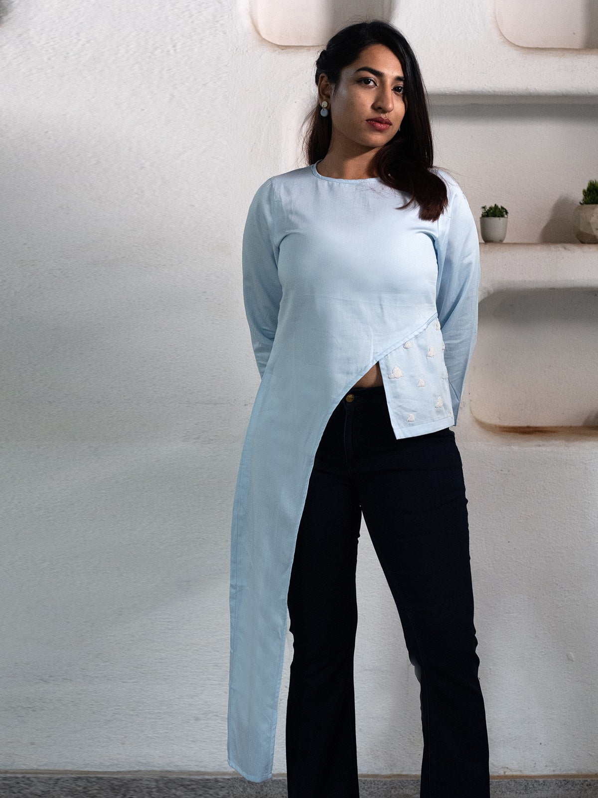 Features an asymmetric hemline with an extended drape, creating a statement look. Designed with full sleeves and an asymmetric silhouette, blending elegance with contemporary style. Delicate handembroidered cloud motifs, adding a dreamy, artisanal charm. A relaxed round neckline, offering a modern and effortless touch. Made from 100% breathable cotton, ensuring comfort with a soft, natural feel. A soothing sky blue hue, evoking serenity and sophistication that pairs effortlessly with wideleg cotton pants or denim, perfect for a chic yet laidback look
