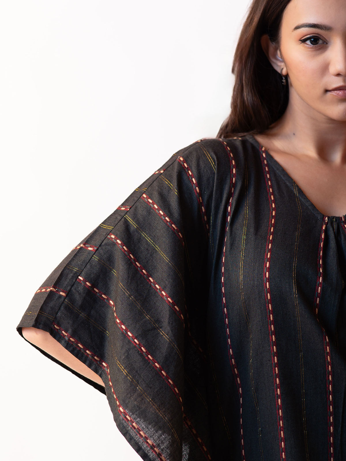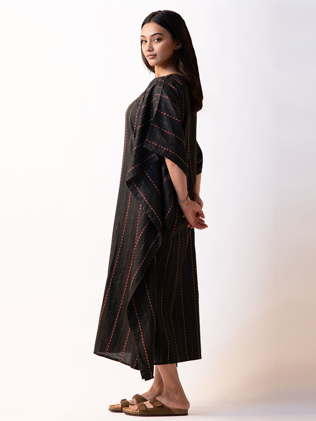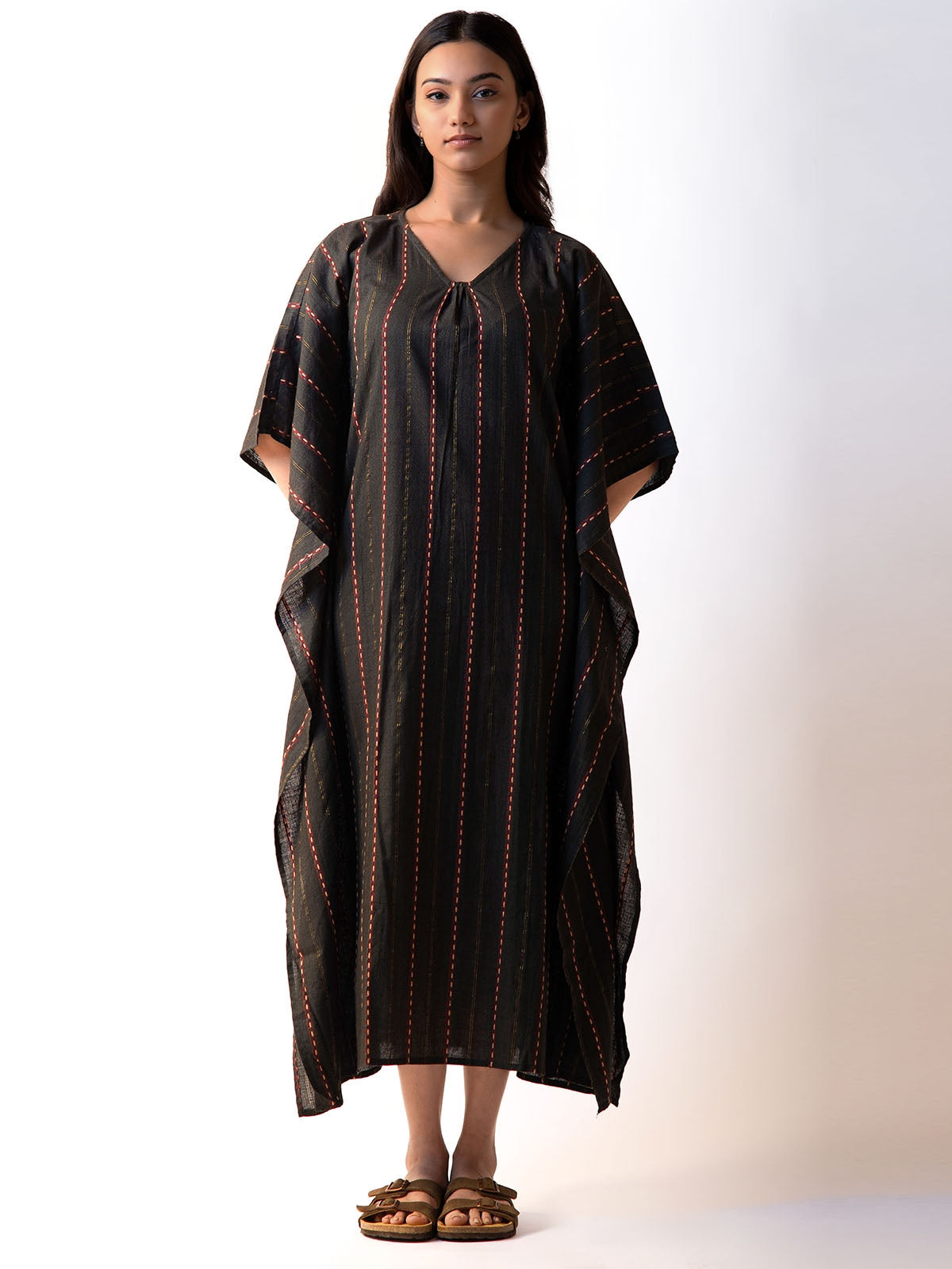 The long, flowing silhouette provides effortless elegance with a relaxed fit, perfect for any occasion. With its classic neckline and wide sleeves, this kaftan is as ideal for a casual day out as it is for an intimate gathering. Subtle contrast stitching in earthy tones elevates the dark fabric, adding depth and artisanal charm. Crafted for comfort, this long kaftan allows ease of movement while making a bold style statement.