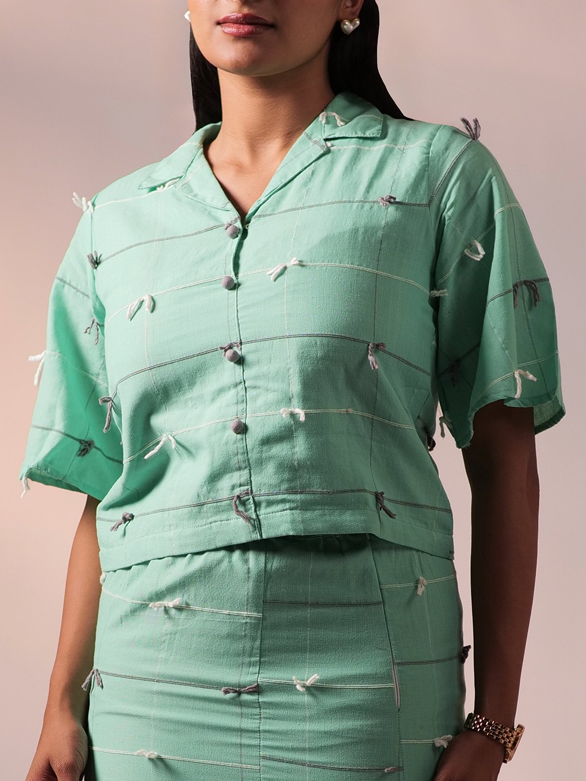 The top is a boxy, buttondown crop shirt with elbowlength sleeves, offering a relaxed yet tailored vibe. The skirt is highwaisted, designed to complement the crop shirt, and includes a bold front slit that enhances movement. It features a subtle knot pattern, which is basically an inverse of a weave, adding a touch of visual interest. This twopiece set can be styled as three individual outfits if worn seperately.