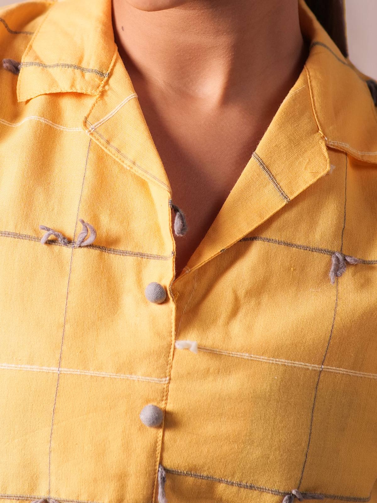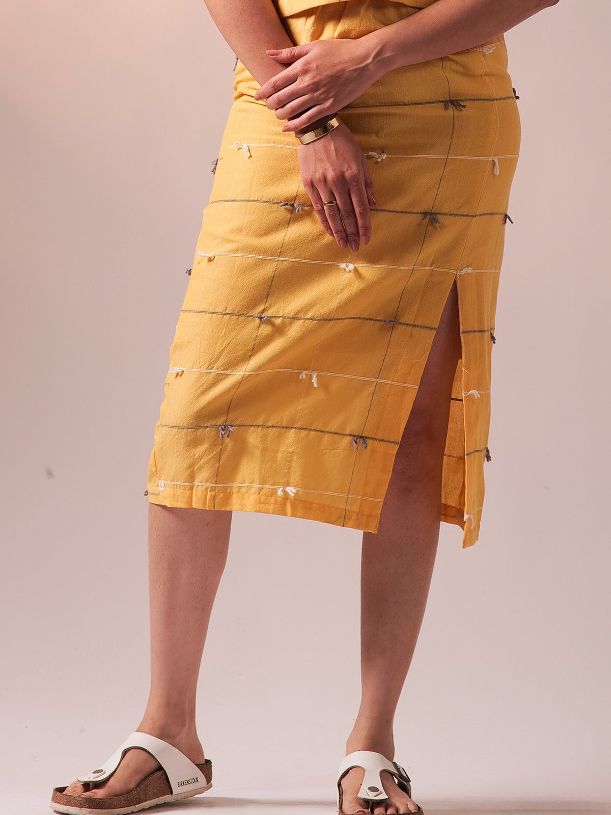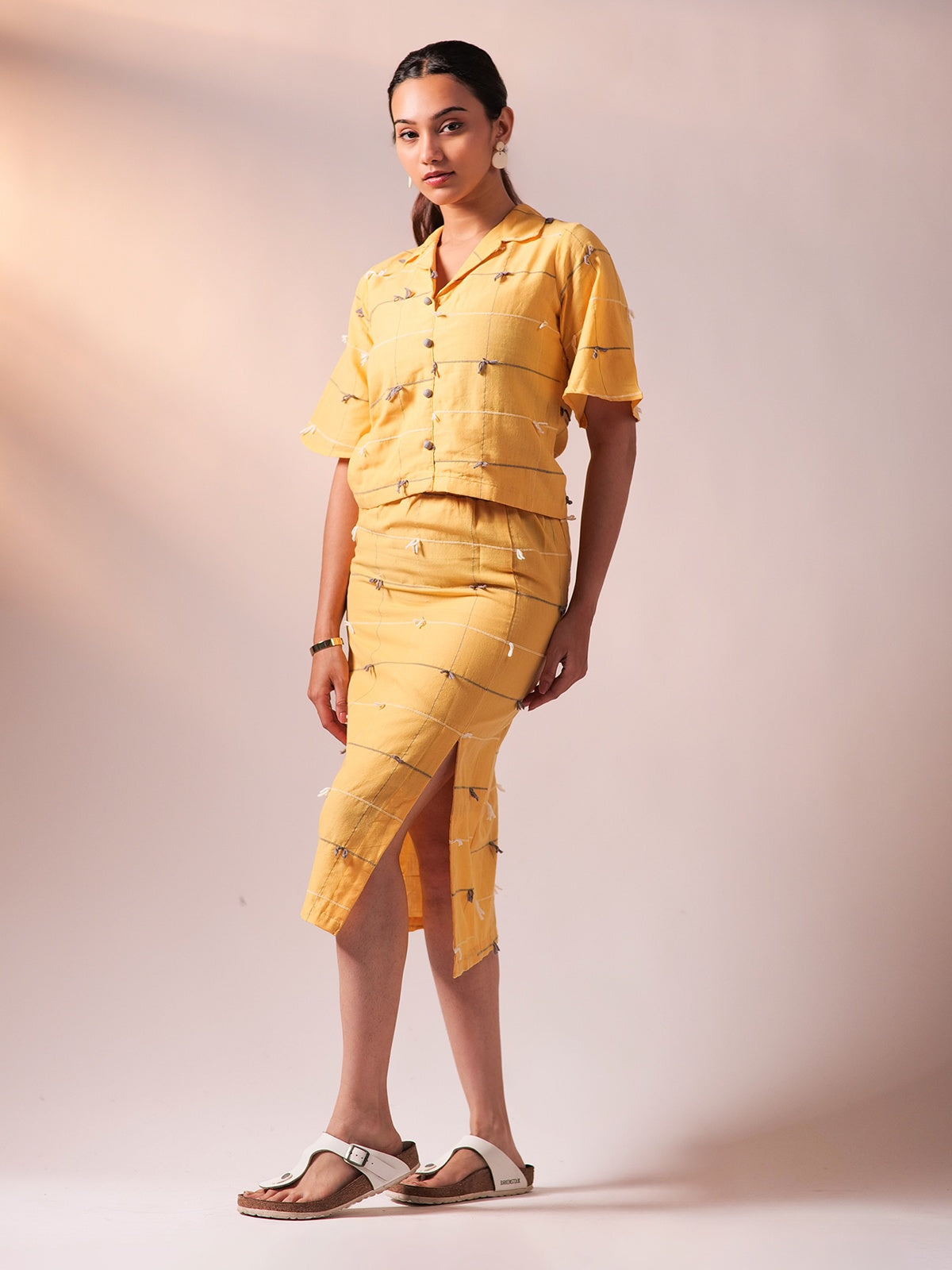 The top is a boxy, buttondown crop shirt with elbowlength sleeves, offering a relaxed yet tailored vibe. The skirt is highwaisted, designed to complement the crop shirt, and includes a bold front slit that enhances movement. It features a subtle knot pattern, which is basically an inverse of a weave, adding a touch of visual interest. This twopiece set can be styled as three individual outfits if worn seperately.