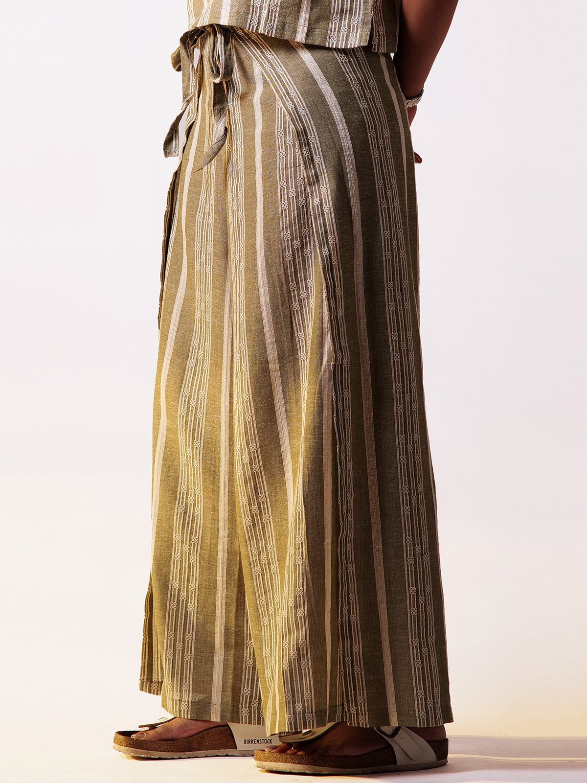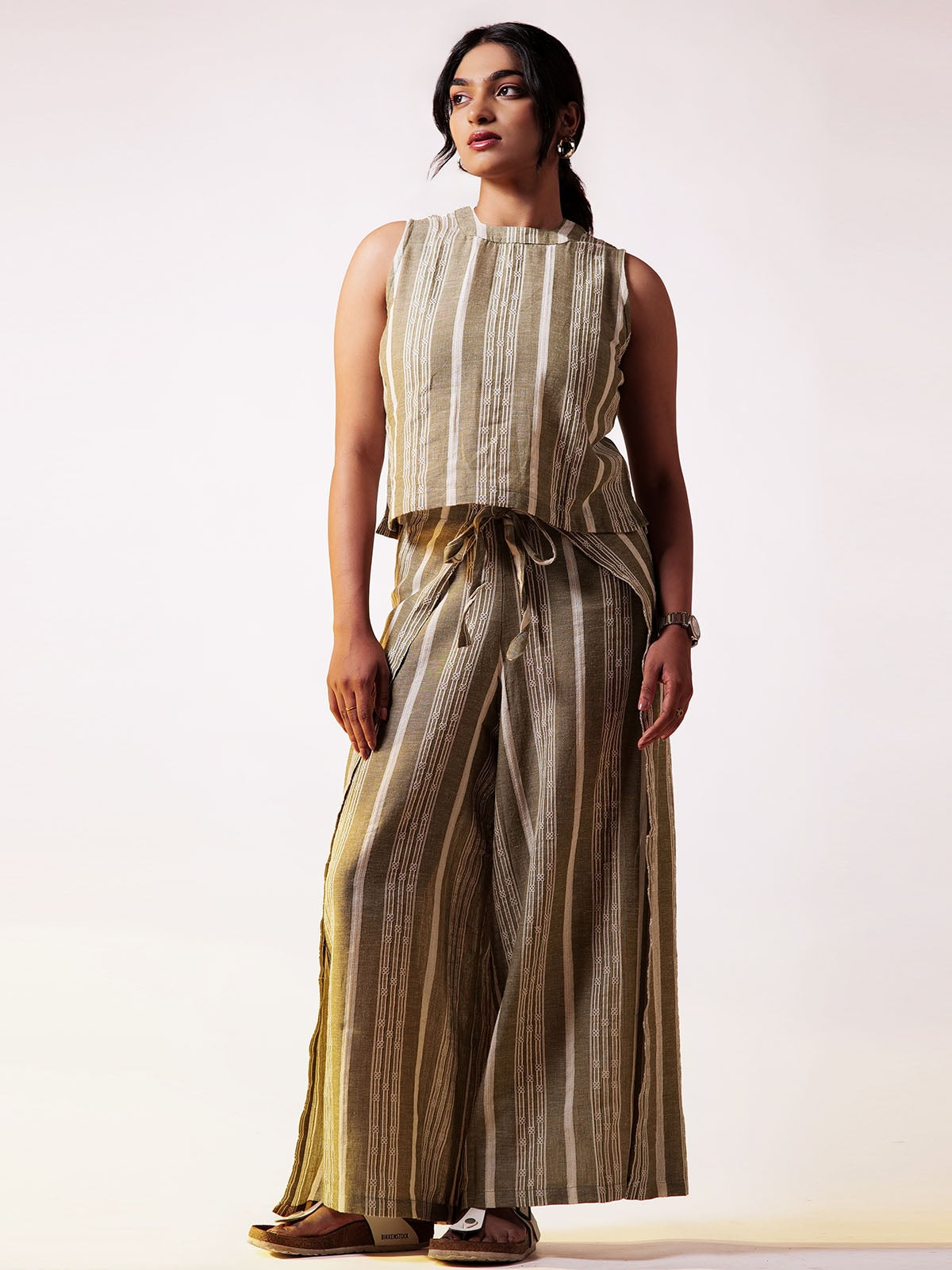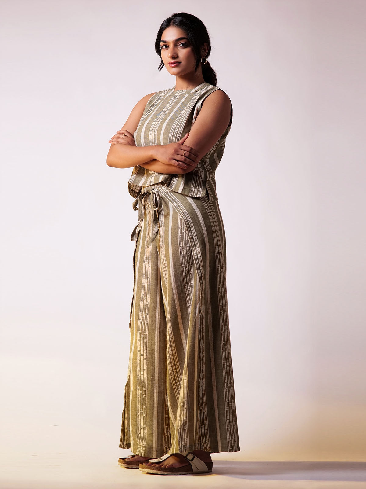 The sleeveless top has a clean, structured design with a back zipper, creating a sleek silhouette. The subtle dobby weave adds texture, while the back zipper ensures an easy fit. The wraparound pants in dobby fabric have a relaxed, wideleg fit, bringing a touch of elegance to the outfit. The dobby fabric provides texture and durability, while the loose fit of both the top and pants enhances comfort and breathability. The stripes match the top, maintaining a coordinated look. The wraparound style adds movement and flair, making it versatile for various occasions.