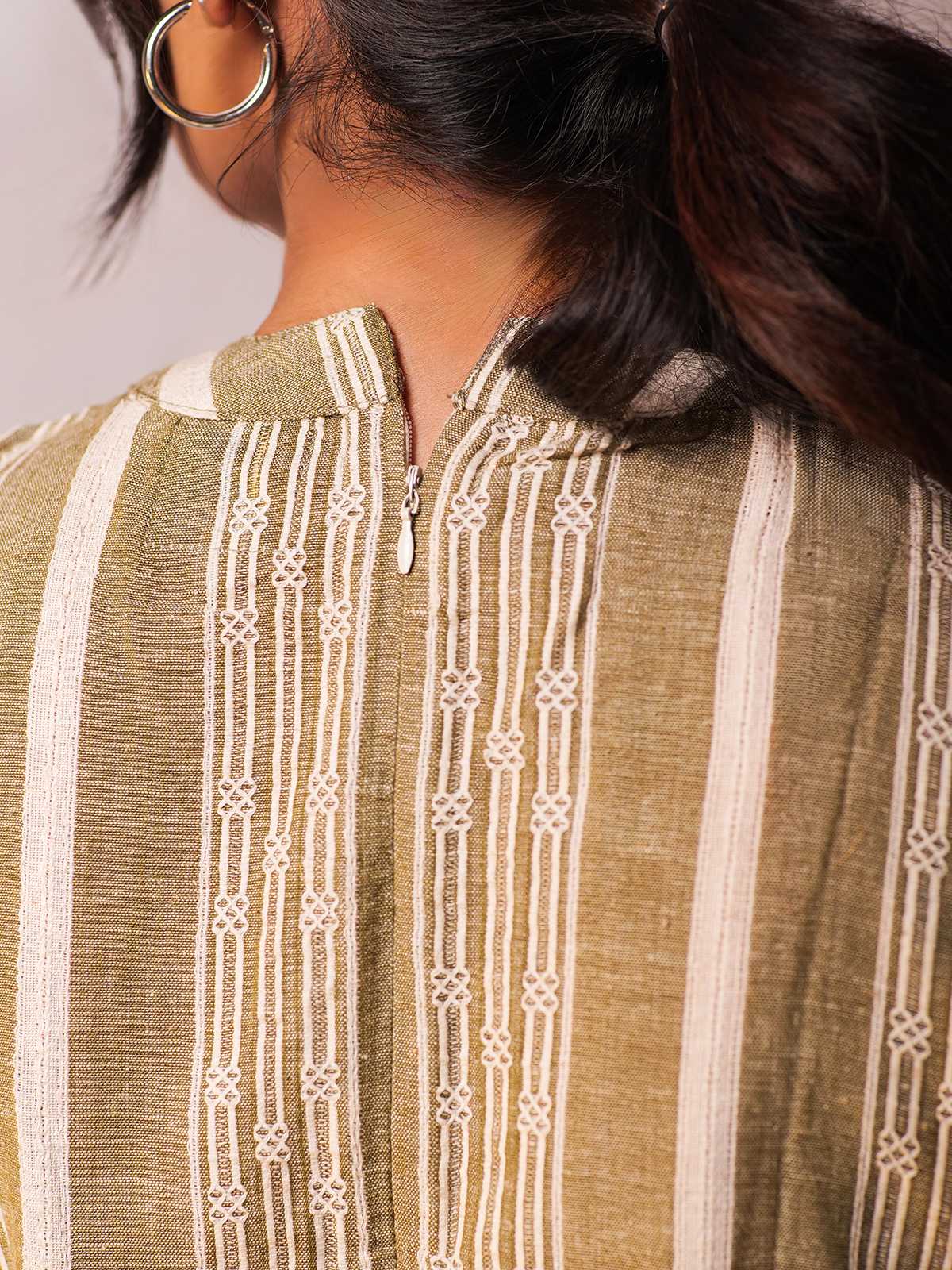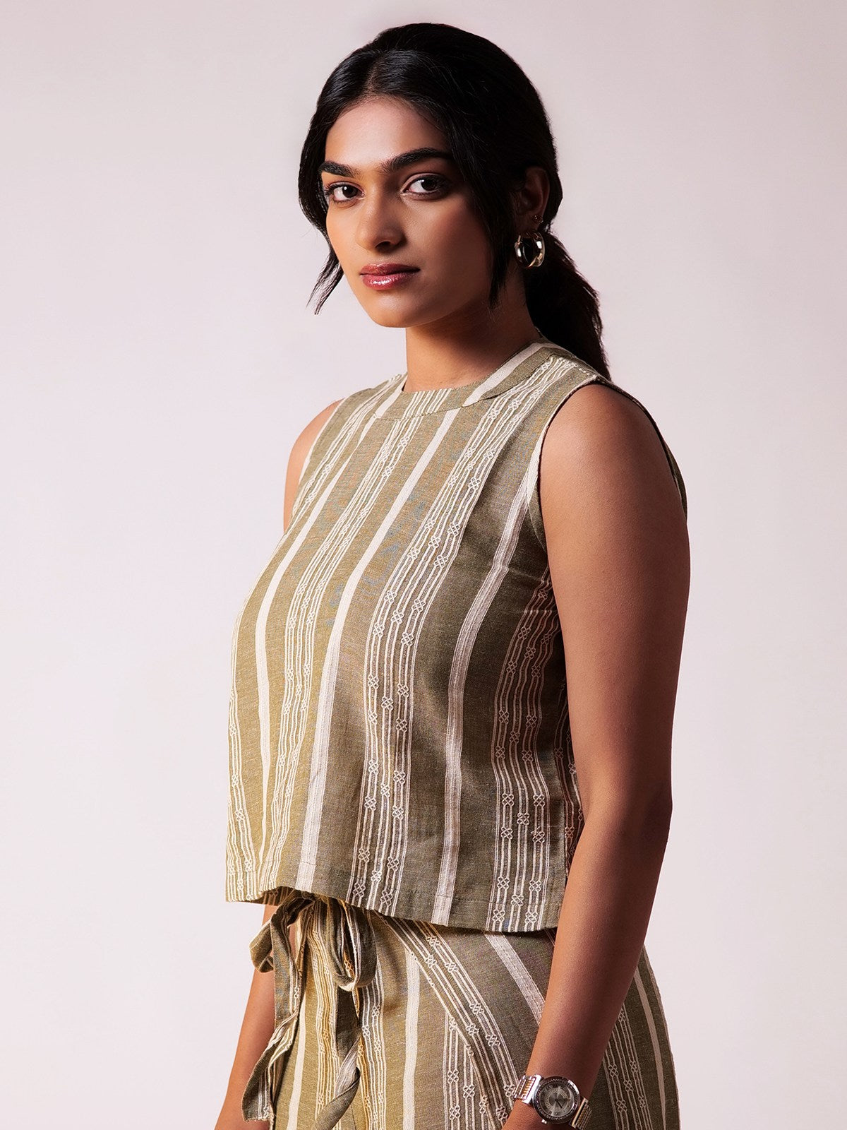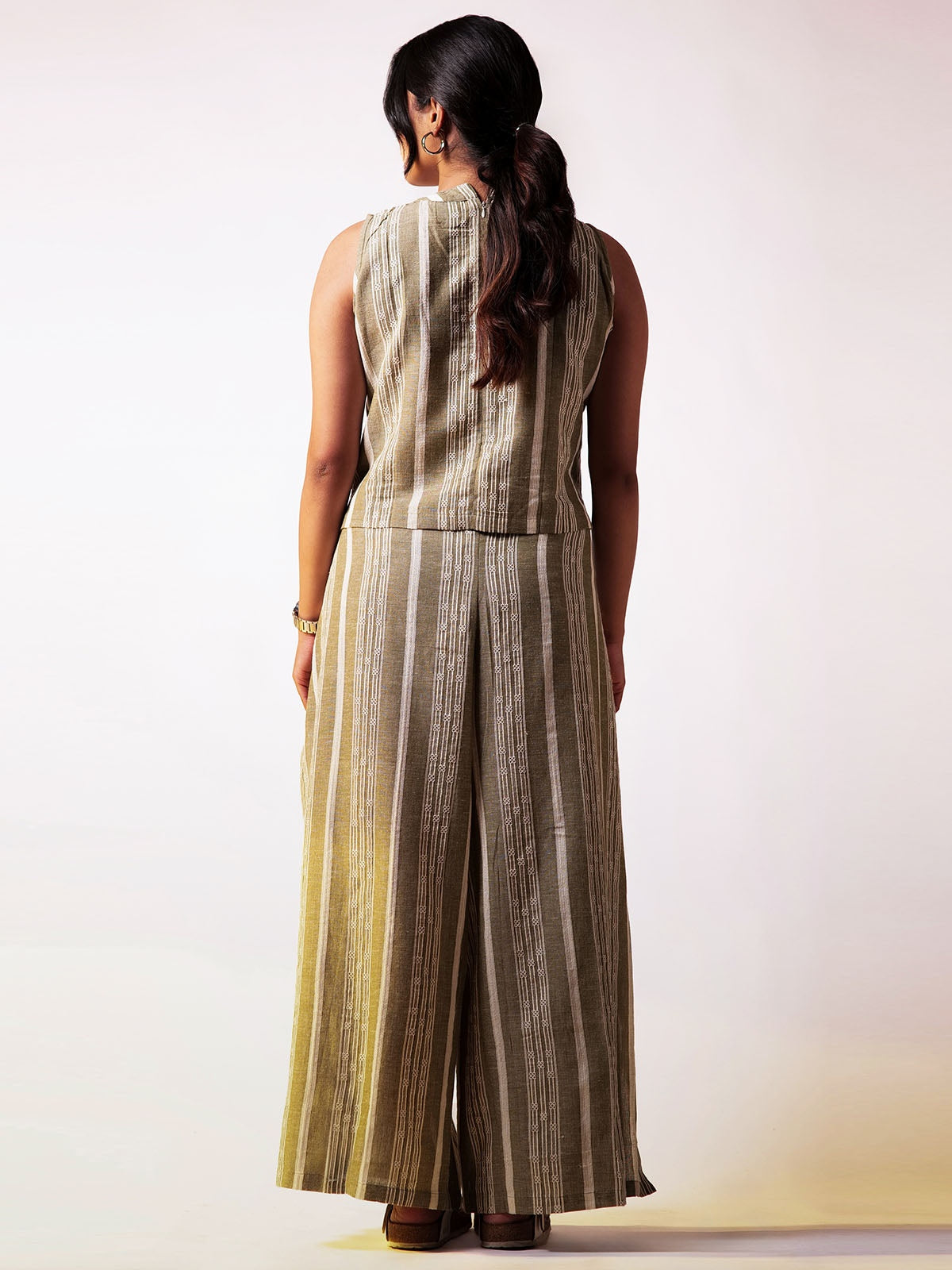 The sleeveless top has a clean, structured design with a back zipper, creating a sleek silhouette. The subtle dobby weave adds texture, while the back zipper ensures an easy fit. The wraparound pants in dobby fabric have a relaxed, wideleg fit, bringing a touch of elegance to the outfit. The dobby fabric provides texture and durability, while the loose fit of both the top and pants enhances comfort and breathability. The stripes match the top, maintaining a coordinated look. The wraparound style adds movement and flair, making it versatile for various occasions.
