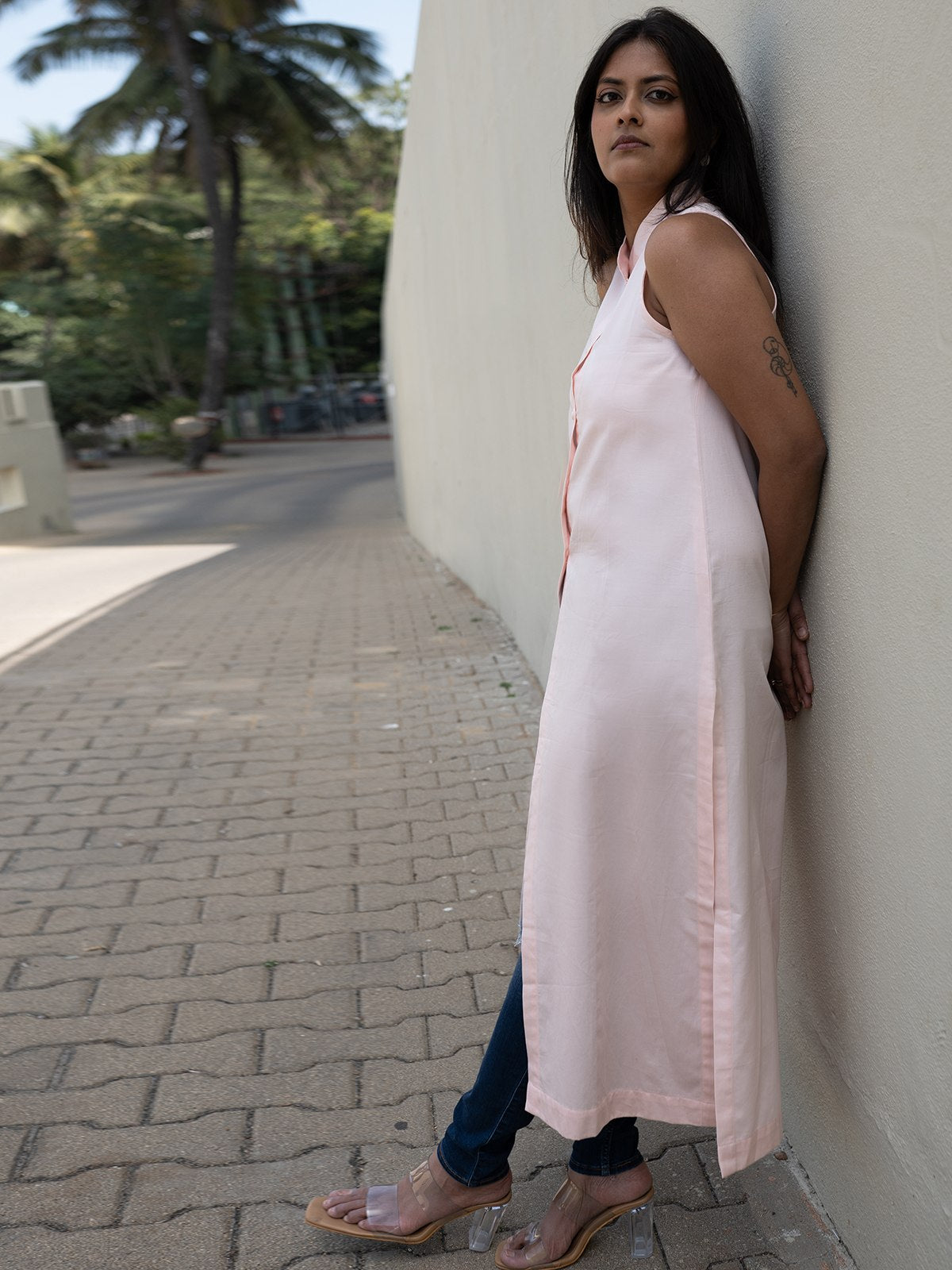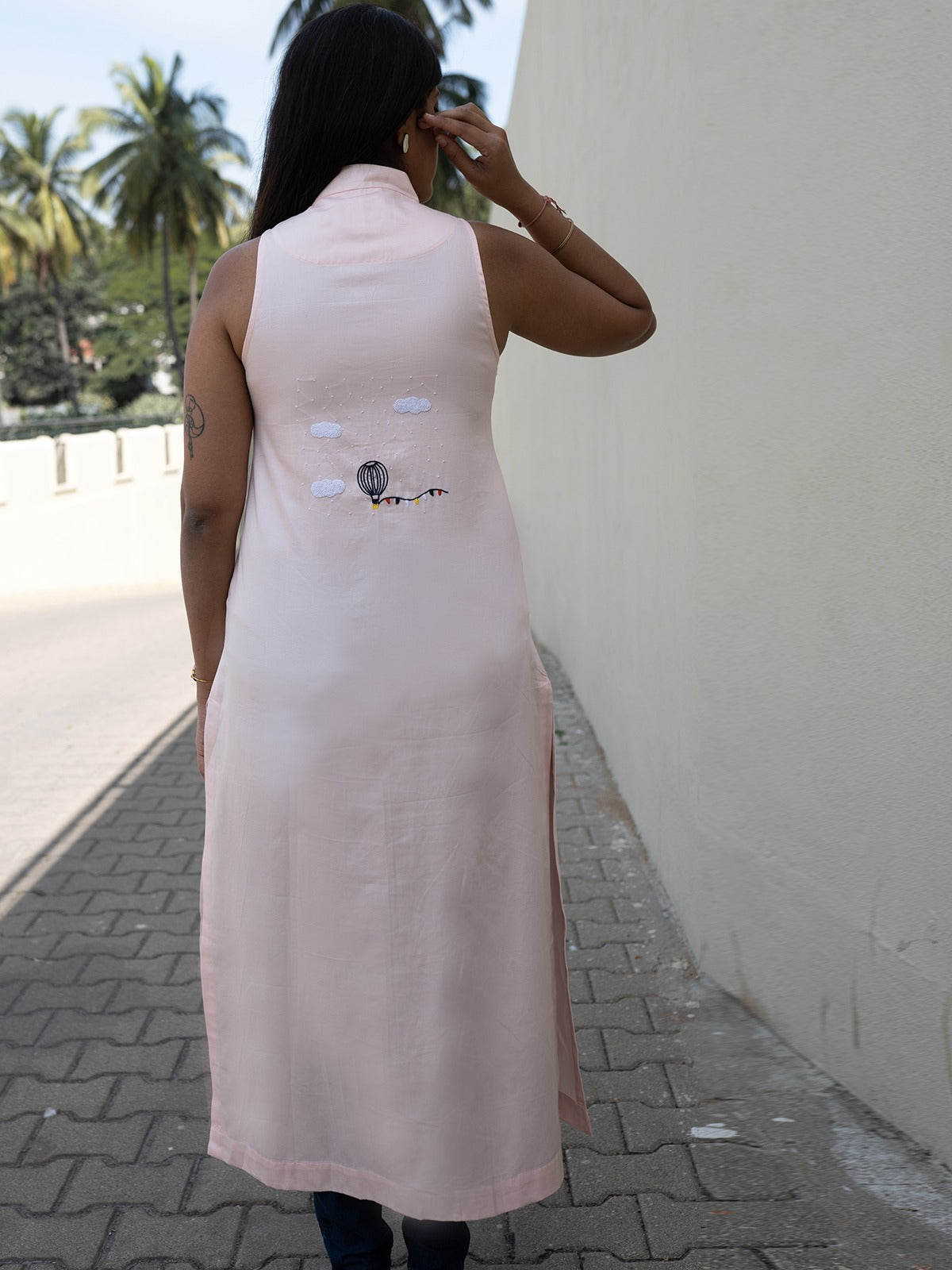 Features a long, frontslit hemline, perfect for layering over trousers or denim. Sleeveless design with a flowy, long silhouette for effortless grace and comfort also has attached sleeves in the inside. A sleek chinese collar, adding structure and elegance to the look. Exquisite handembroidered flying parachute motif on the back, symbolizing freedom and adventure inspired from the element of nature. Made from 100% breathable cotton, offering lightweight ease for allday wear. A soft blush pink hue, radiating understated elegance and charm that pairs beautifully with denim, straight pants, or layered looks, transitioning effortlessly from casual to refined.