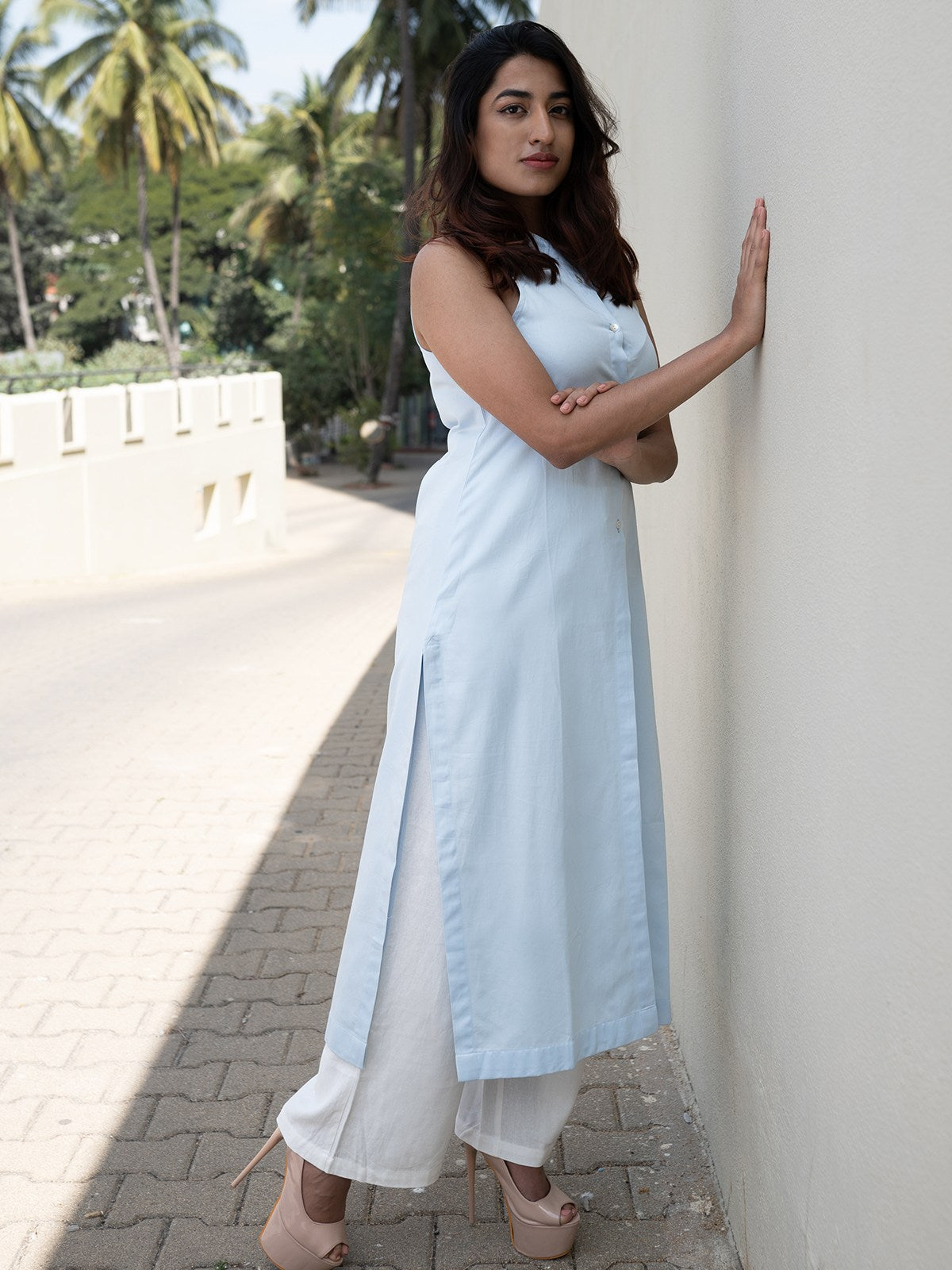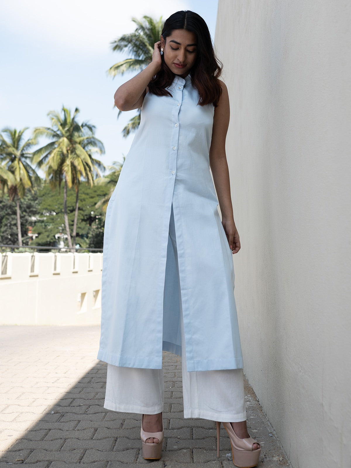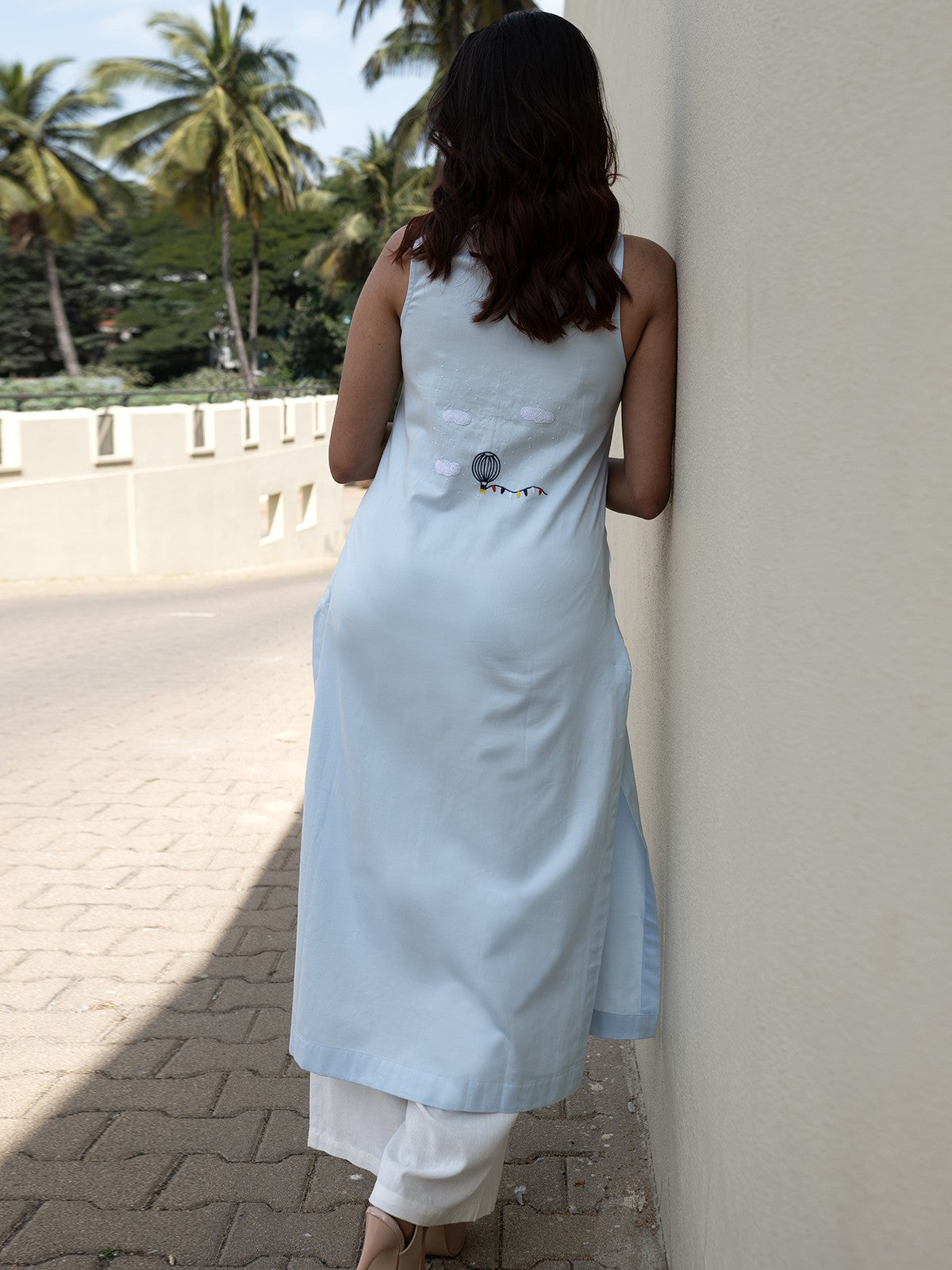 Features a long, frontslit hemline, perfect for layering over trousers or denim. Sleeveless design with a flowy, long silhouette for effortless grace and comfort also has attached sleeves in the inside. A sleek chinese collar, adding structure and elegance to the look. Exquisite handembroidered flying parachute motif on the back, symbolizing freedom and adventure inspired from the element of nature. Made from 100% breathable cotton, offering lightweight ease for allday wear. A soft sky blue hue, radiating understated elegance and charm that pairs beautifully with denim, straight pants, or layered looks, transitioning effortlessly from casual to refined.