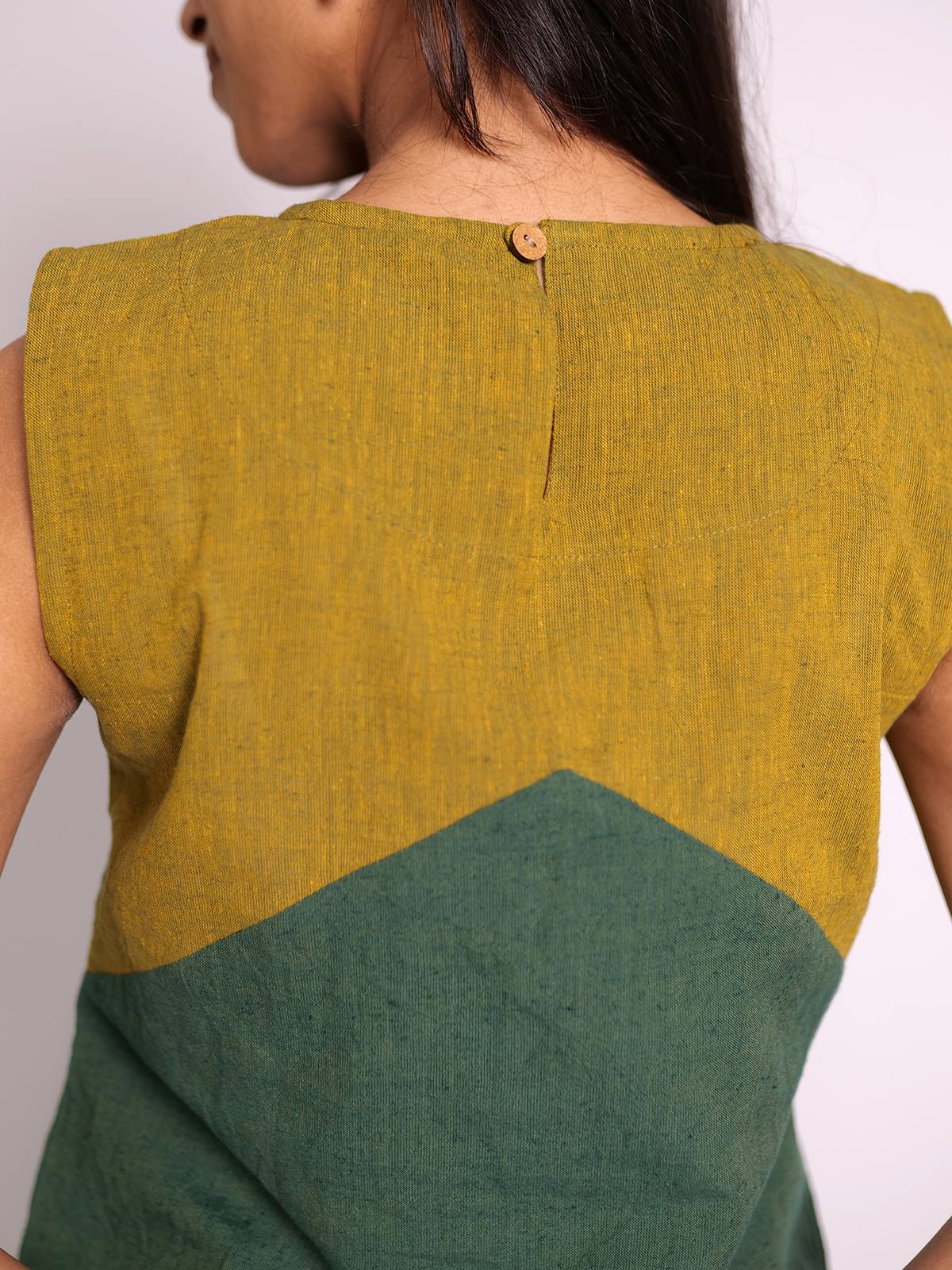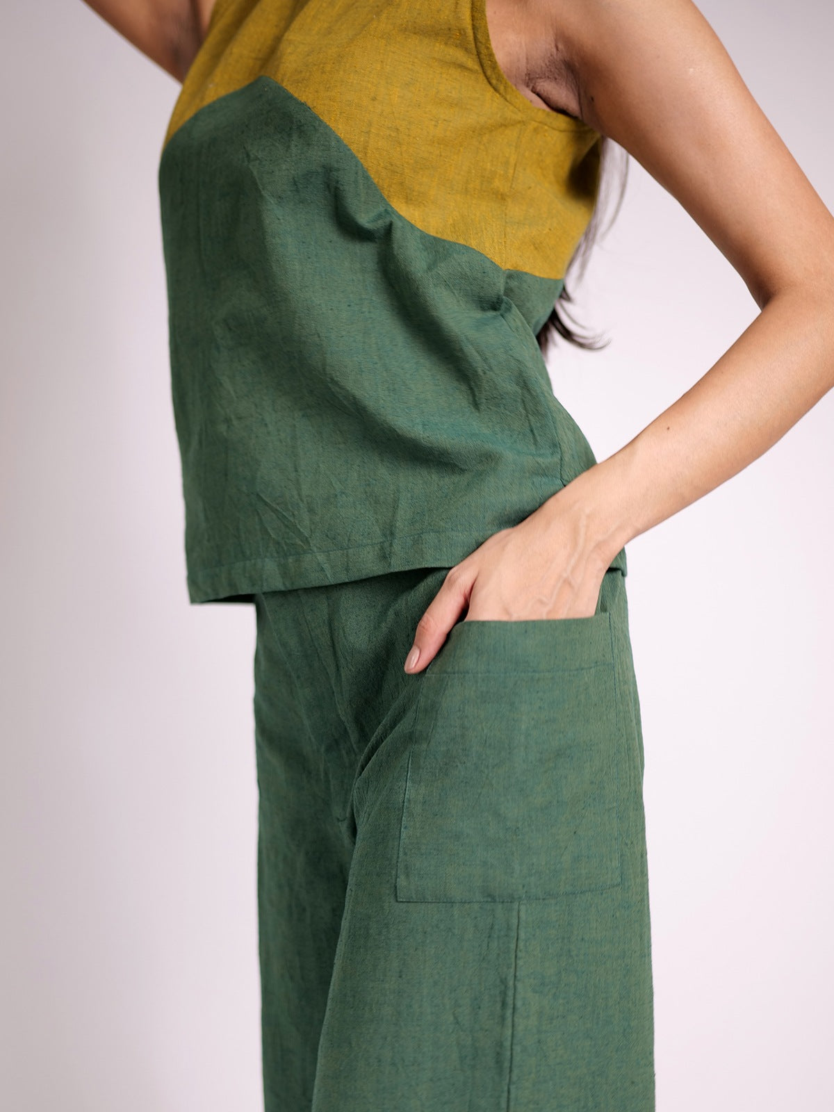 The sleeveless top showcases a high round neckline, lending a clean and structured look. It includes a subtle back closure with a loop button for easy wear, while the relaxed fit ensures freedom of movement without compromising style. The highwaisted wideleg pants provide a flattering, elongating effect, complemented by functional side pockets for added practicality. This outfit features a bold, geometric, colourblocked design in earthy tones of mustard yellow, and deep green. The striking yet understated palette adds a contemporary twist to a classic silhouette. Made from breathable, pure cotton fabric, the set offers both comfort and sustainability, making it an excellent choice for warm weather with its lightweight and airy texture.
