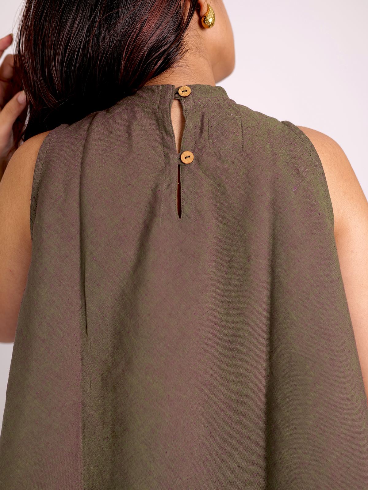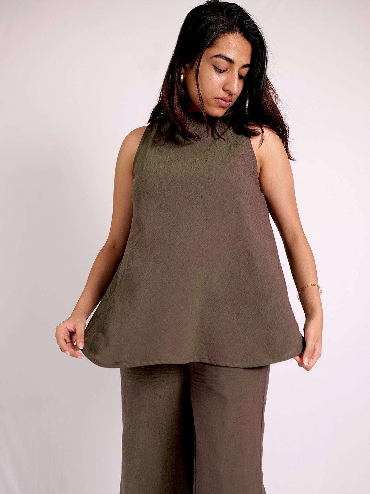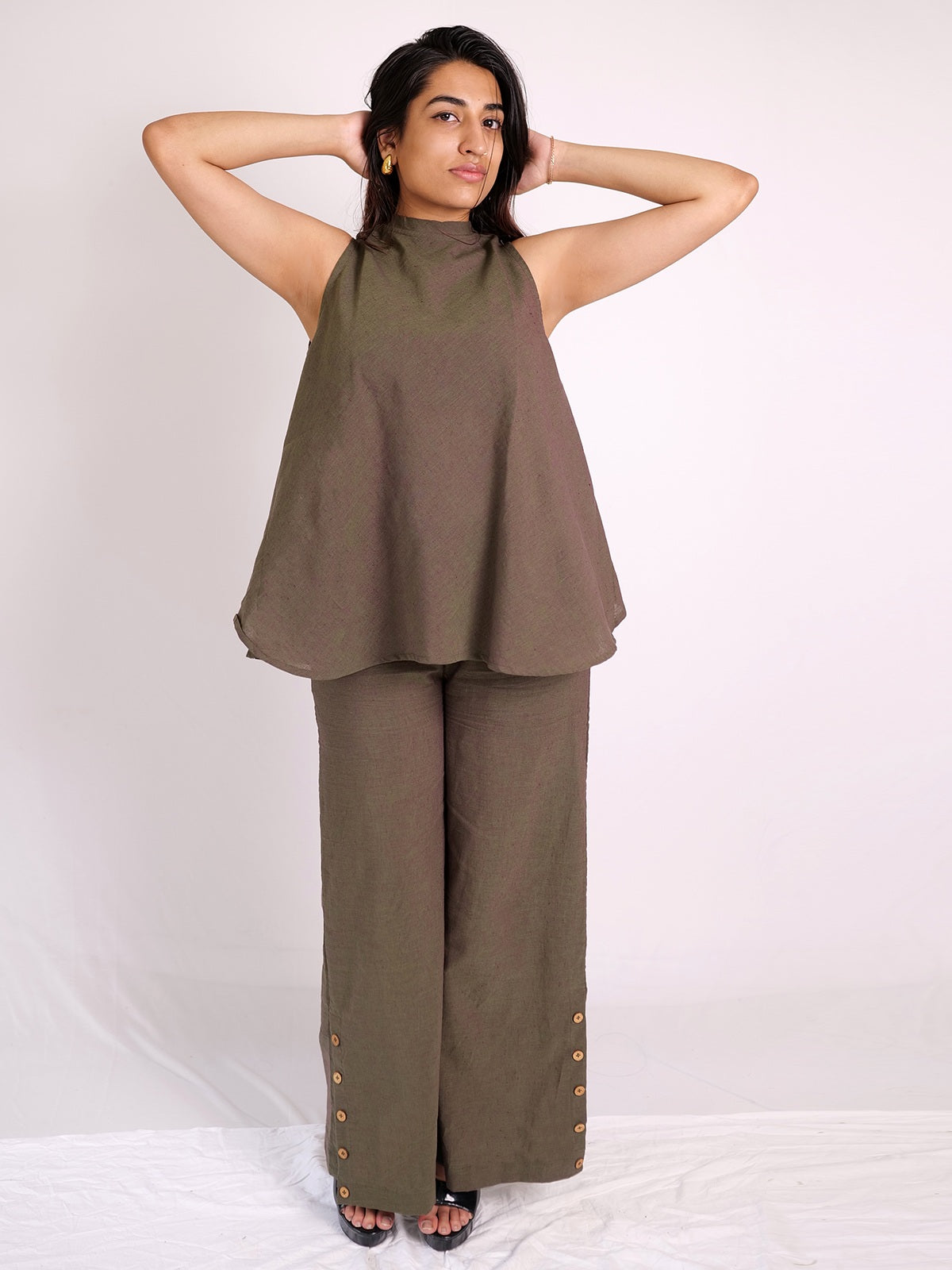 This stylish set features a sleeveless Aline top with a relaxed fit and a high, structured neckline for a clean and modern look. The back of the top is adorned with elegant wooden buttons, adding a touch of rustic charm. Its flowy hem creates a soft, feminine silhouette, allowing for effortless movement. Paired with flair pants, the ensemble exudes effortless elegance. The pants feature a unique slit detail that can be buttoned up, allowing for versatile styling and a touch of personalised flair. Crafted in an earthy tone, this outfit exudes a natural and neutral vibe. The breathable, flowy fabric enhances comfort and style, making this set perfect for casual and semiformal events.