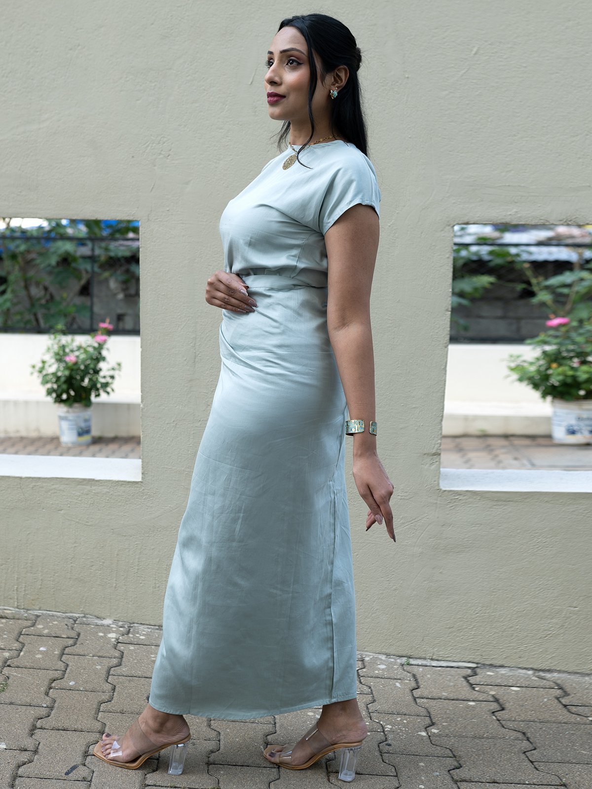 A chic twopiece set featuring a wraparound skirt and a structured top in a jade blue hue. The skirt is a wrap design that can be draped around the body which enhances movement and flatters the form, making it a versatile piece. A discreet shoulder zipper lends an unexpected edge while ensuring ease of wear. Subtle beach waves hand embroidery on the back of the top adds a unique, artisanal touch inspired from the elements of nature. The soft cotton fabric drapes gracefully, offering both comfort and sophistication and ideal for both day and evening wear, effortlessly blending tradition with contemporary style.