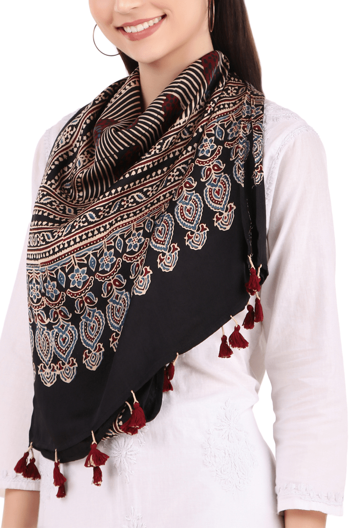 Block printed Modal Stole Flower Black