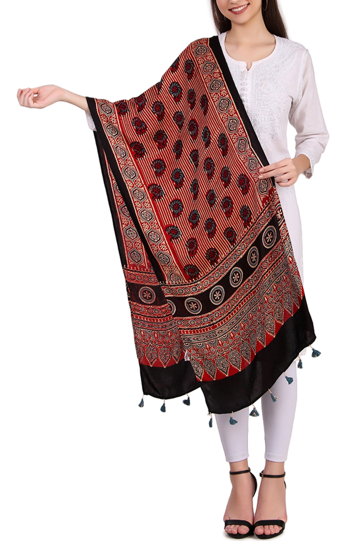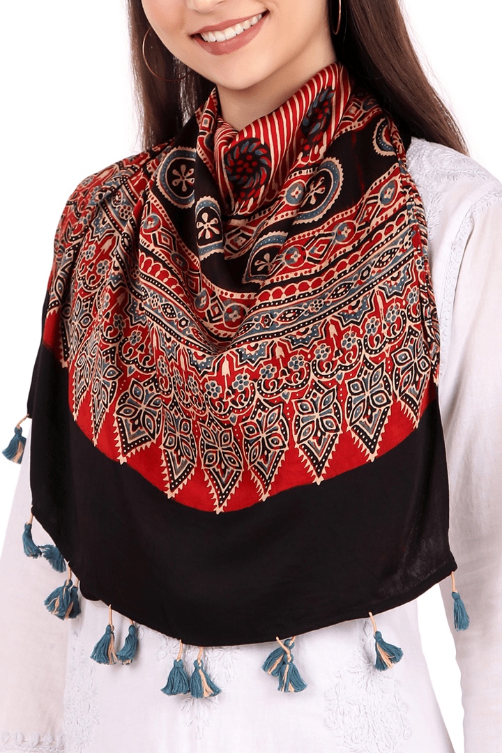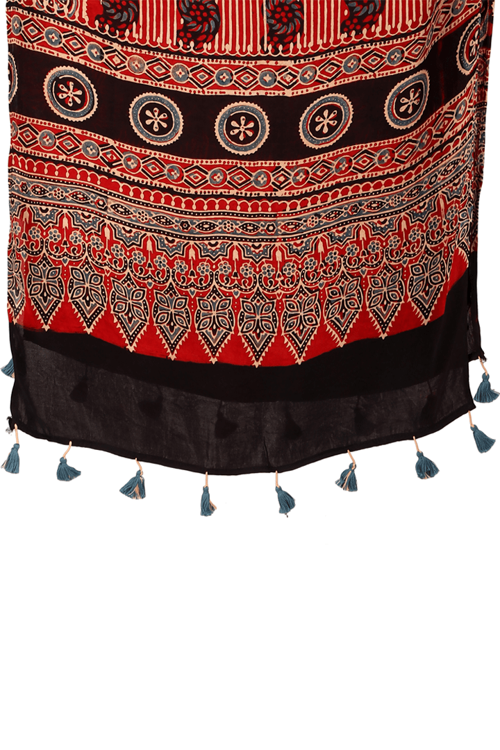 Introducing our exquisite collection of Ajrakh block-printed stole, a true celebration of traditional artistry and vibrant craftsmanship from the Khtaris of Kutch, Gujarat.