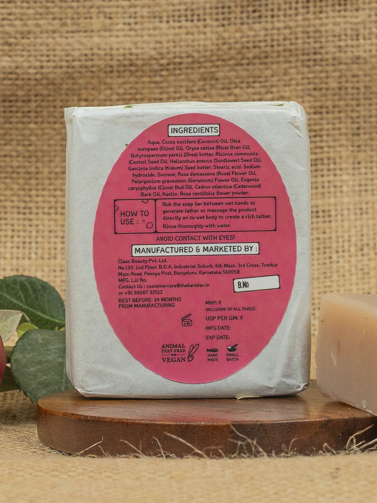 - Key Ingredients : Aqua, Cocos nucifera (Coconut) oil, Olea europaea (olive) oil, Oryza sativa (Rice) bran oil, Butyrospermum parkii (Shea) butter, Ricinus communis (Castor) seed oil, Helianthus annuus (Sunflower) seed oil, Garcinia indica (Kokum) Seedbutter, Stearic acid, Sodium hydroxide, Sucrose, Rosa damascena (Rose) flower oil, Pelargonium graveolens (Geranium) flower oil, Eugenia caryophyllus (Clove) Bud oil, Cedrus atlantica (Cedarwood) bark oil, Kaolin, Rosa centifolia flower powder.
