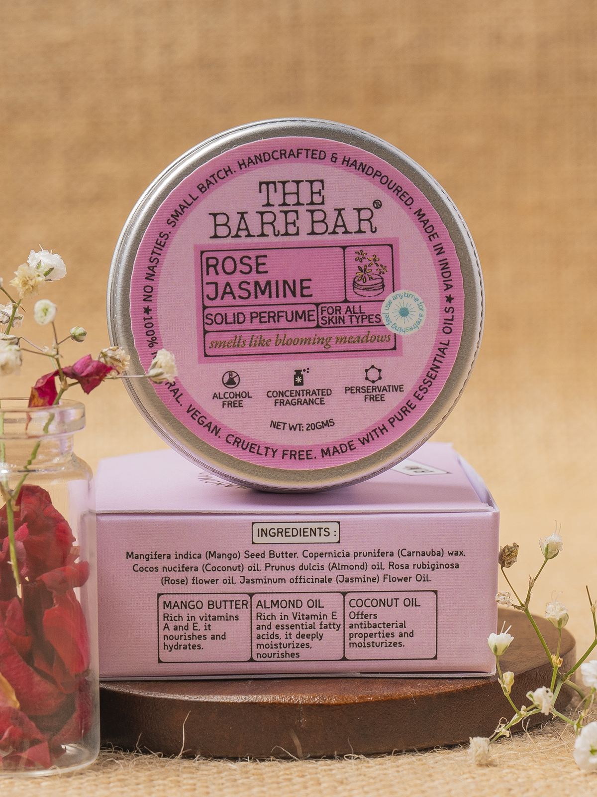 - Key Ingredients : Mangifera indica (Mango) Seed Butter, Copernicia prunifera (Carnauba) wax, Cocos nucifera (Coconut) oil, Prunus dulcis (Almond) oil, Rosa rubiginosa (Rose) Flower oil, Jasminum officinale (Jasmine) Flower Oil.
