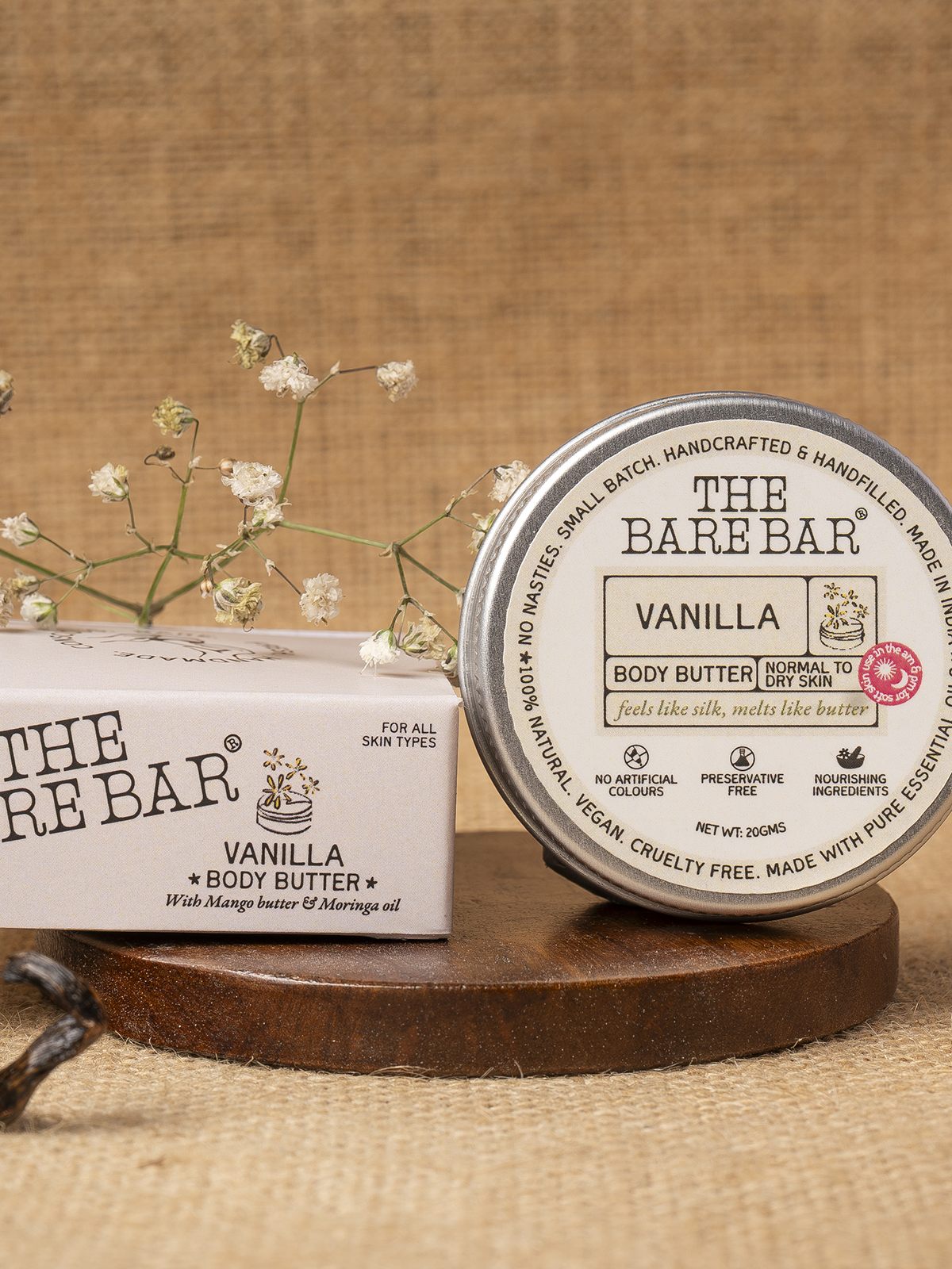 Indulge in the ultimate skin nourishment with The Bare Bar Body Butter. This luxurious blend of mango butter, moringa oil, coconut oil, and shea butter deeply hydrates and revitalizes your skin, leaving it soft, smooth, and glowing while enveloping you in a delicate, captivating fragrance.