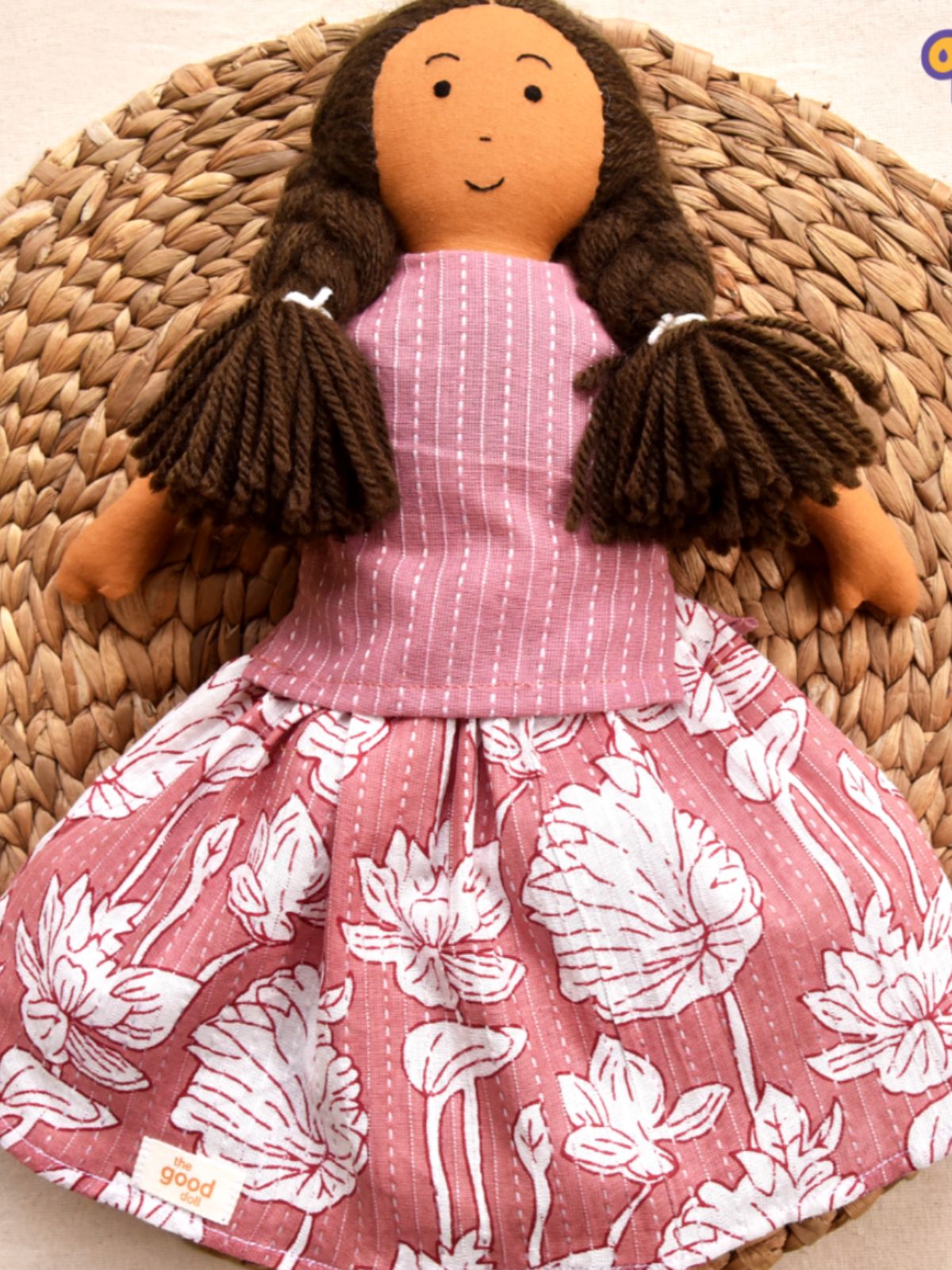 Nilah is a handcrafted fabric doll inspired by the mystical Blue Mountains of South India. This thoughtfully designed companion features a classic pink skirt and blouse set with interchangeable garments and styleable hair. Both the doll and her clothing are fully washable and durable, with minor wear easily repaired at home. Body-positive and color-inclusive, Nilah embodies the spirit of her namesake—fierce yet gentle. Arrives beautifully packaged in an eco-conscious gift box, making her an ideal present for those seeking meaningful, sustainable play companions.