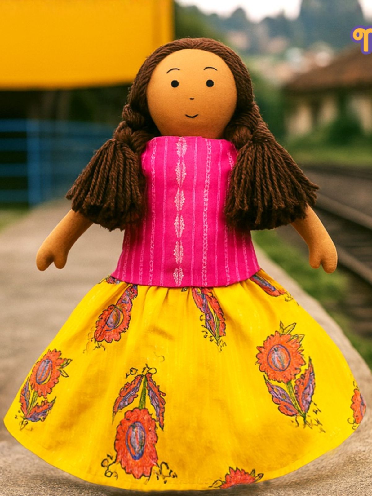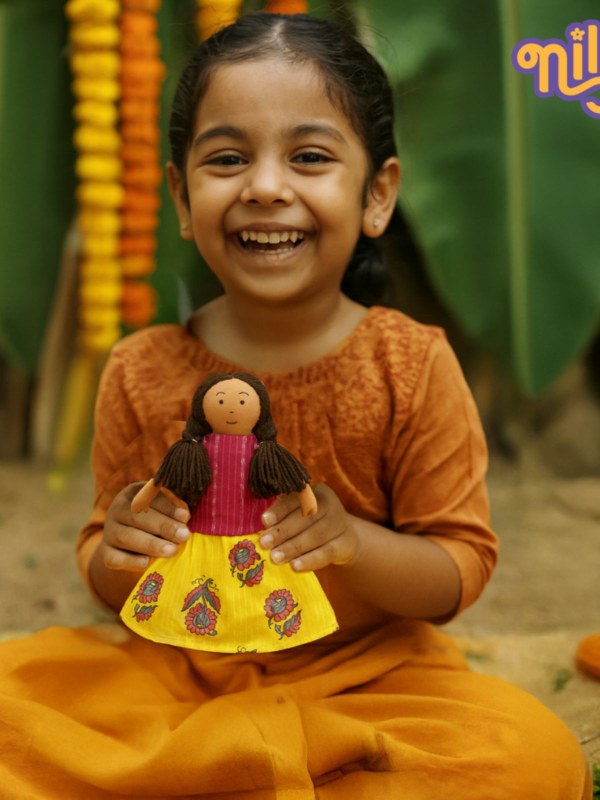 Nilah is a handcrafted fabric doll inspired by the mystical Blue Mountains of South India. This thoughtfully designed companion features a classic yellow skirt and blouse set with interchangeable garments and styleable hair. Both the doll and her clothing are fully washable and durable, with minor wear easily repaired at home. Body-positive and color-inclusive, Nilah embodies the spirit of her namesake—a fierce yet gentle young woman from the Nilgiris. Arrives beautifully packaged in an eco-conscious gift box, making it an ideal present for those who appreciate meaningful, sustainable toys with rich storytelling.