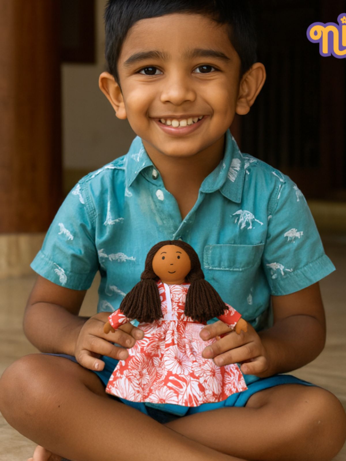 Meet Nilah, a thoughtfully crafted fabric doll celebrating the biodiversity of India's Western Ghats. This handmade companion features a coordinated dress and jacket set with interchangeable garments and styleable hair, allowing endless creative play. Constructed from quality materials, both doll and clothing are fully washable and designed for longevity—minor wear can be easily repaired at home. The inclusive design embraces body positivity and celebrates diverse representation. Presented in eco-conscious gift packaging, Nilah makes a meaningful present that encourages imaginative play while fostering appreciation for nature and cultural heritage.