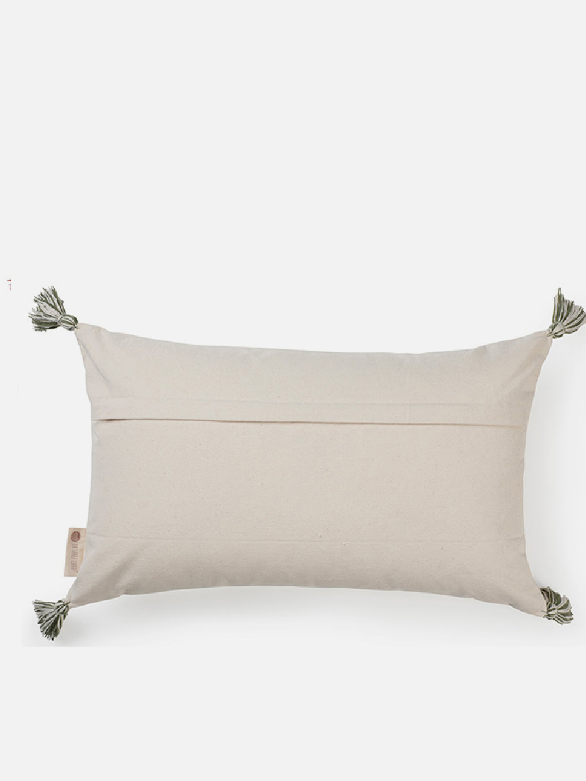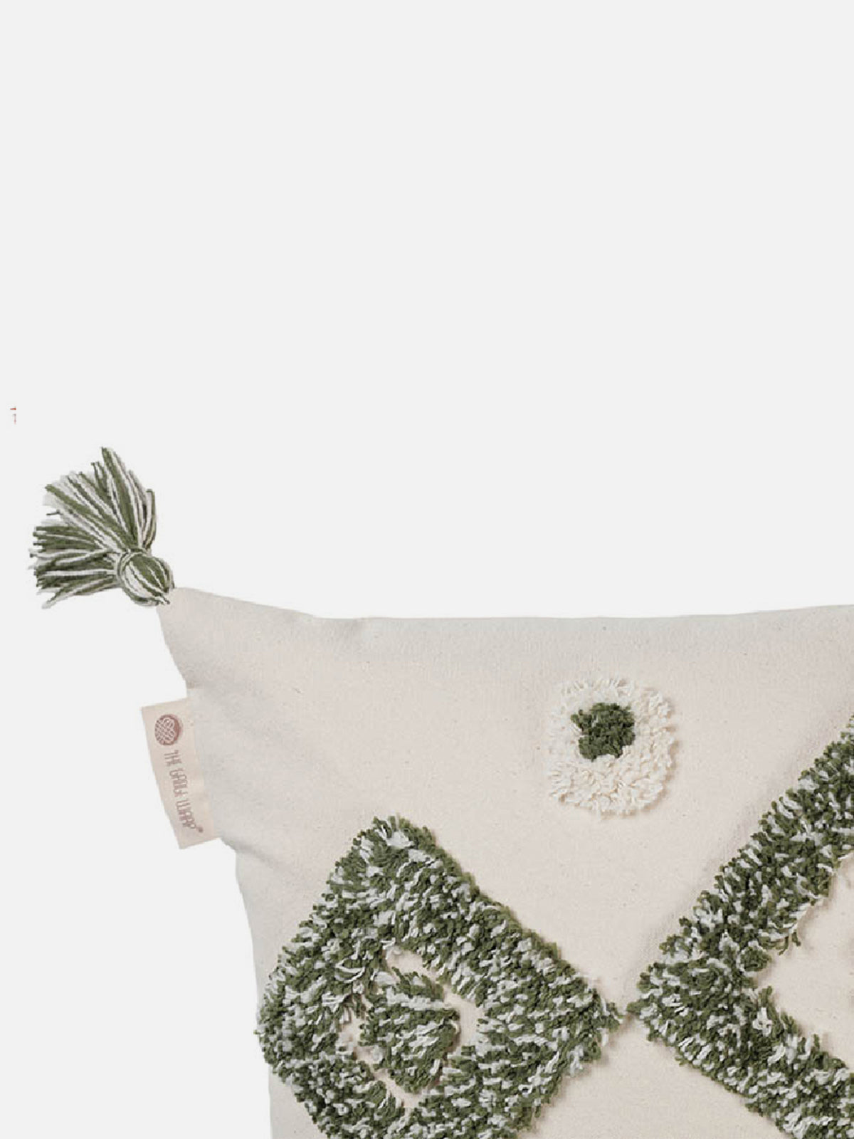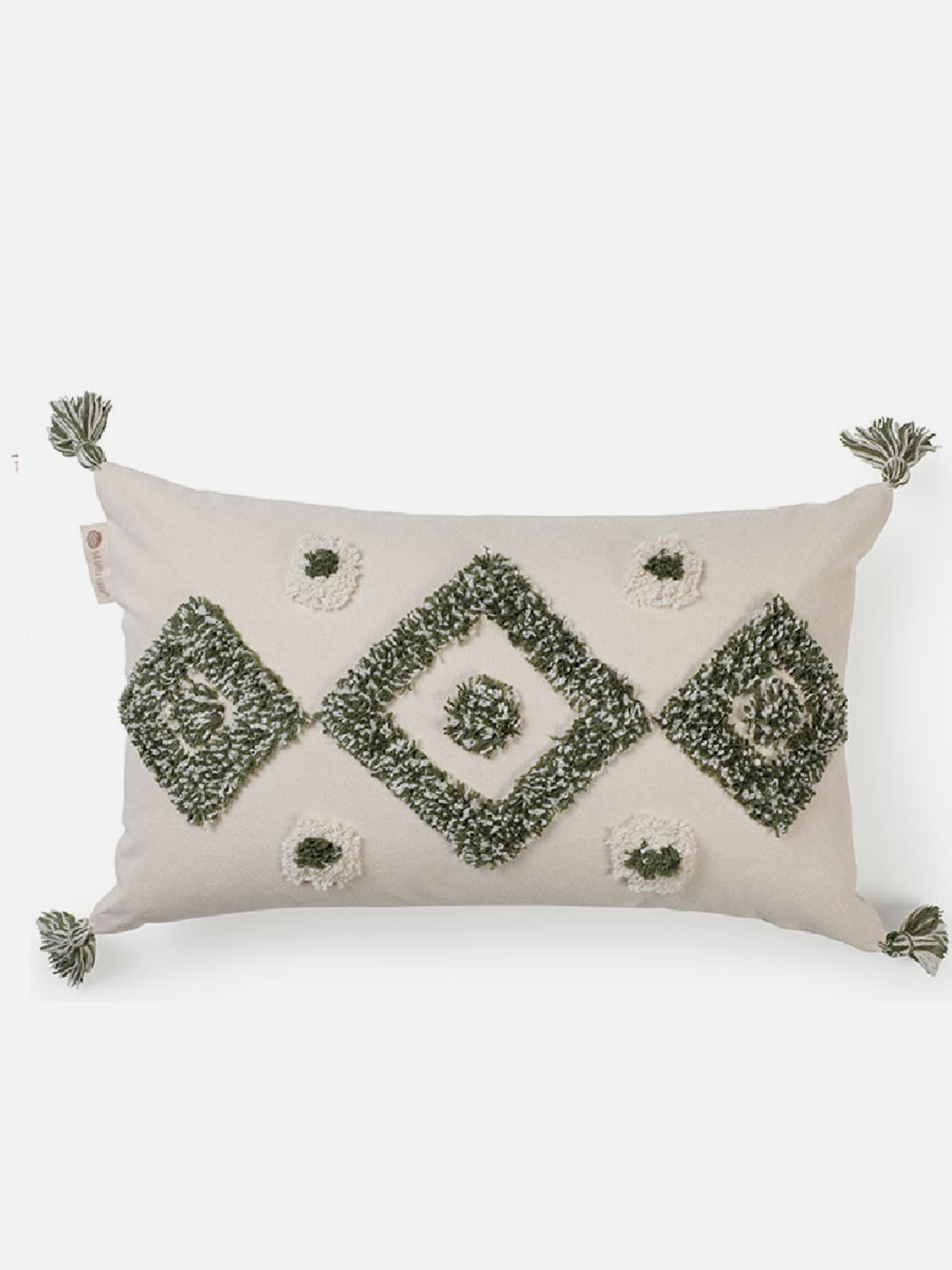 Textural throw pillow featuring shag tufting in geometric diamond pattern on natural fabric with melange effect and tassels on corners.
