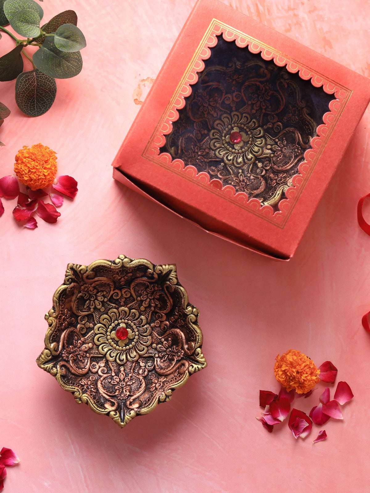 Celebrate tradition with this Panchmukhi-inspired terracotta diya set. Handcrafted with care, each piece emits a luminous glow, ideal for altars, festivals, or cozy evenings. Sustainable and artisanal, this elegant set combines heritage artistry with functional design, creating a captivating focal point for your home.