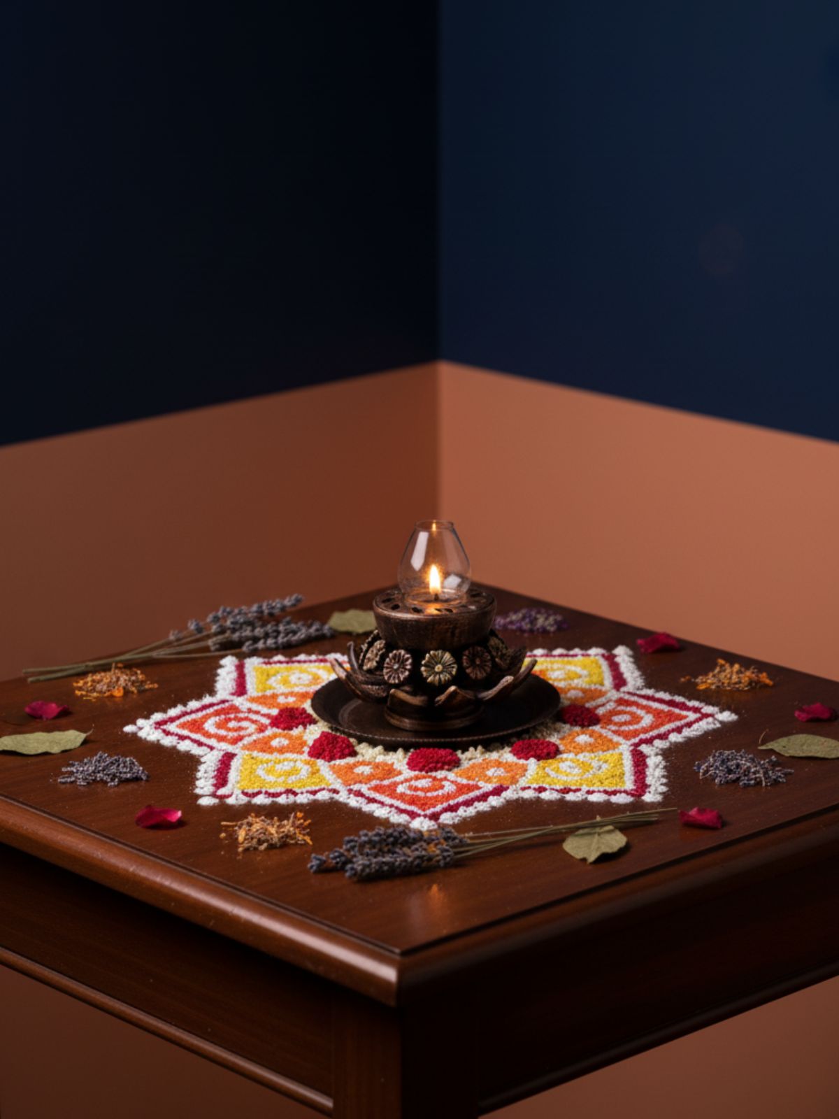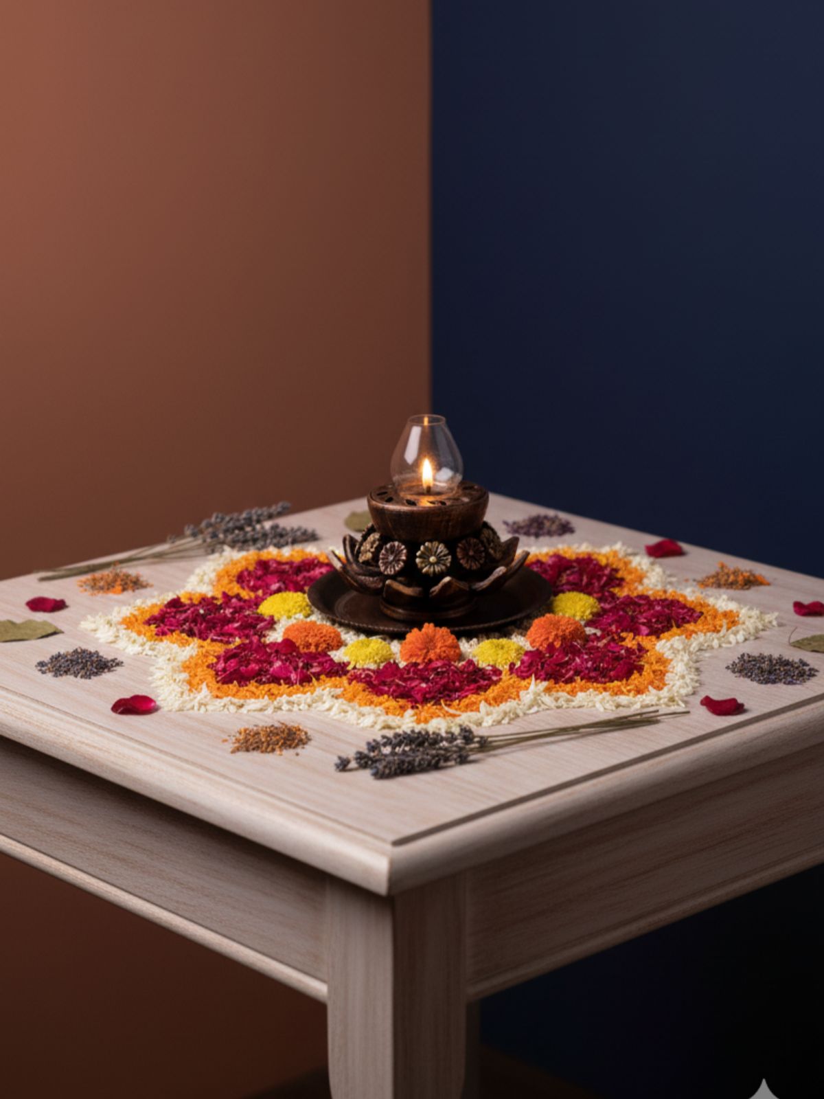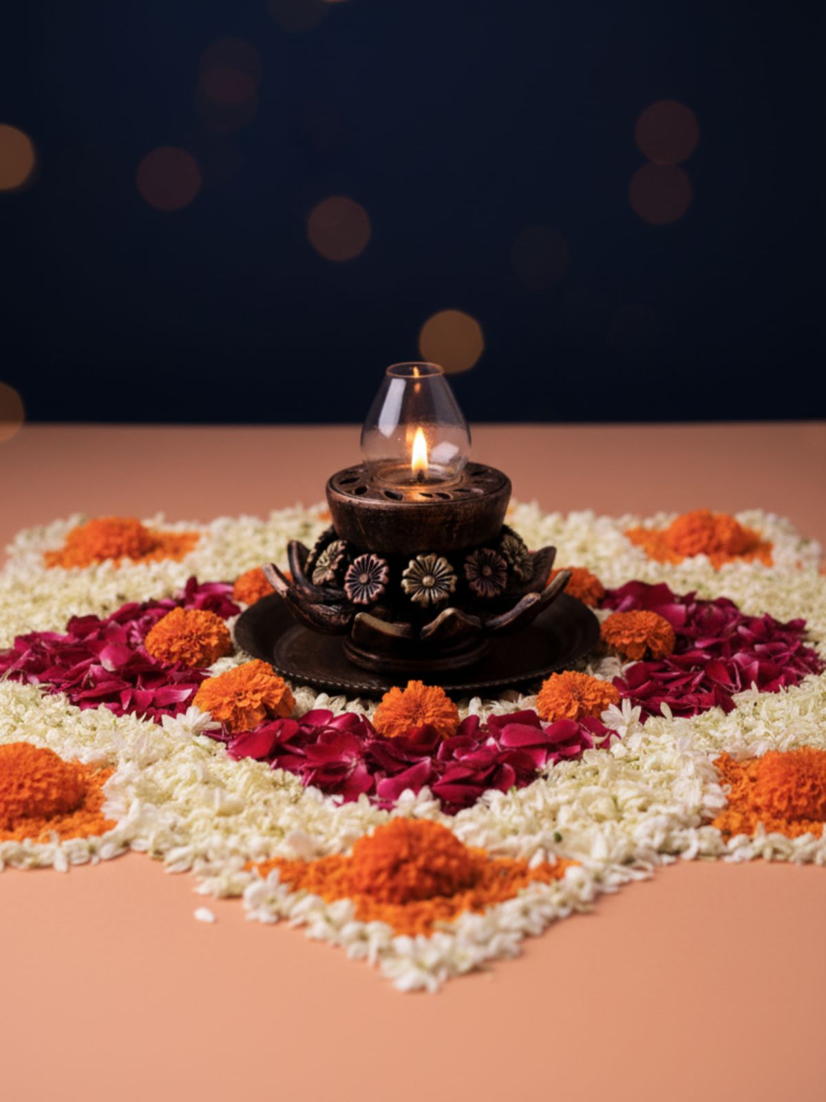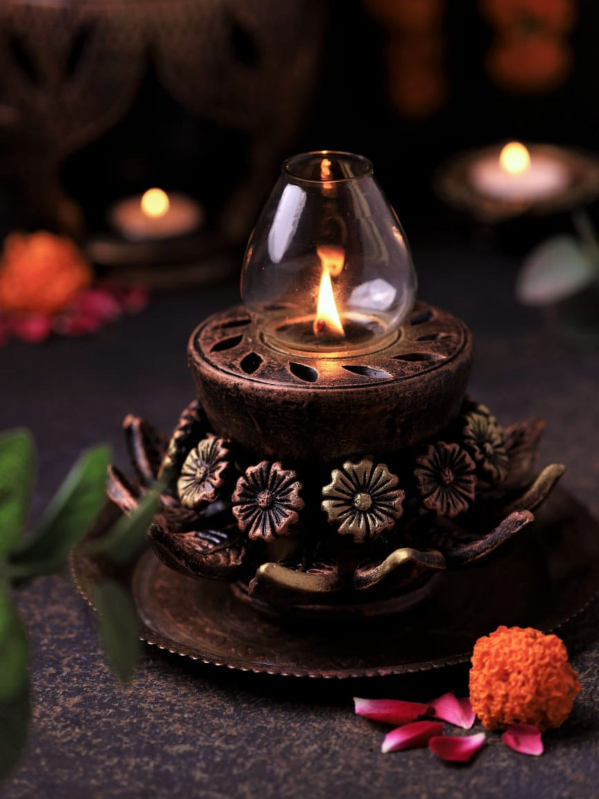 This exquisite terracotta Akhand Jyot is a beautiful fusion of natural motifs and traditional craftsmanship. The central flame is cradled within a round, earthy terracotta base, but the real artistry lies in its design. The lamp is a blooming lotus, with each of its petals meticulously handcrafted and painted in a stunning antique metallic bronze finish. This rich, lustrous hue lends the piece a timeless, weathered look, as if it were a cherished family heirloom.