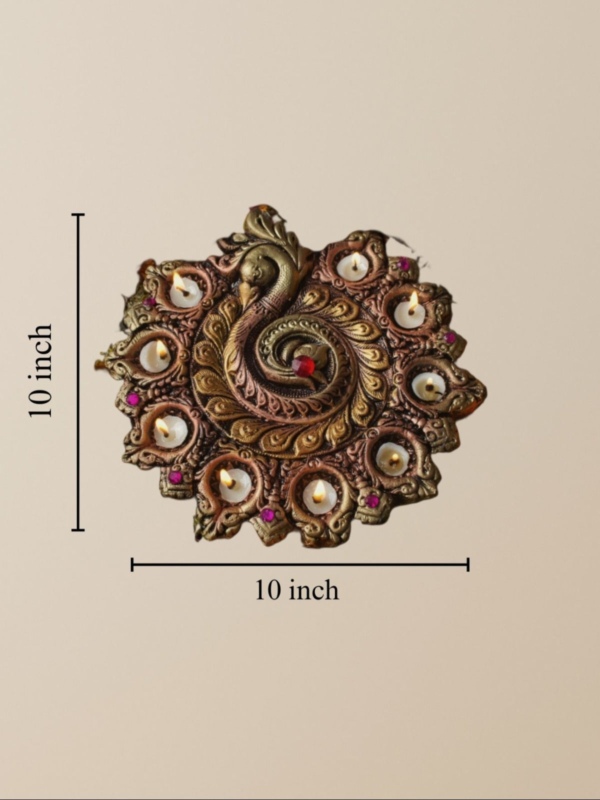 This 9-diya terracotta plate with peacock detailing is a symbol of artistry and elegance. Each diya placement radiates light beautifully, while the motif represents abundance and joy. Ideal for rituals or festive décor, it combines tradition and craftsmanship, adding charm and cultural depth to your sacred celebrations.