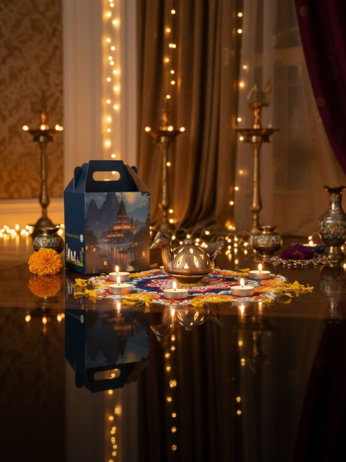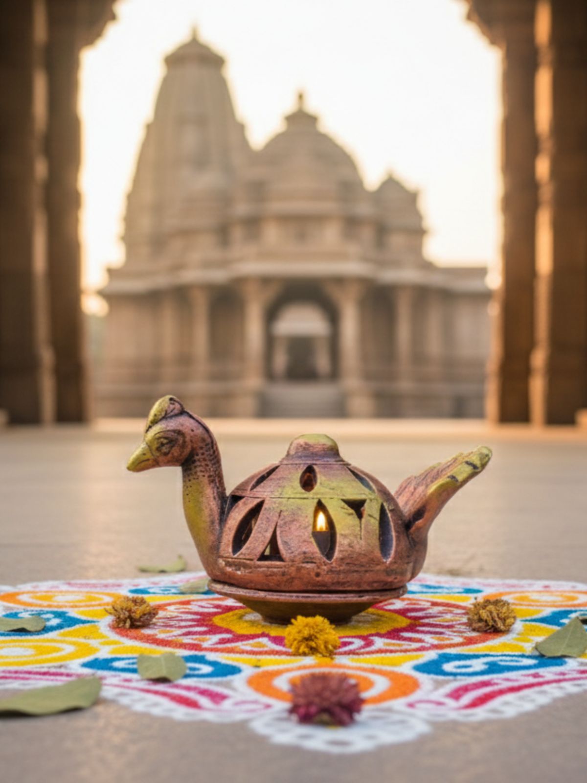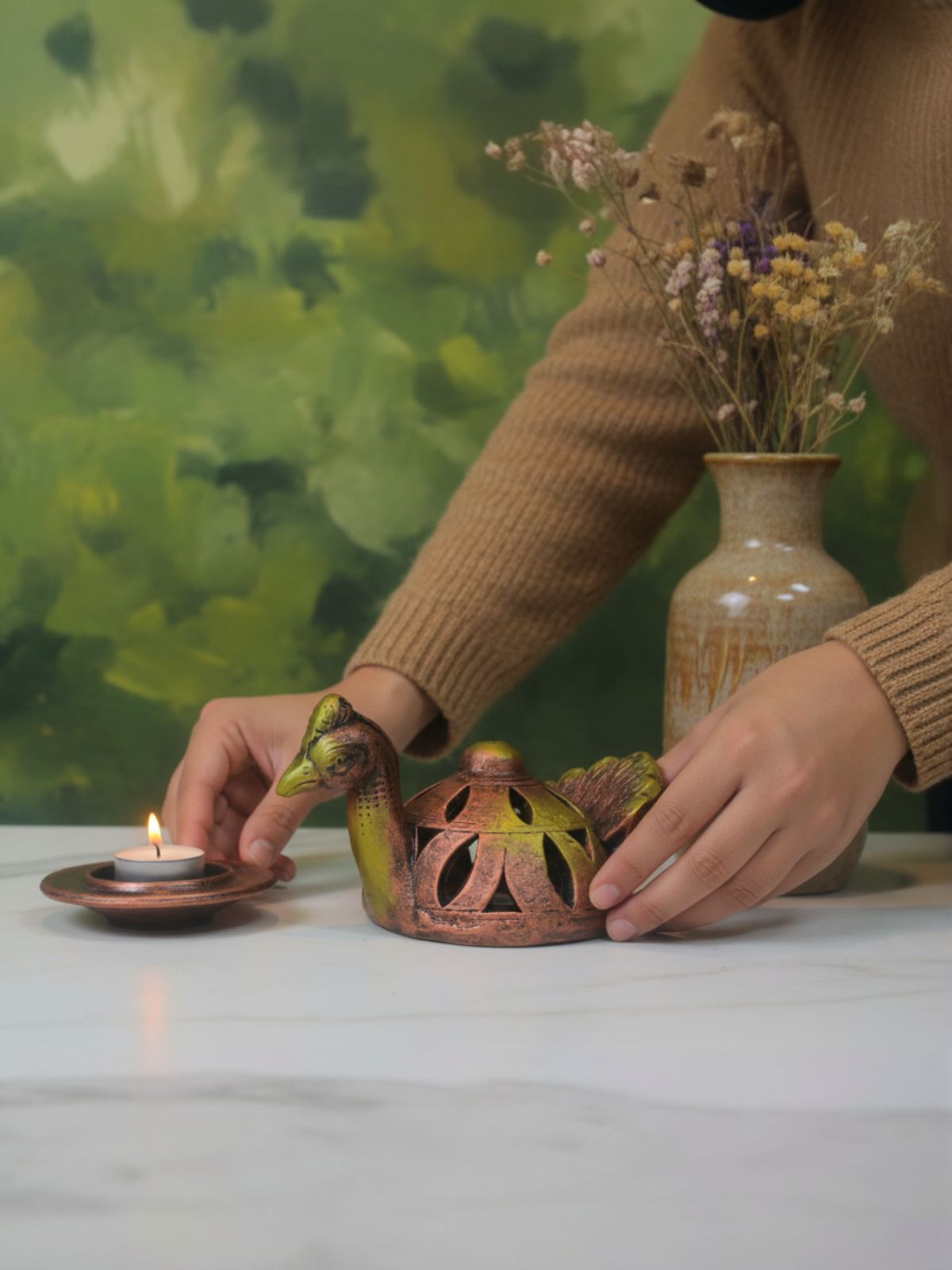 The lamp shade has an artistic Peacock Intricate design, symbolizing wisdom and prosperity, resembling Goddess Lakhmi Vahaan. The piece being held in hand is the upper cover of the lamp, designed to gently shield the flame while allowing the glow to spread warmly. Made of rustic, earthy-toned material, the lamp has a natural antique finish that enhances its traditional appeal. The combination of the glowing diya, earthy textures, and floral décor makes this lamp perfect for puja rituals, home décor, or festive celebrations like Diwali. this table shade lamp is not just a light source but also a symbol of positivity, tradition, and divine blessings