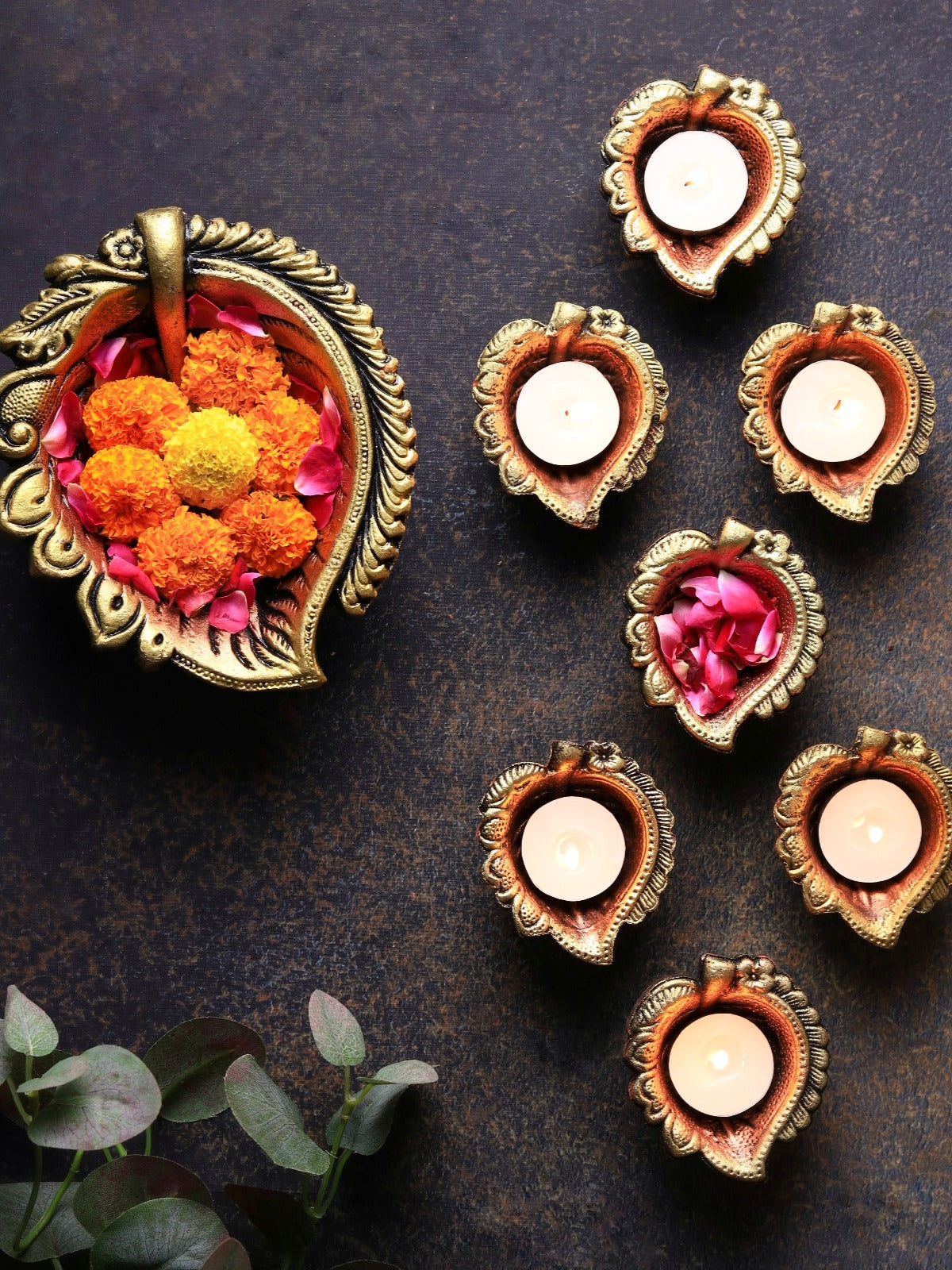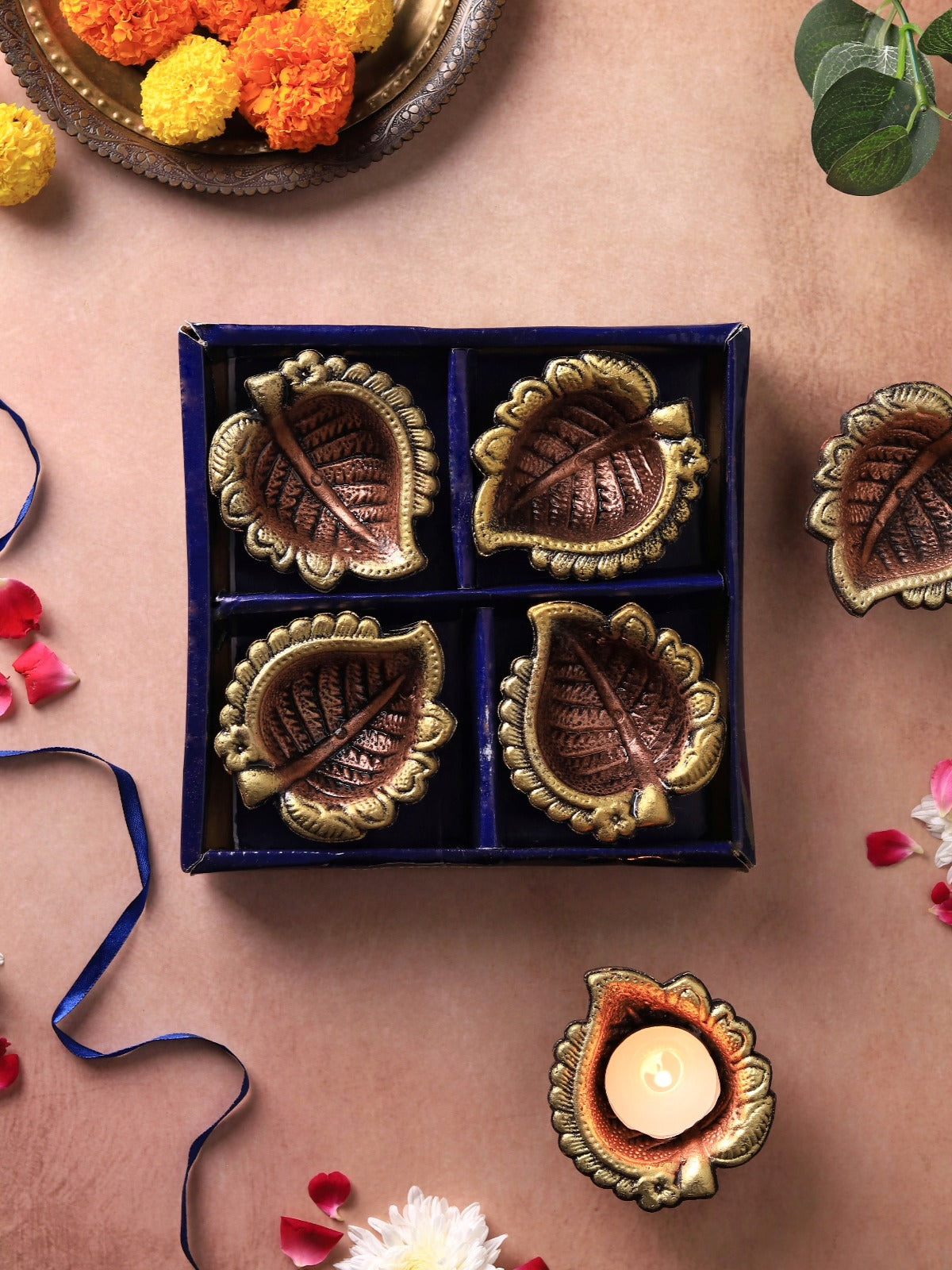 Illuminate your celebrations with this handcrafted Peepal-inspired terracotta diya set. Each piece is delicately designed to bring warmth and charm, creating a captivating centerpiece for festivals or special occasions. Sustainable, artisanal, and timeless, it enhances your décor with elegance, tradition, and a radiant, inviting glow.