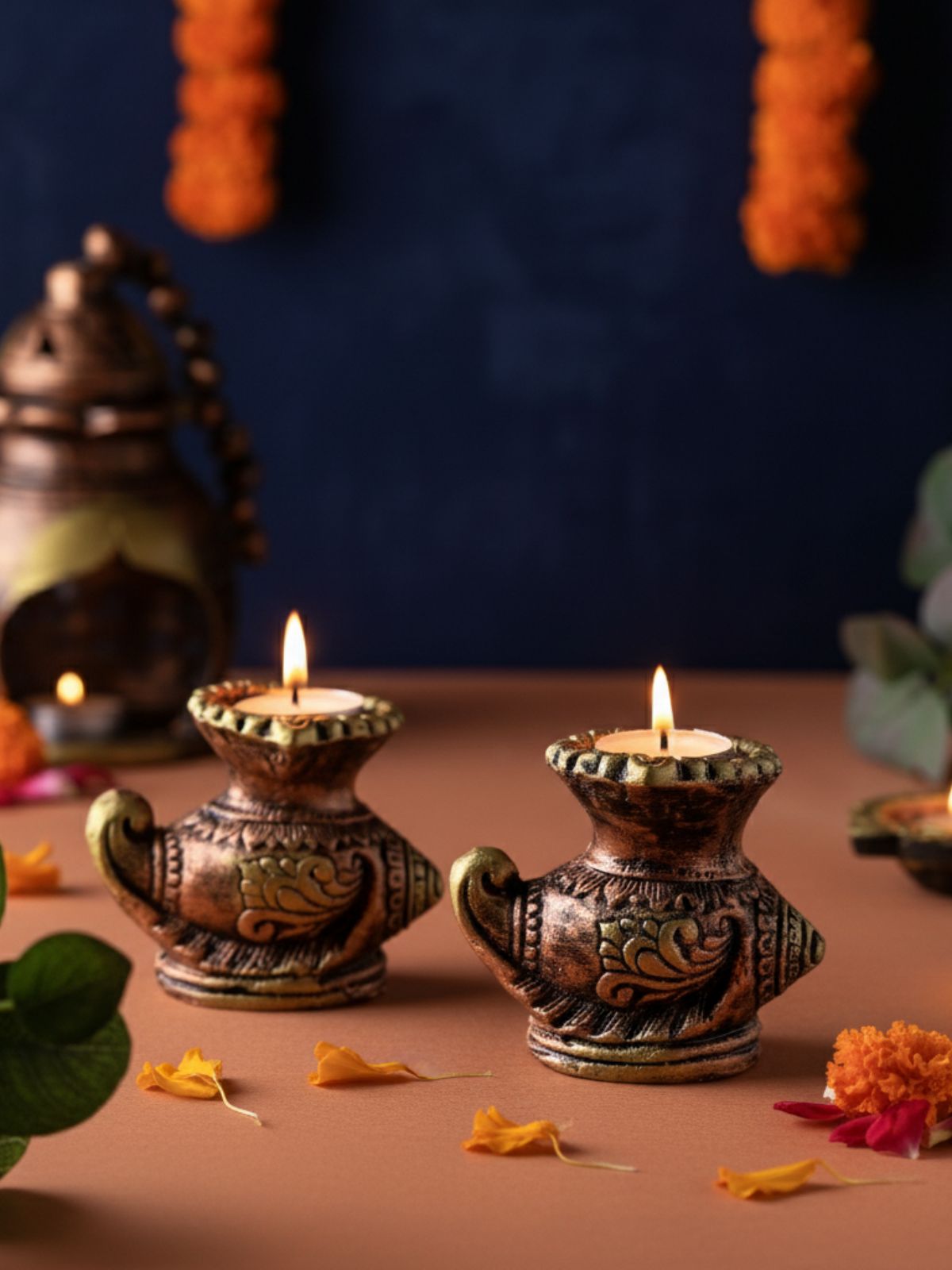 Crafted from humble earth, the clay diya is more than just a lamp; it is a timeless symbol of light, hope, and festivity.When a flame is introduced, the diya truly comes alive. The flickering light dances off the golden surface, creating a warm, radiant glow that is both inviting and luxurious. These antique metallic golden diyas are a perfect blend of rustic charm and opulent beauty, adding a touch of vintage glamour and festive cheer to any space. They are not merely lamps but stunning pieces of decor that symbolize prosperity, light, and culture