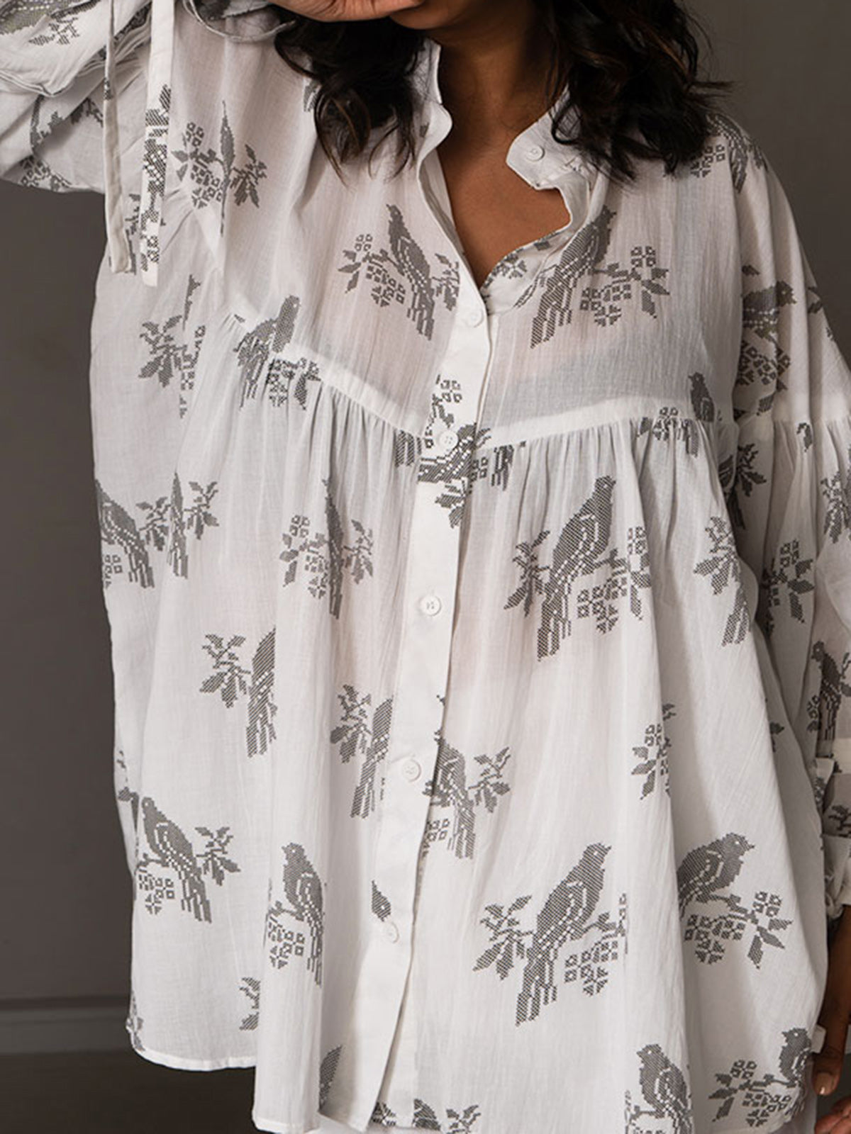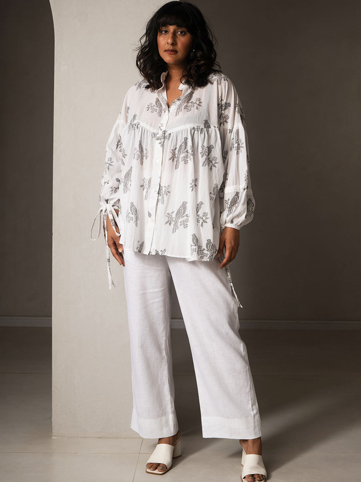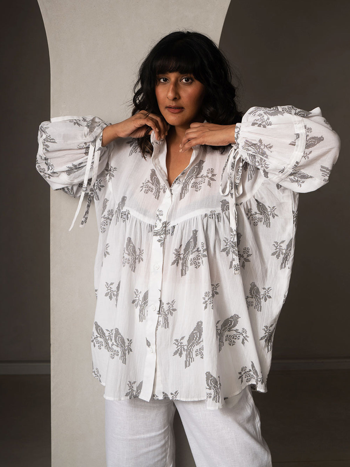 Elevate your wardrobe with our playful and stylish Avis Pleated Shirt in white. Made sustainably in India from cotton gauze fabric, this oversized shirt features a unique V neckline, puff sleeves, and delicate pleats, adding a fun and flirty touch to any outfit. Perfect for a chic, eco-conscious look.