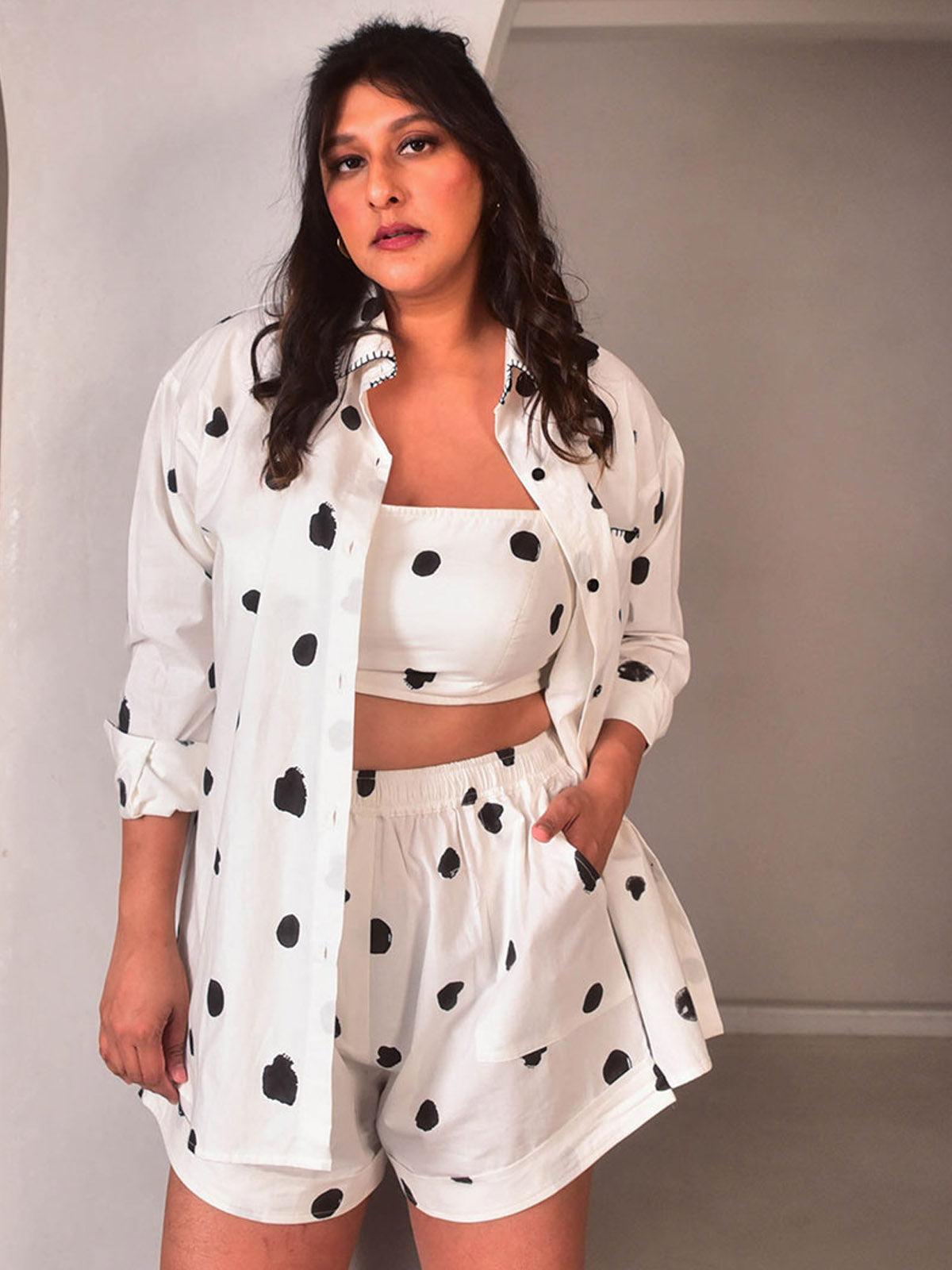 This chic printed bralette is made for road trips and beaches. Cut in our exclusive black and white polka hand-block printed cotton. Thin straps and an elasticated smocking back to fit comfortably. Pair with our Dottie Shorts for the co-ord look, and layer with our Dottie Shirt.