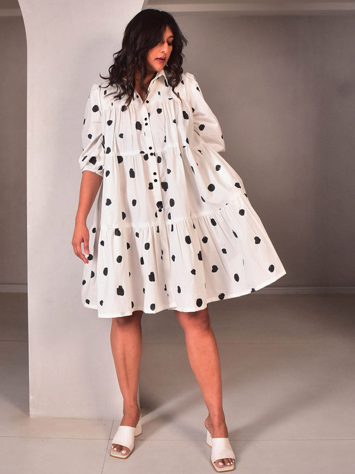 The lighthearted retro print meets a flouncy silhouette. Cut in our exclusive black and white polka hand-block printed cotton, this ruffled dress has shirt collars and a loose, ruffled bodice. Pintuck detailing at the neckline, long puffed sleeves and pockets. Pair with sneakers or pumps, this dress is effortless to style. Style it with our chic Jewellery for an effortless look.