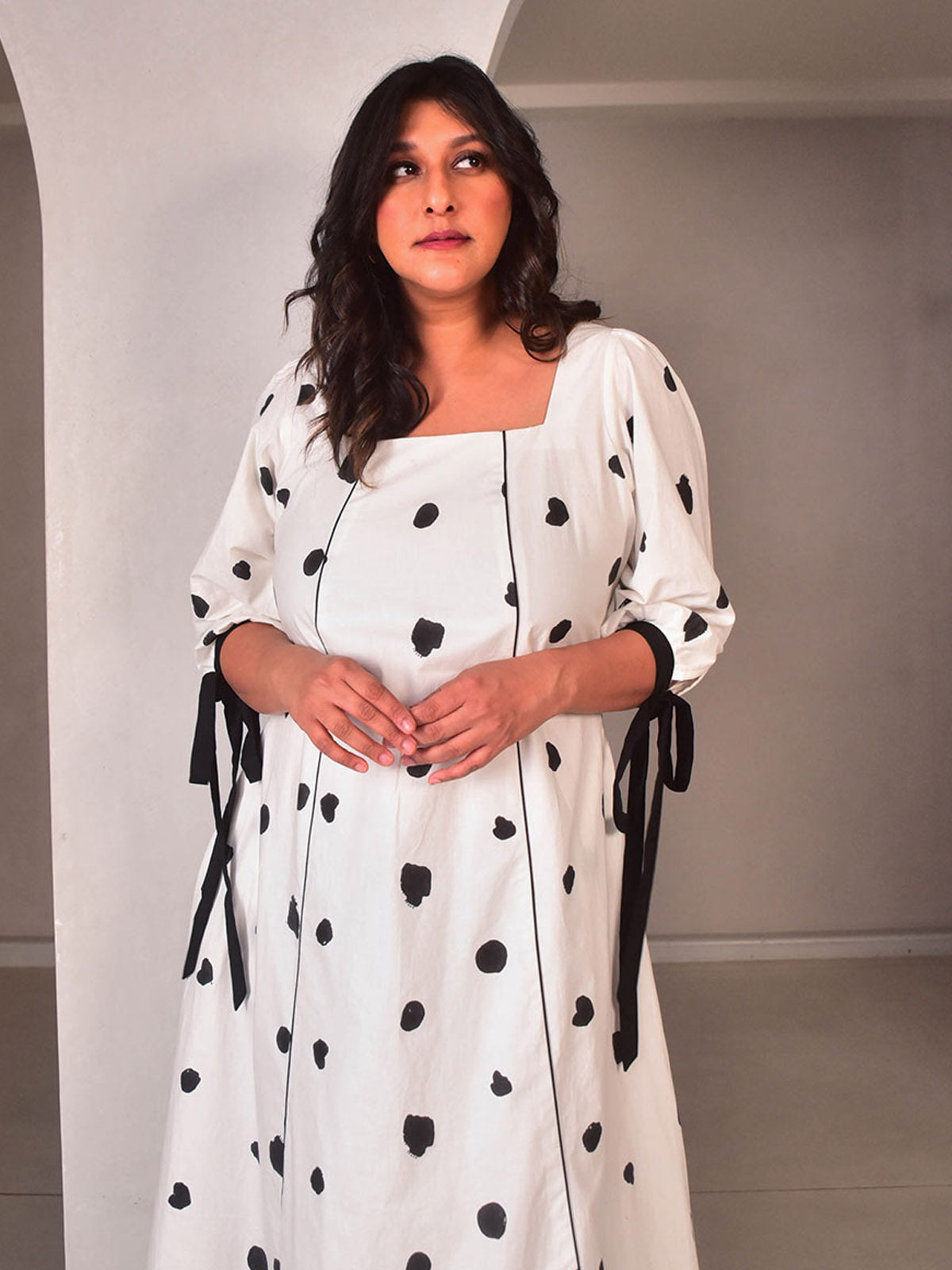 Crafted for slow mornings and long evenings. Cut in our exclusive black and white polka hand-block printed cotton, this dainty dress has three pannels and piping detailing, long sleeves and tie up cuffs for a lovely cinch.