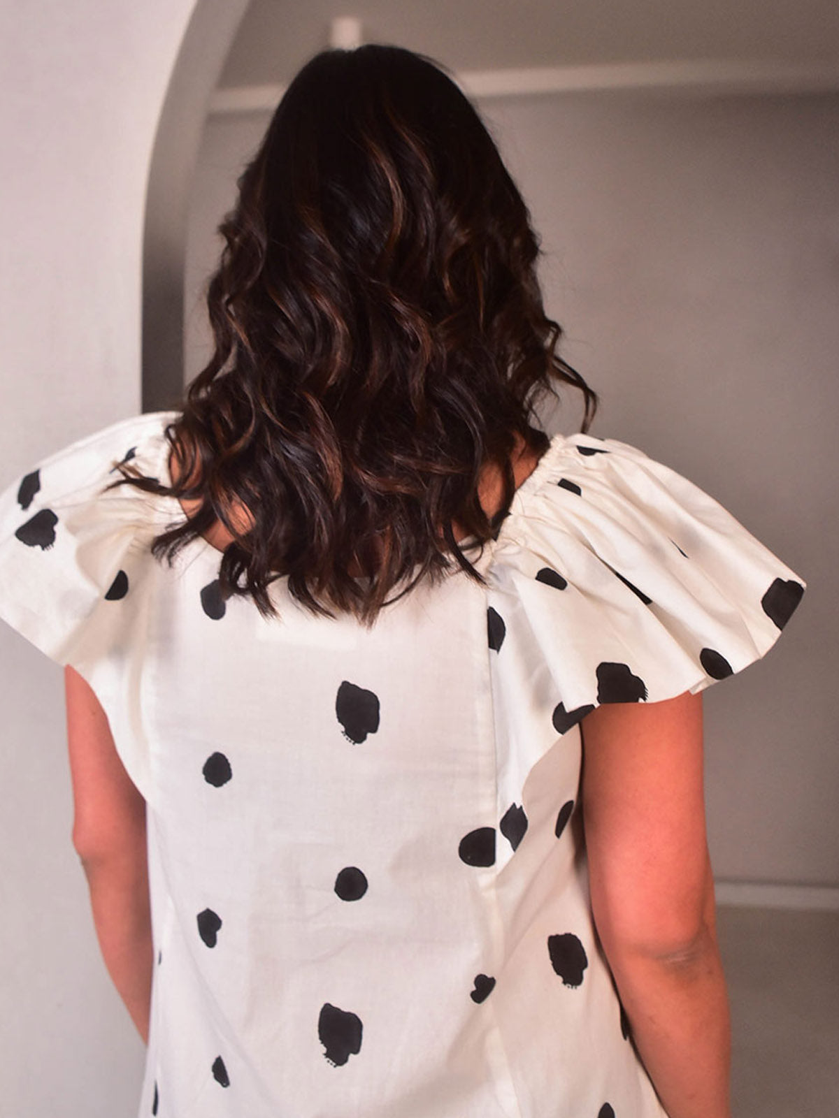 A dainty, chic dress for hosting brunches and dreamy vacations. Cut in our exclusive black and white polka hand-block printed cotton, this loose dress has cute pleated sleeves and long ruffles. Pair with heels for the perfect look.