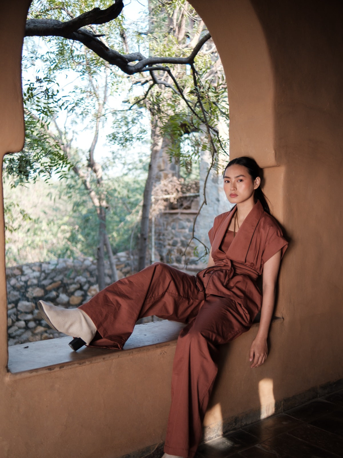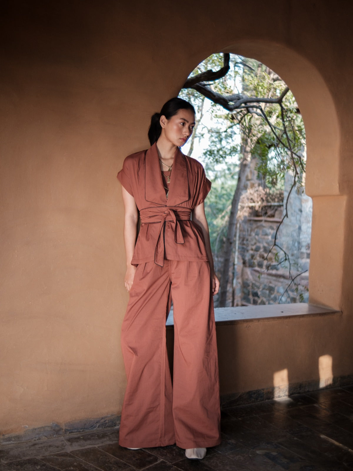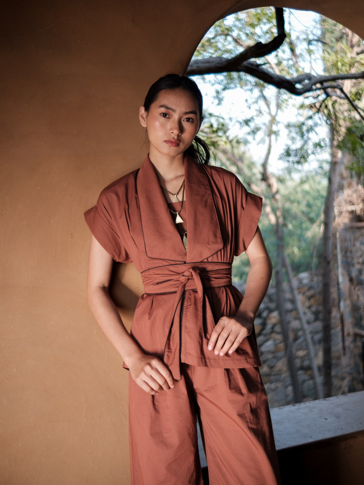 This Copper Berlin shawl collar summer jacket, accented with contrasting piping and a bold statement belt, enhances any ensemble with refined style. Its unique design ensures you stand out effortlessly, making it an essential piece for those seeking a sophisticated yet eye-catching addition to their wardrobe.