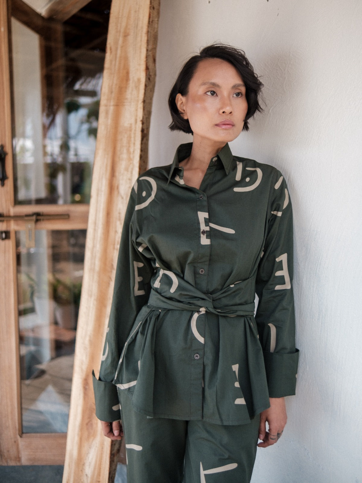 This Deep Green Line Printed Nara Front Knot Shirt features a stylish front knot detail that elevates a basic look into a refined statement. Designed with modern aesthetics and crafted for exceptional comfort, it combines elegance and ease, making it a versatile addition to your wardrobe for both casual and polished occasions.